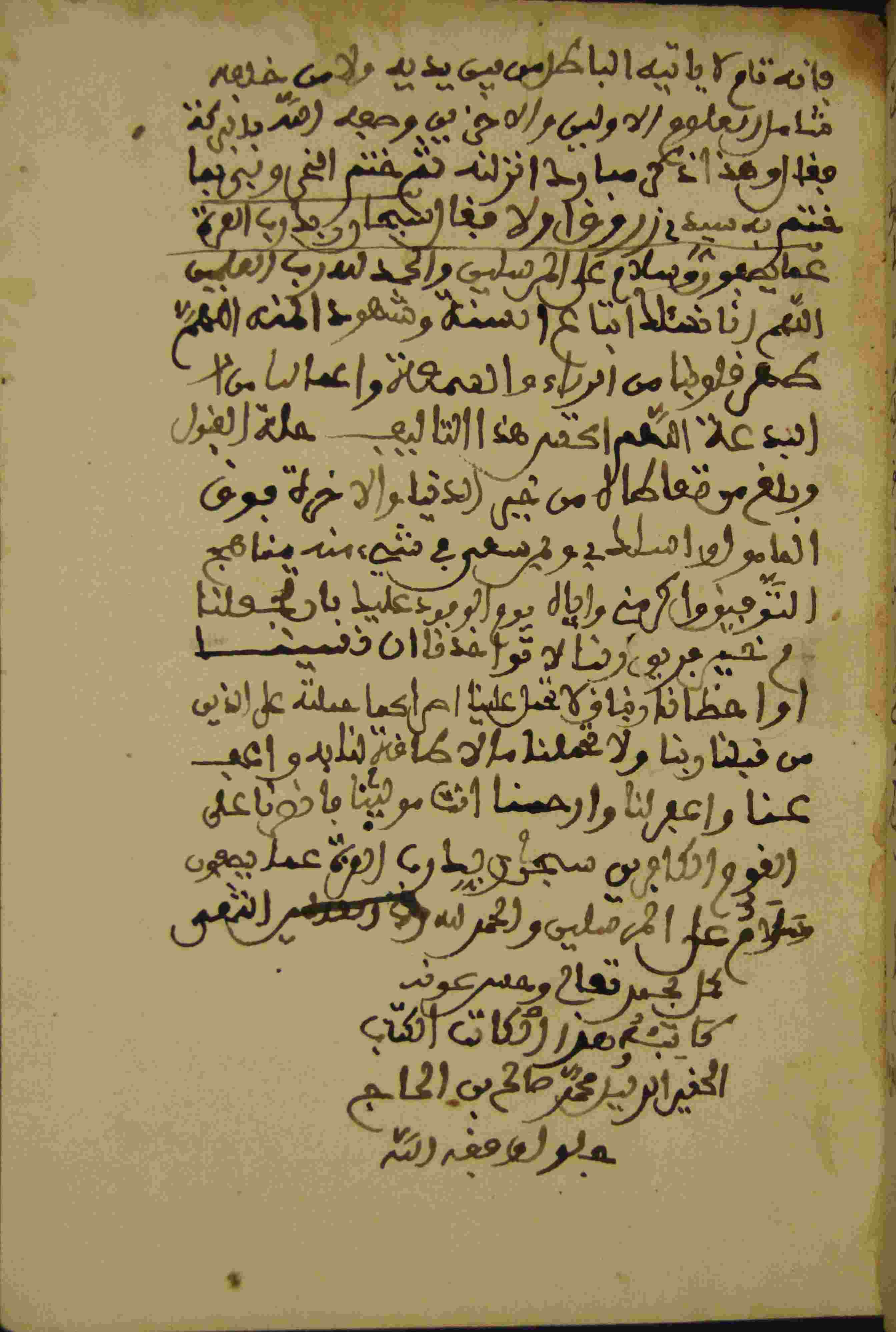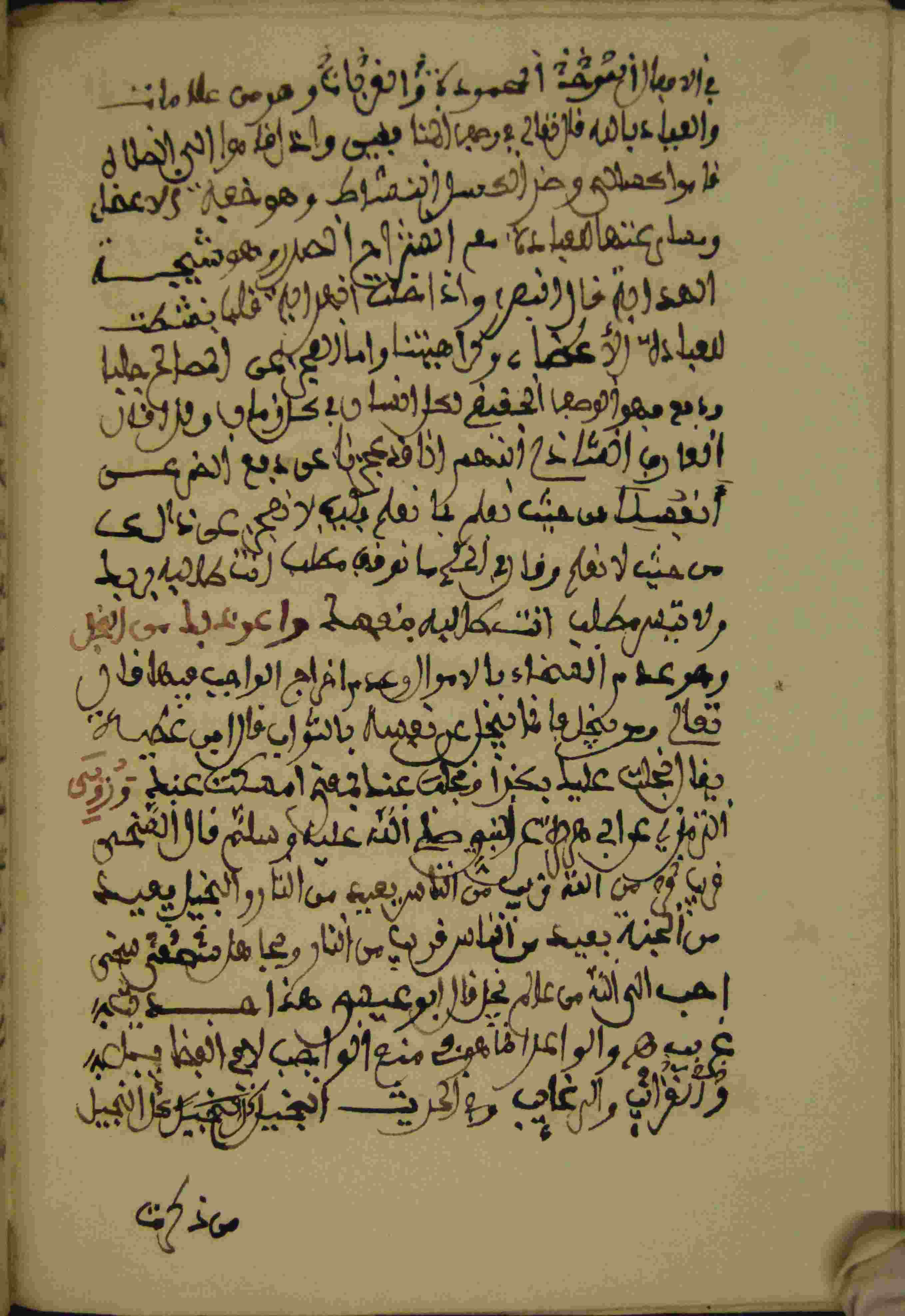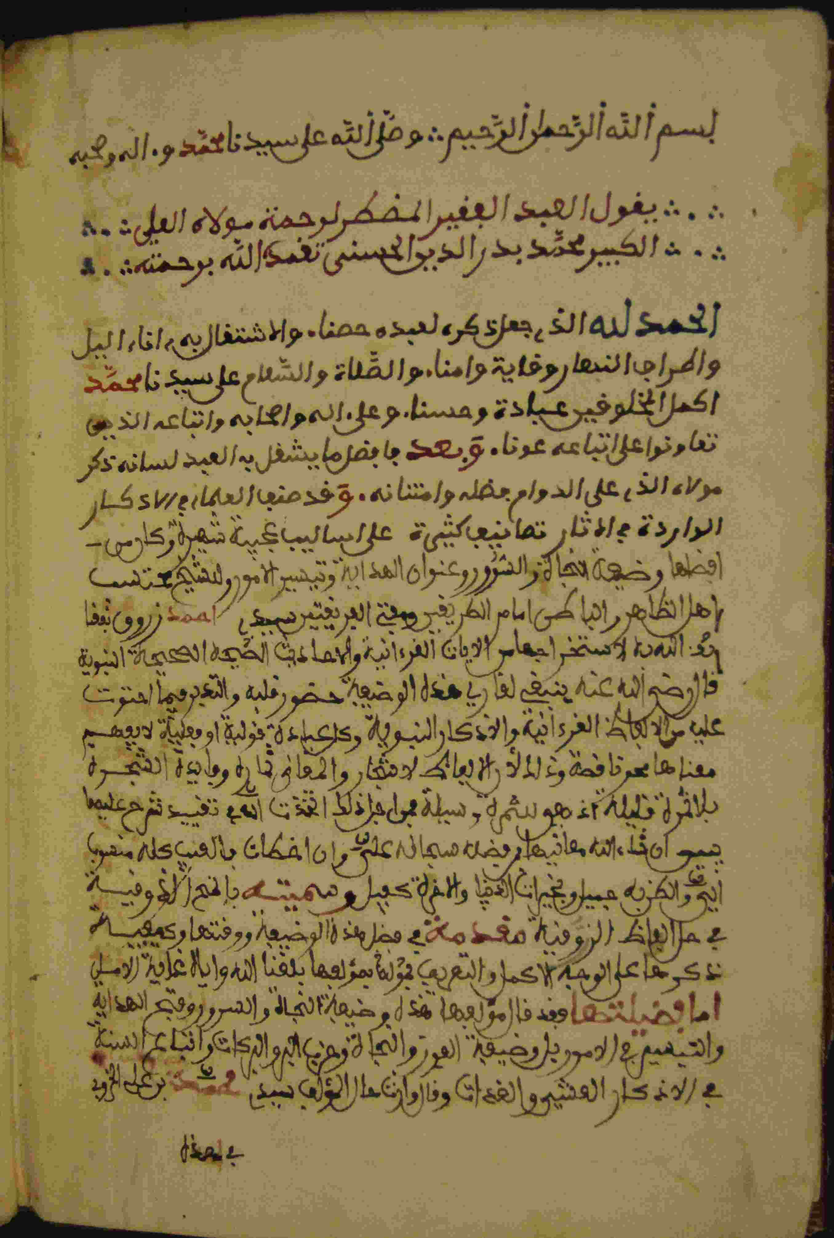 | Description: | أوله : " بعد البسملة والحمدلة، يقول العبد الفقير المضطر لرحمة مولاه العلي الكبير محمد بدر الدين الحسني تغمذ الله برحمته..."/ آخره : " ولا تحملنا ما لا طاقة لنا به واعف عنا واغفر لنا وارحمنا أنت مولانا فانصرنا على القوم الكافرين "، نوع الخط مغربي، التجليد مزخرف، حالة المخطوط حسنة، ملك هذا الكتاب السيد عبد الباقي المعتوقي الجلال من أولاد زوي في ذي القعدة سنة 1297 هـ.، مع زيادة تلخيص زروق محمد المسمى محمد أبي علي الخروبي، بداية المخطوط في الورقة الأولى، نهاية المخطوط في الورقة 71، المخطوط مرقمن، رقم المخطوط 446 م، مصدر المخطوط : مكتبة الشيخ نعيم النعيمي ؛ المراجع والمصادر : الأعلام خير الدين الزركلي (13/ 394). |