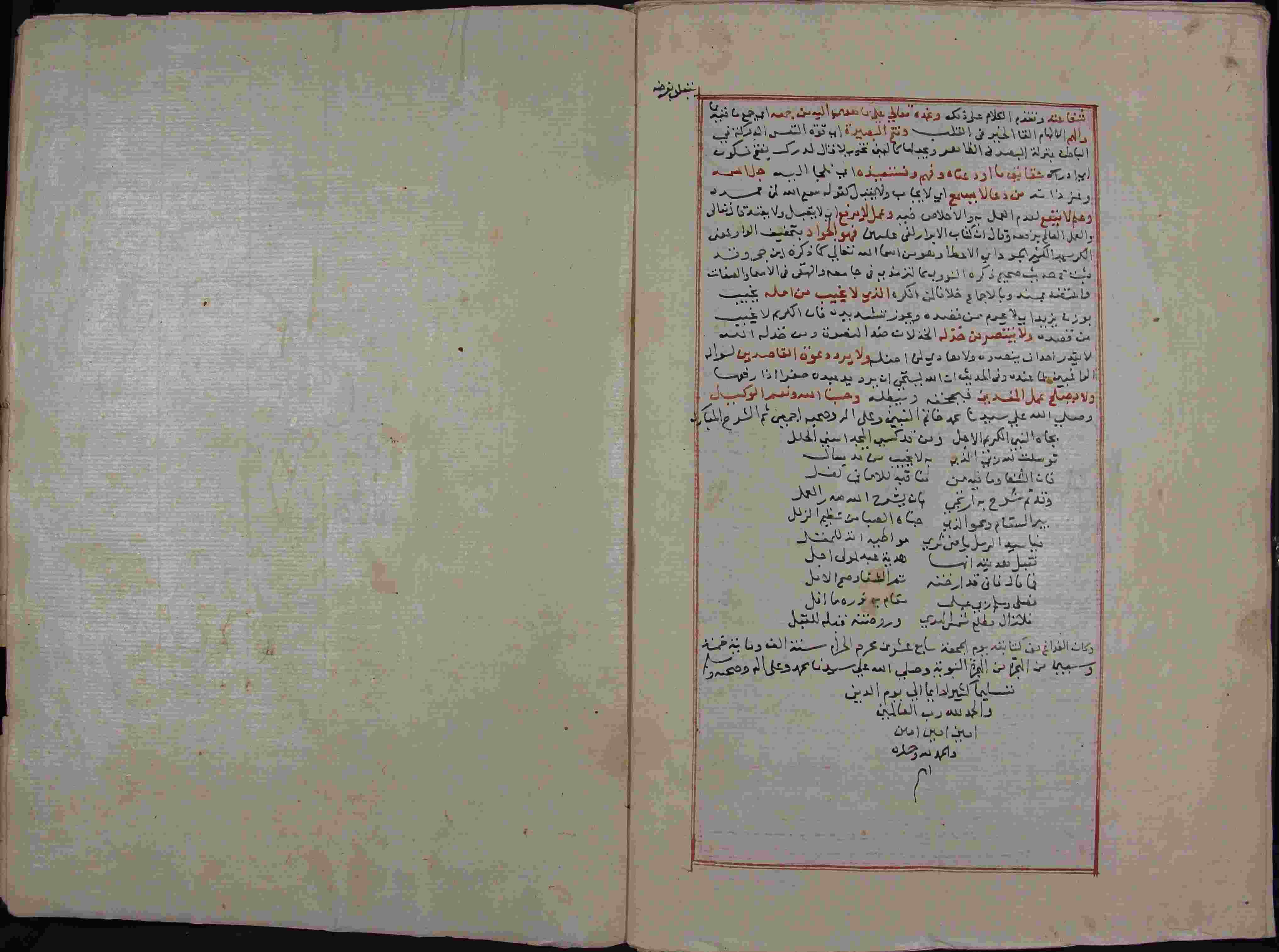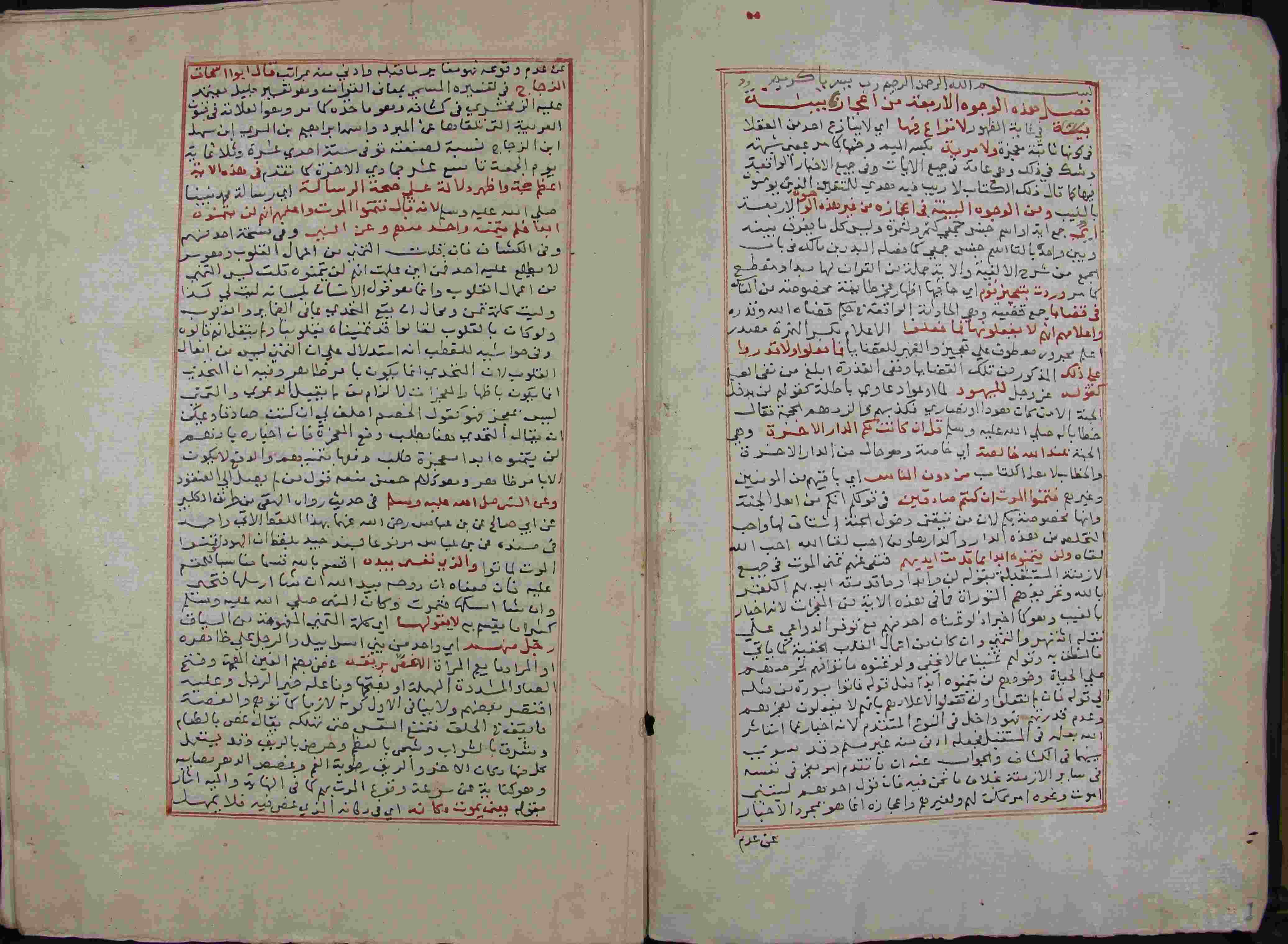Description: أوله : " بسم الله الرحمن الرحيم رب يسر يا كريم فصل هذه الوجوه الأربعة في إعجاز بيانية في غاية الظهور لا نزاع فيها..."/آخره : " ولا يصلح عمل المفسيدين فيمحقه ويبطله وحسبنا الله ونعم الوكيل... تم الشرح المبارك "، نوع الخط مشرقي، التجليد مزخرف، حالة المخطوط جيدة، متن الكتاب في إطار ملون بالأحمر، بداية المخطوط في الورقة الثالثة، نهاية المخطوط في الورقة 600، المخطوط مرقمن، رقم المخطوط 464 م، مصدر المخطوط : مكتبة الشيخ نعيم النعيمي ؛ المراجع والمصادر : الأعلام خير الدين الزركلي (2/ 250).