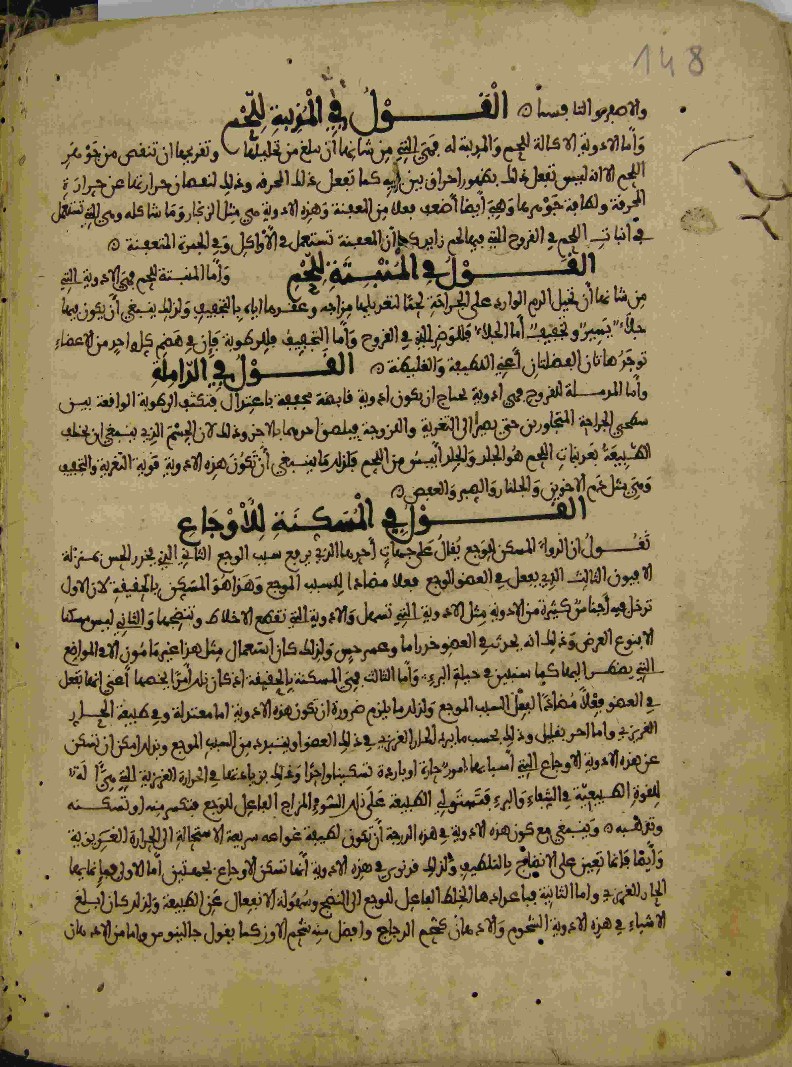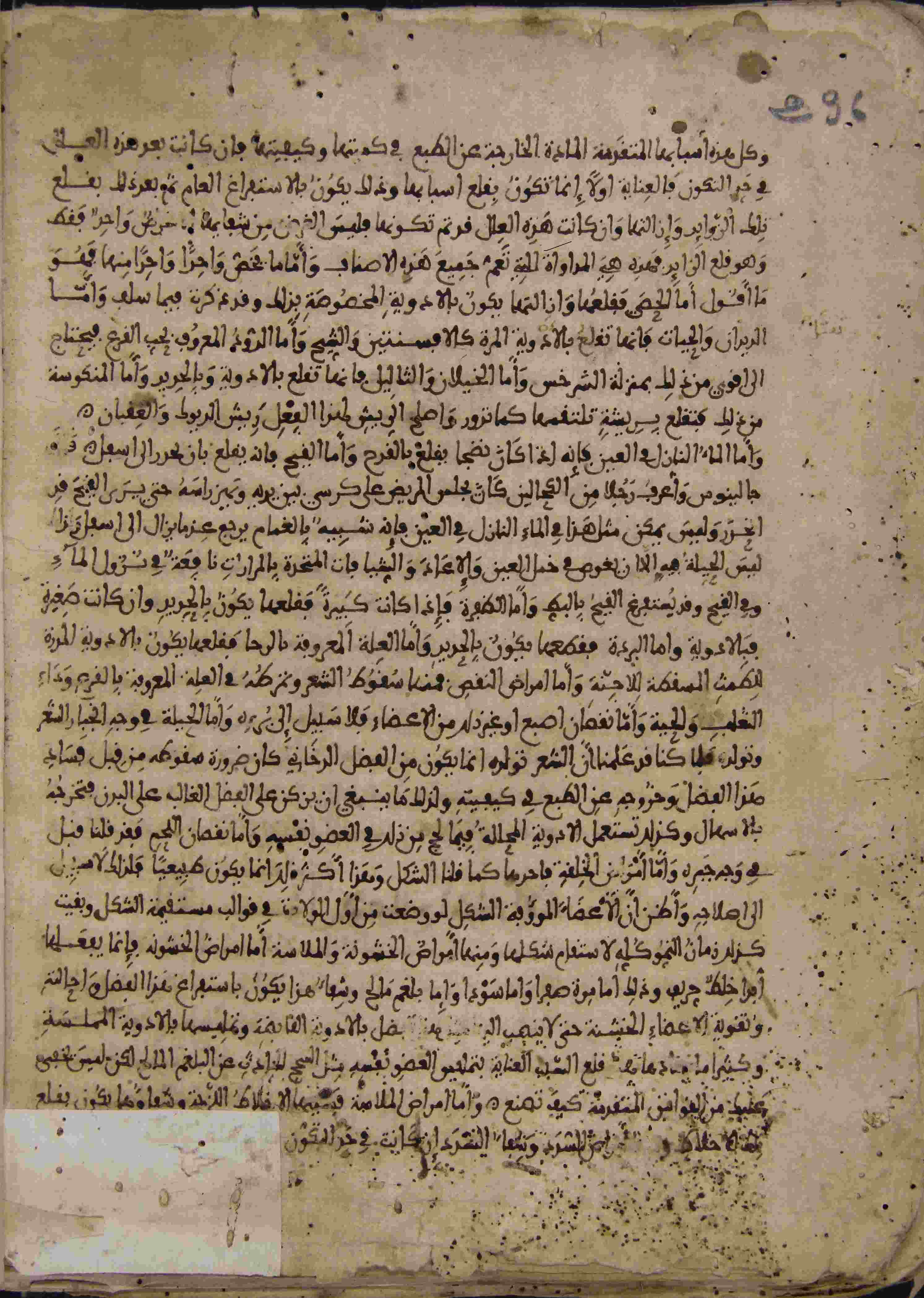 Description: أوله : " بعد حمد الله تعالى والصلاة على رسوله المصطفى وآله فإن الغرض في هذا القول..."/آخره : " مبتور الآخر القول في علاج أمراض الأعضاء الآلية "، نوع الخط مغربي، التجليد مزخرف، حالة المخطوط حسنة، خضع لعملية صيانة، به ثقوب سببها الأرضة، تملكها محمد بن عبد الكريم لفكون، بداية المخطوط في الورقة الأولى، نهاية المخطوط في الورقة 148، المخطوط مرقمن، رقم المخطوط 889 م، مصدر المخطوط : زاوية الشيخ الحسين سيدي خليفة (ميلة).
