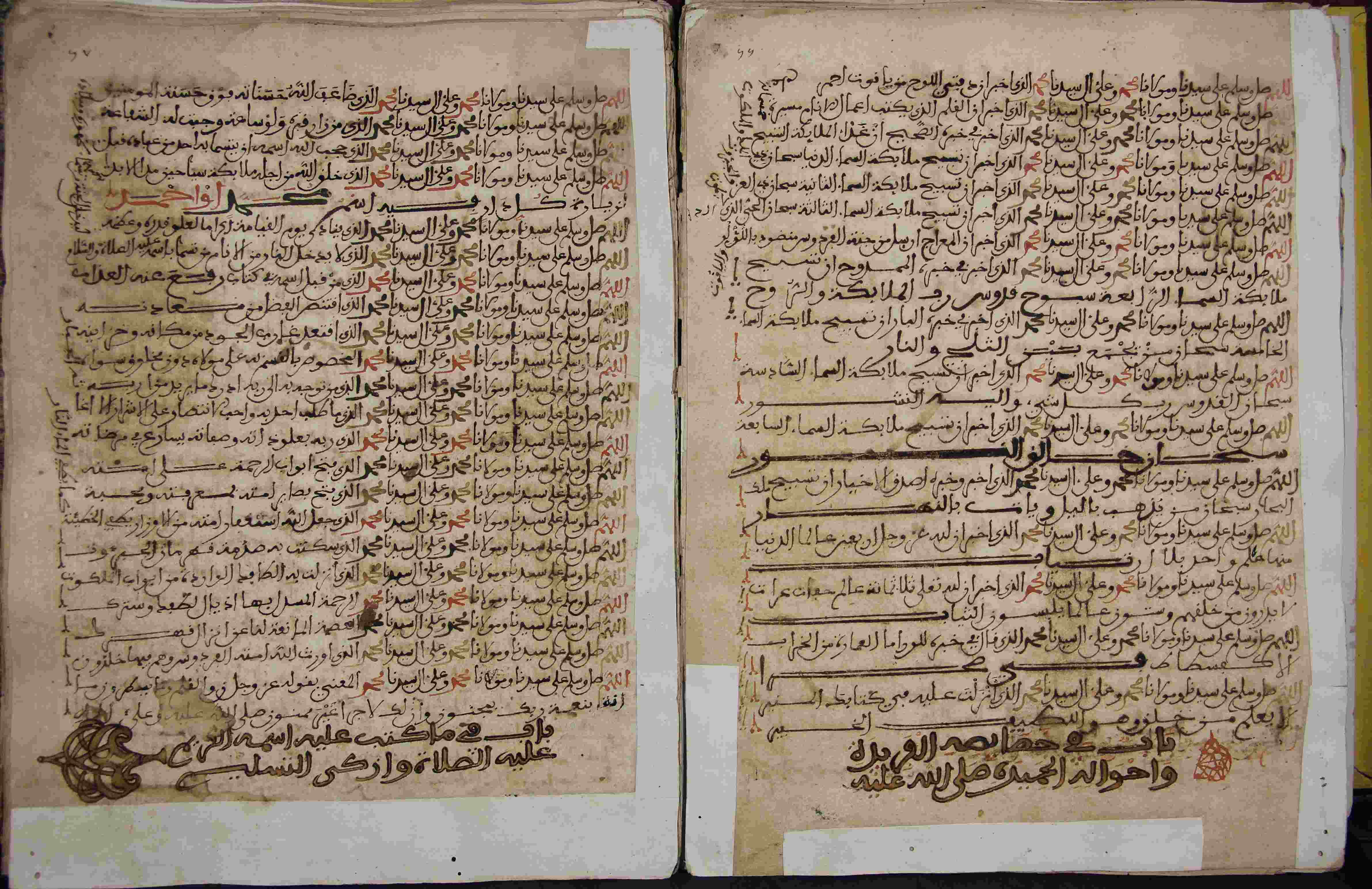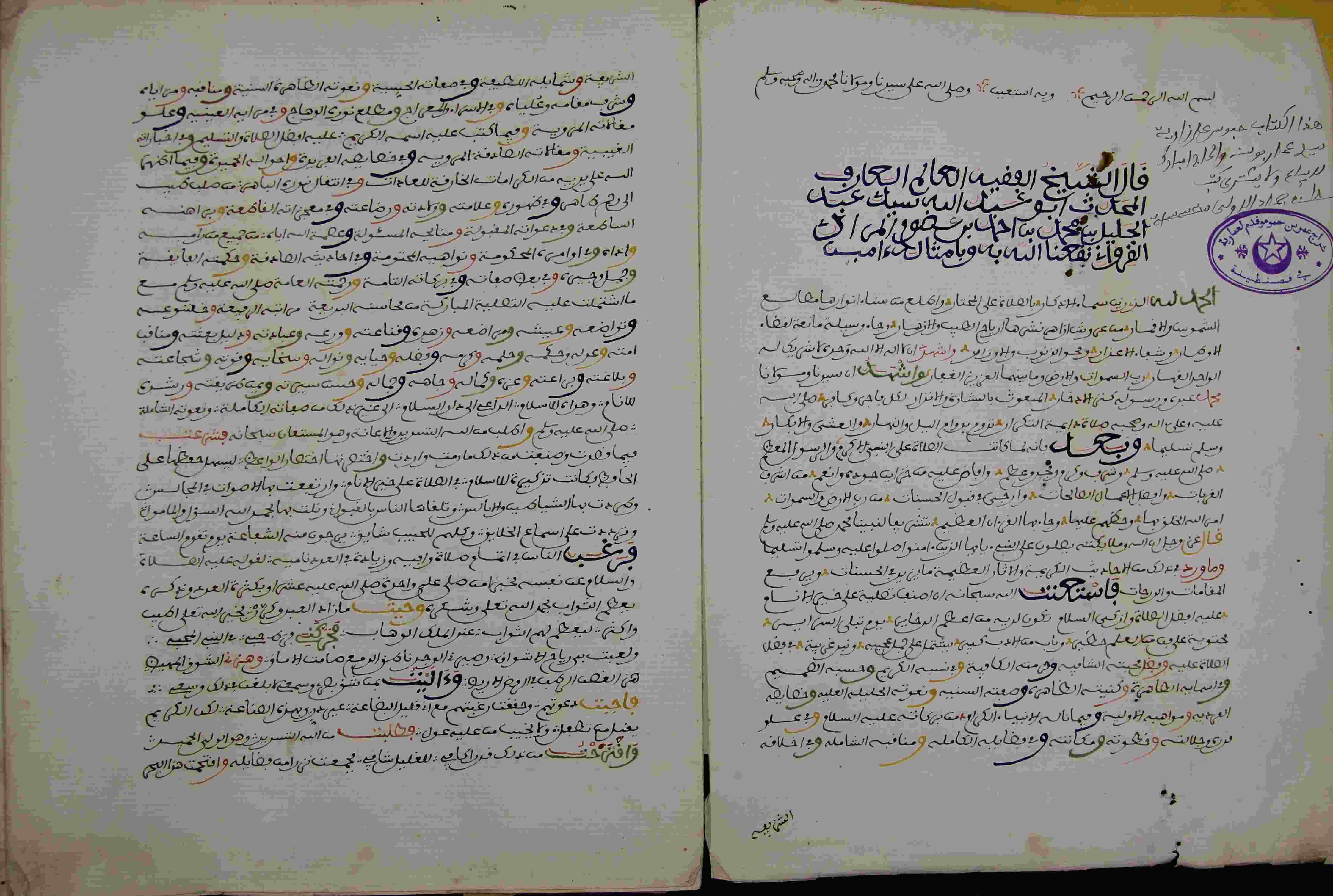 Description: أوله : " الحمد لله الذي زين سماء الأذكار، بالصلاة على المختار واطلع من سناء أنوارها مطالع الشموس والأقمار، من عروس أزهار نشرها أرياح الطيب والأزهار، وجاء وسيلة مانعة لقضاء الأوطار، وشفاء الأعذار ومحو الذنوب والأوزار، وأشهد أن لا إله إلا الله وحده لا شريك له الواحد القهار رب السموات والأرض وما بينها العزيز الغفار، وأشهد أن محمدا عبده ورسوله كنز الإدخار المبعوث بالبشارة..."/آخره : " قد تم نسخ كتاب قد سمى شرفا وبالصلاة على المختار قد وصفا، ثم صلاة وتسليم وبعدهما رضا إلا له على المختار والخلفا انتهى وكمل "، نوع الخط نسخي، التجليد مزخرف بزخرفة مكبوسة على البارد، حالة المخطوط حسنة، المداد أسود للنص وأحمر وأصفر وأخضر للعناوين وبعض الكلمات، النص مكتوب في إطار ملون، بعض العبارات على الهامش، نسخ في 14 رجب 1279 هـ.، بداية المخطوط في الورقة الثانية، نهاية المخطوط في الورقة 134، المخطوط مرقمن، رقم المخطوط 455 م، مصدر المخطوط : مكتبة الشيوخ ؛ المراجع والمصادر : سركيس 185، الأعلام خير الدين الزركلي (7/ 229).