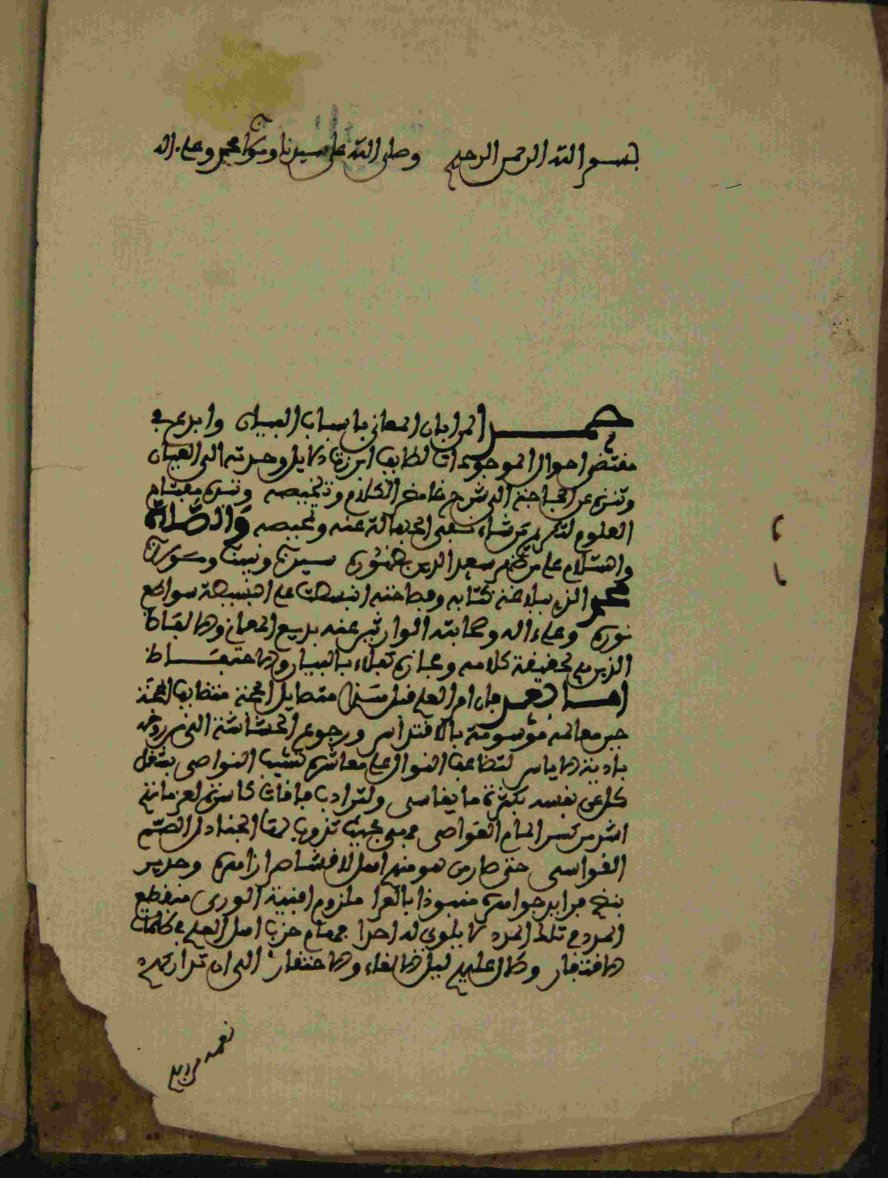 | Description: | أوله : " أوله : " حمدا لمن أبان المعاني بأسباب البيان وأبرع في مقتضى أحوال الموجودات لطائف أبرز دلائل وحدته إلى العيان..."/ آخره : " الفاعل دون المبتدأ الإسم لا يرام ويلزم كم تحقق الإضافة الشي إلى نفسه ومن لزوم الإستخراج "، نوع الخط مغربي، التجليد عادي، حالة المخطوط حسنة، به ختم أحمد بن عبد الرحمان، حبس في أواسط صفر عام 1259 هـ.، بداية المخطوط في الورقة الأولى، نهاية المخطوط في الورقة 50، المخطوط مرقمن، رقم المخطوط 484 م، مصدر المخطوط : مكتبة الشيخ نعيم النعيمي. |