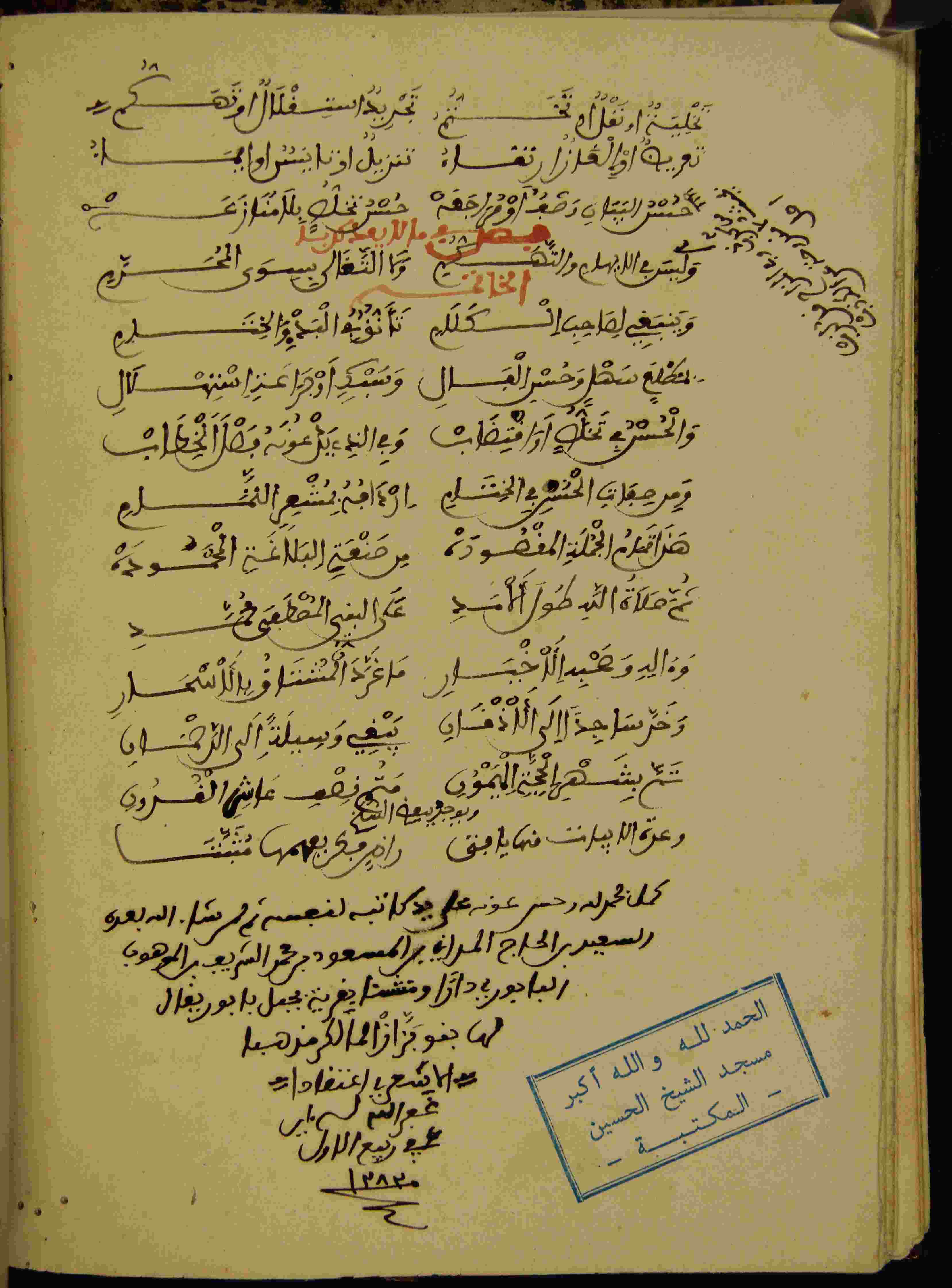 Description: أوله : " الحمد لله البديع الهادي إلى بيان مهيع الرشاد..."/آخره : " وعرة الأبيات من هيا فتى راض بكريمها مثبتا "، عدد الأوراق الخاصة به 8 أوراق، عدد الأسطر 23 سطر، المتن مستقل في ثمانية ورقات (22 - 29)، نوع الخط مغربي، التجليد عادي، حالة المخطوط جيدة، بداية المخطوط في الورقة 28، نهاية المخطوط في الورقة 35، المخطوط مرقمن، رقم المخطوط 2.5 /900 م، مصدر المخطوط : زاوية الشيخ الحسين سيدي خليفة (ميلة).