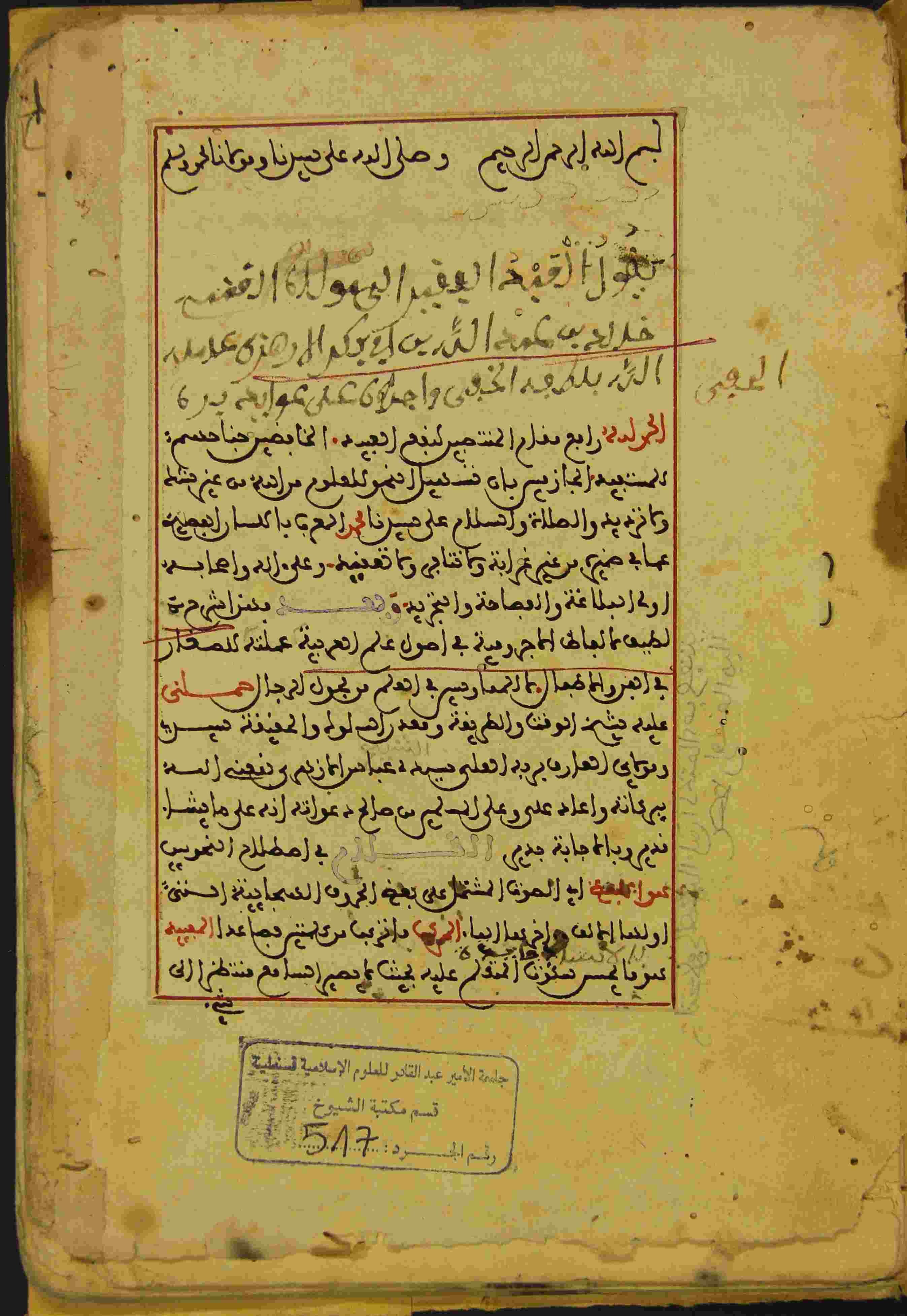 | Description: | أوله : " الحمد لله رافع مقام المنتصبين لنفع العبيد الخافضين للمستفيد الجازمين بأن تسهيل النمو للعلوم..."/ آخره : " والله تعالى أعلم وأحكم انتهى بحمد الله وحسن عونه على وصلى الله على سيدنا محمد وسلم تسليما "، نوع الخط مغربي، التجليد غير مجلد، حالة المخطوط حسنة، بداية المخطوط في الورقة الأولى، نهاية المخطوط في الورقة 32، منزوع الغلاف، به تعليقات في الحواشي، الكتاب مكتوب في إطار، المخطوط مرقمن، رقم المخطوط 517 م، مصدر المخطوط : مكتبة الشيخ نعيم النعيمي. |