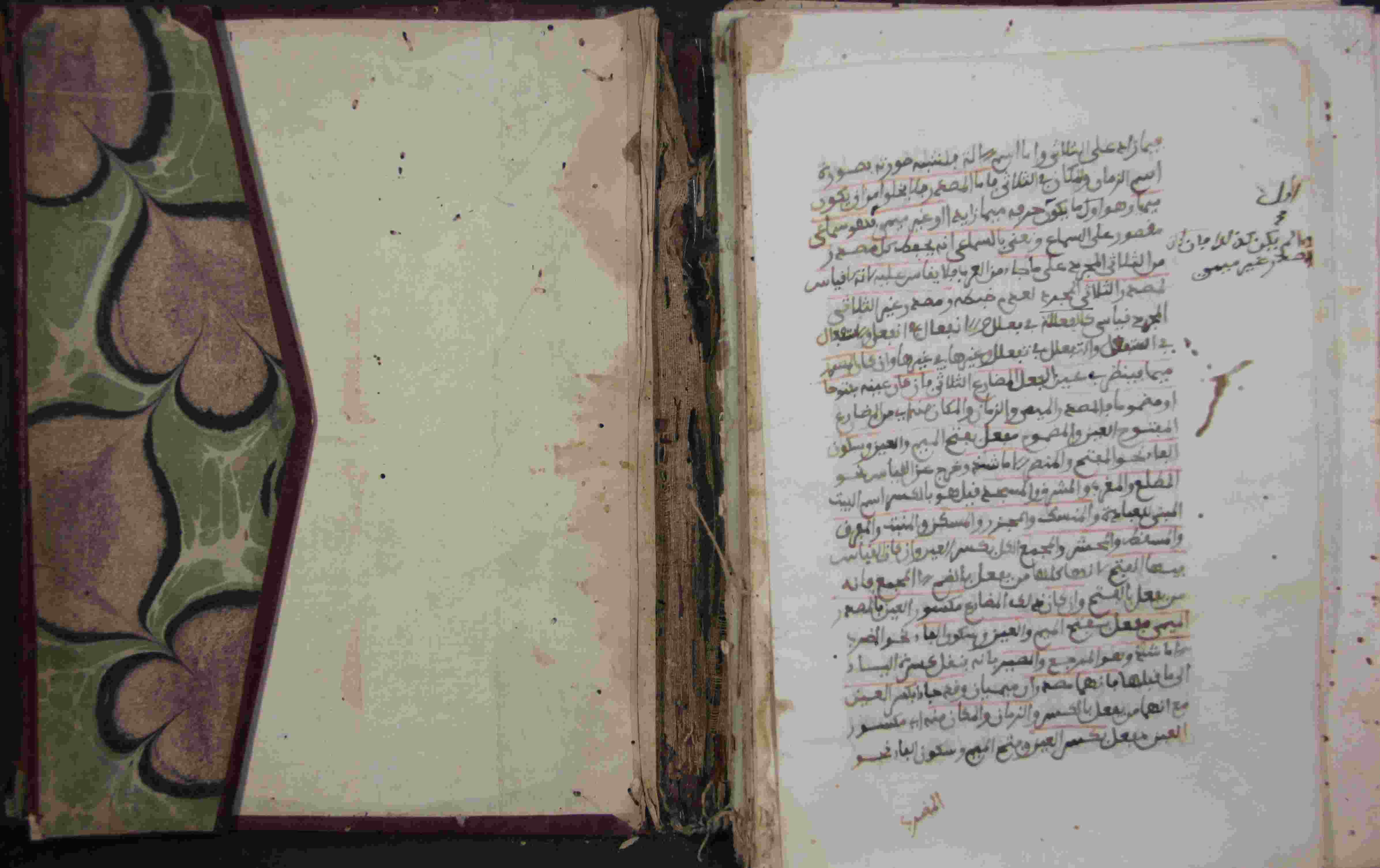 Description: أوله : " بسم الله الرحمن الرحيم رب يسر ولا تعسر صلى الله على سيدنا ومولانا محمد وآله هذا ما انتقيته من الجزء الثاني..."/آخره : " وقد جاء بكسر العين مع أنهما من يفعل بالكسر والزمان والمكان من أي مكسور بالعين يفعل بكسر العين وفتح الميم وسكون الباء فهو "، نوع الخط مغربي، التجليد عادي، حالة المخطوط حسنة، ثلاث كتب في مجلد واحد، بداية المخطوط في الورقة الرابعة، نهاية المخطوط في الورقة 95، المخطوط مرقمن، رقم المخطوط 586 م، مصدر المخطوط : مكتبة الشيخ نعيم النعيمي ؛ المراجع والمصادر : الأعلام خير الدين الزركلي (1/ 482).