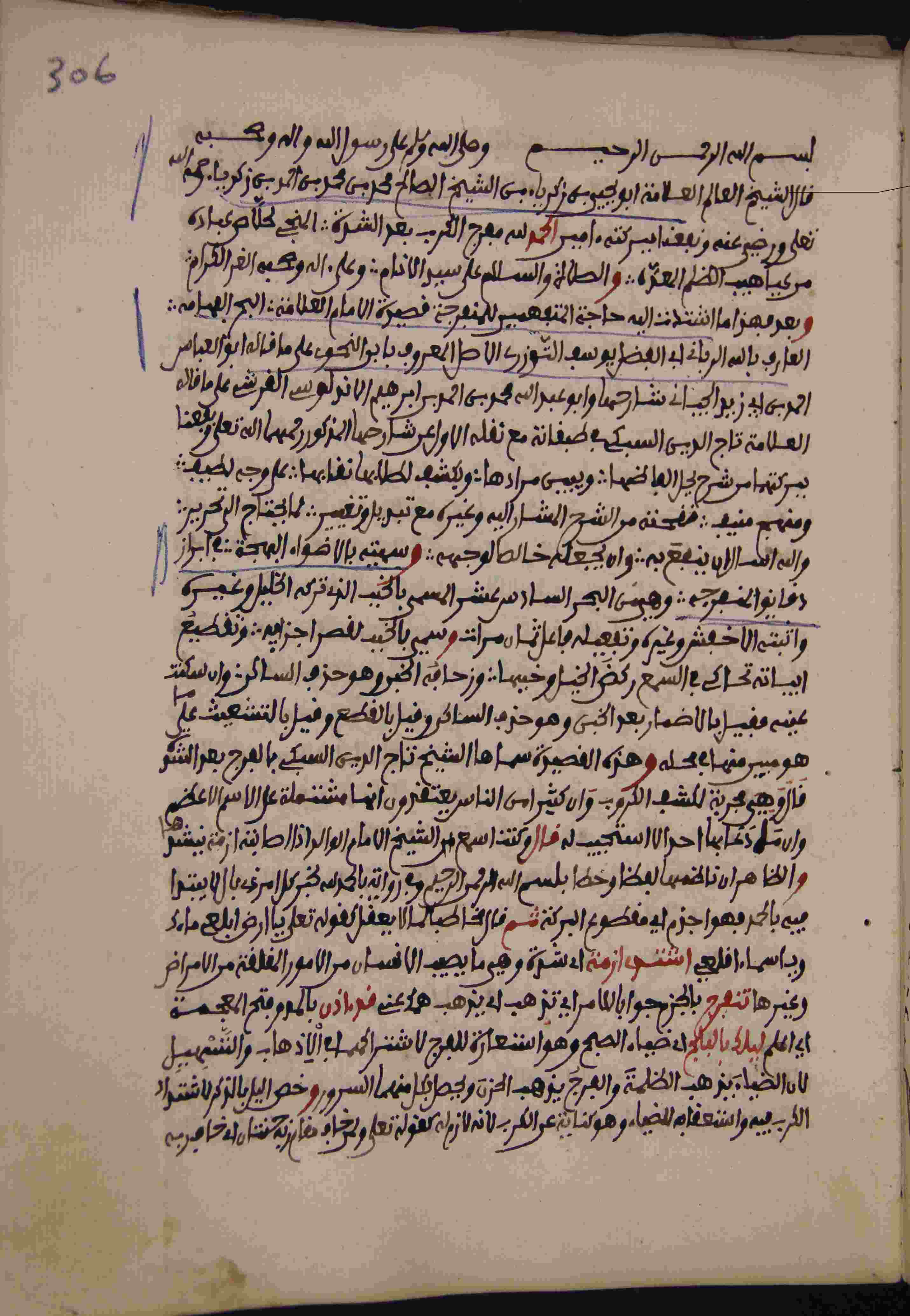 | Description: | أوله : " بسم الله الرحمان الرحيم وصلى الله وسلم على رسول الله وآله و صحبه قال الشيخ العلامة أبو يحيى بن زكريا بن الشيخ الصالح محمحد بن محمد بن أحمد بن زكريا..."/آخره : " شرح تخميس القصيدة لأبي الفضل.."، نوع الخط مغربي، التجليد مزخرف، حالة المخطوط حسنة، الأوراق الأخيرة من 321 إلى 325 بها شرح تخميس القصيدة لأبي الفضل بن النحوي المعرفة بالجنبية وهو لأبي محمد عبد الله بن عبد الله بن نعيم، بداية المخطوط في الورقة 206، نهاية المخطوط في الورقة 321، المخطوط مرقمن، رقم المخطوط 2.2 /576 م، مصدر المخطوط : مكتبة الشيخ نعيم النعيمي ؛ المراجع والمصادر : الأعلام للزركلي (3/ 46). |