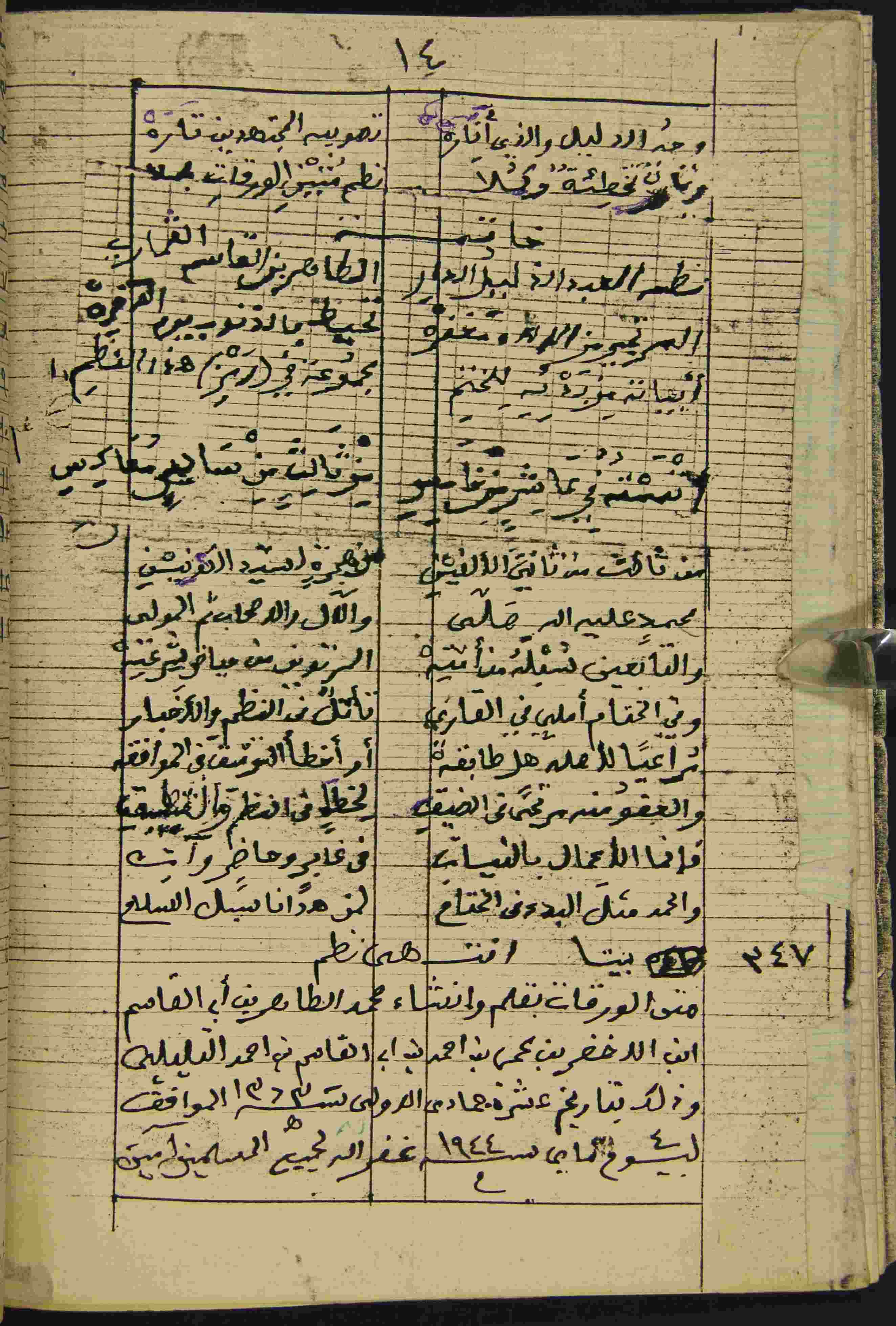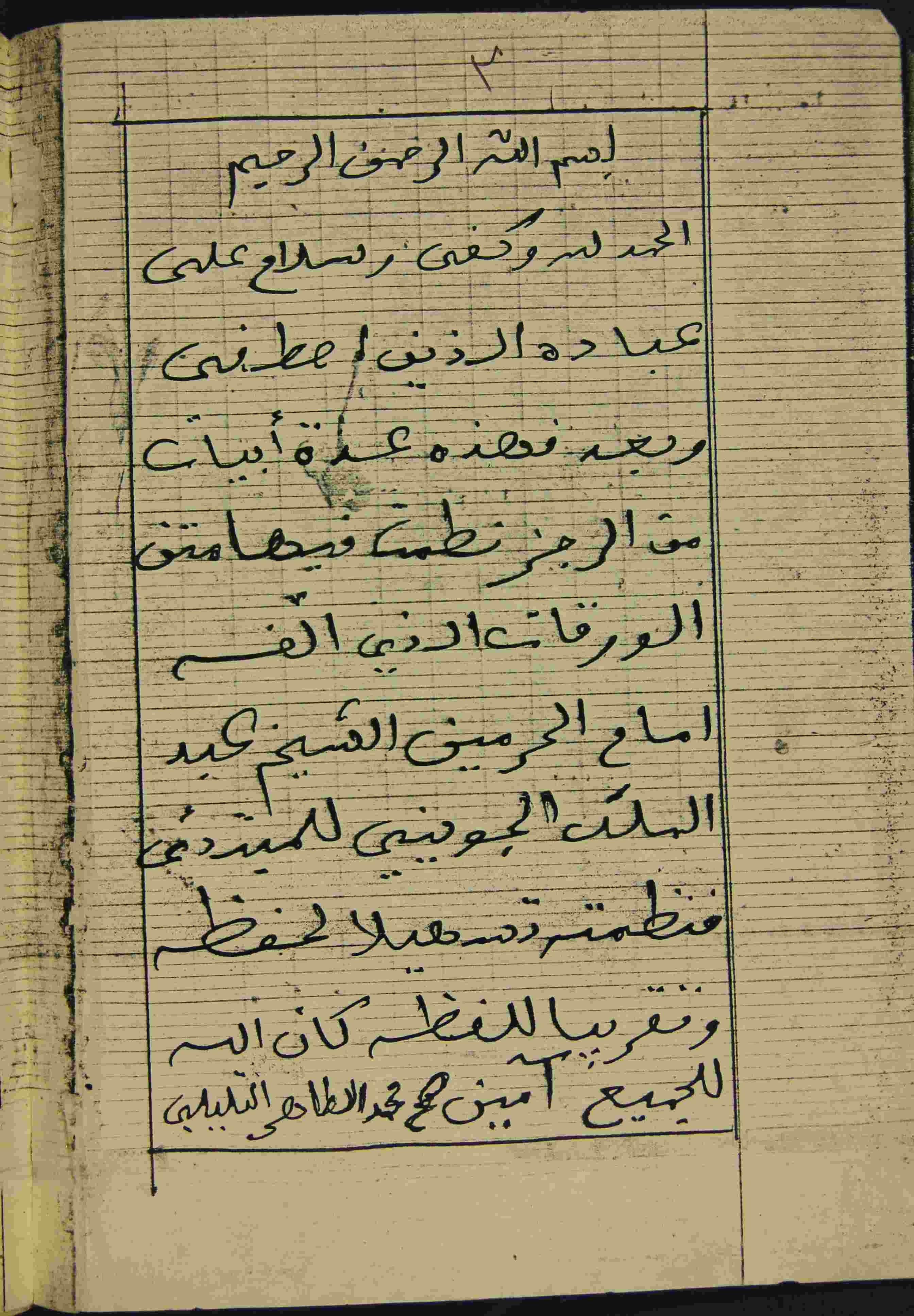 Description: أوله : " بسم الله الرحمان الرحيم الحمد لله وكفى وسلام على عباده الذين اصطفى وبعد فهذه عدة أبيات من الرجز نظمت فيها..."/ آخره : " فإنما الأعمال بالنيات في غابر وحاضر وآت والحمد مثل البدء في الختام لمن هدانا سبل الإسلام "، نوع الخط مغربي، التجليد غير مجلد، حالة المخطوط حسنة، كان الفراغ منه بتاريخ جمادى الأولى سنة 1383 هـ. الموافق لـ 4 ماي 1944 م.، بداية المخطوط في الورقة الأولى، نهاية المخطوط في الورقة السابعة، بخط مؤلفه، المخطوط مرقمن، رقم المخطوط 597 م، مصدر المخطوط : مكتبة محمد الطاهر التليلي القماري.