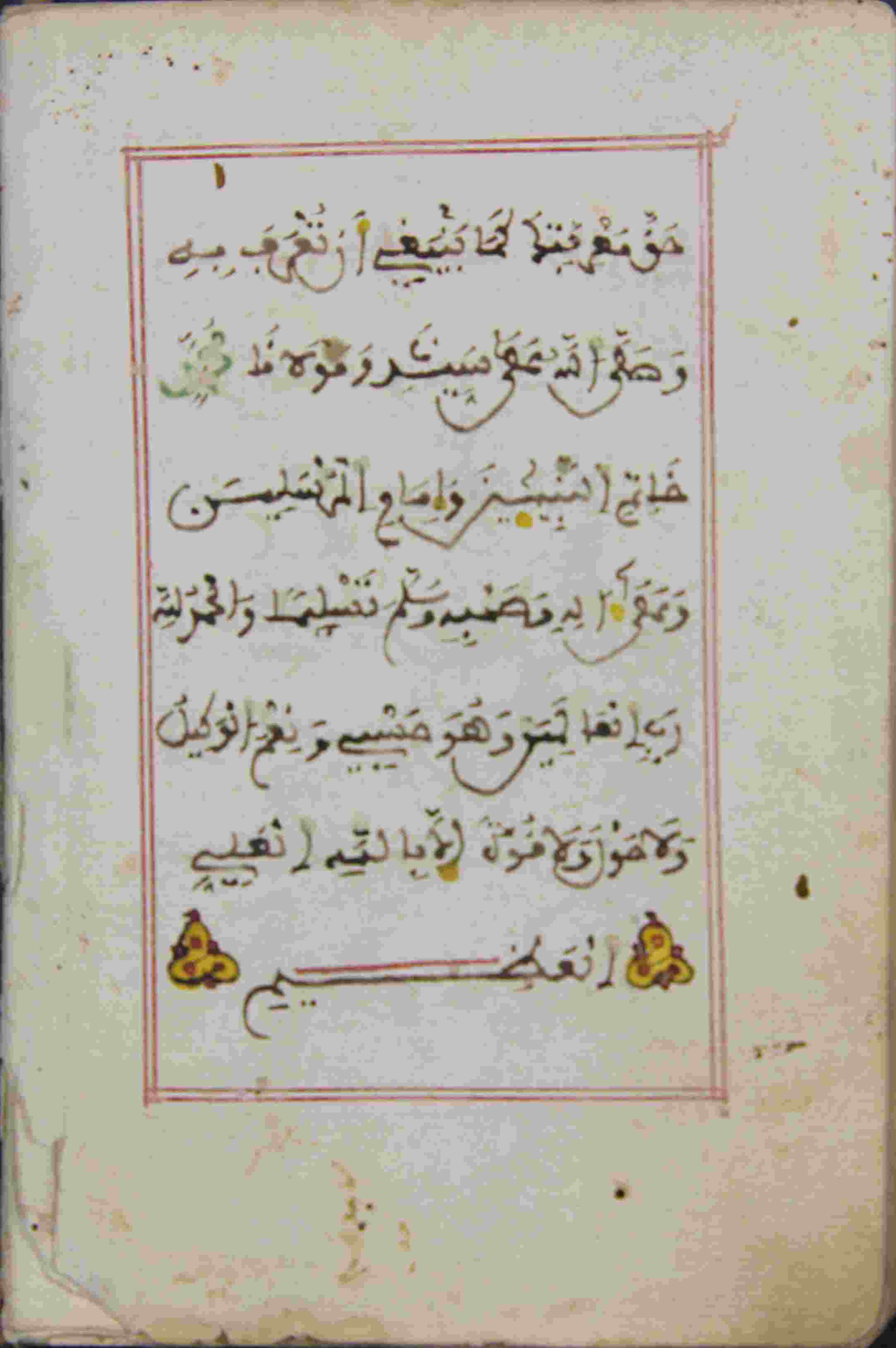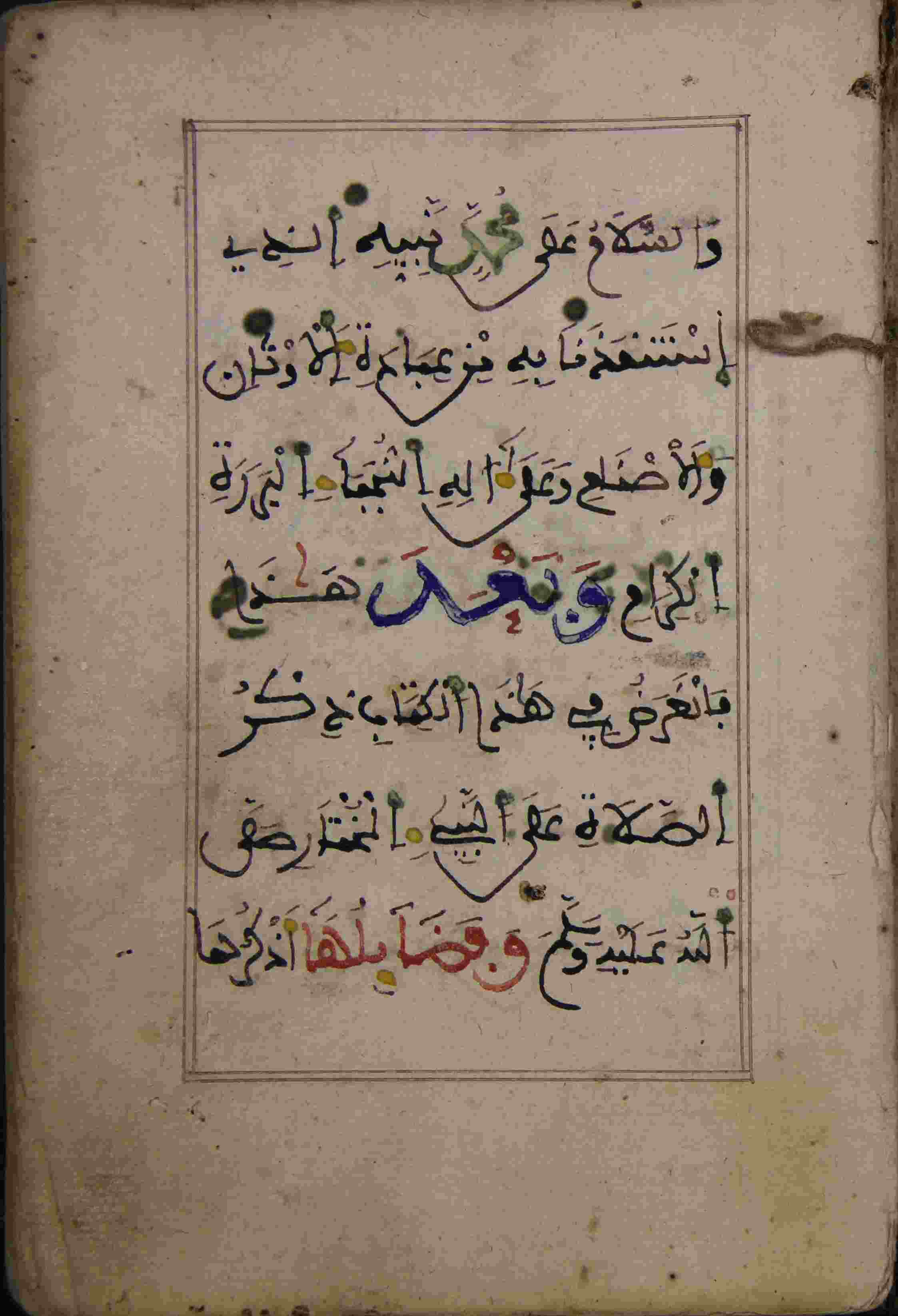 | Description: | أوله : " والسلام على نبيه الذي إستنقذنا به من عبادة الأوثان والأصنام..."/آخره : " حق معرفتك كما ينبغي أن تعرف به وصلى الله وسلم على سيدنا ومولانا محمد خاتم النبيين وإمام المرسلين وعلى آله وصحبه وسلم تسليما "، نوع الخط مغربي، التجليد عادي، حالة المخطوط جيدة، مبتور الأول حوالي ورقة، الكتاب مضبوط بالشكل، بداية المخطوط في الورقة الأولى، نهاية المخطوط في الورقة 161، المخطوط مرقمن، رقم المخطوط 677 م، مصدر المخطوط : زاوية الشيخ الحسين سيدي خليفة (ميلة) ؛ المراجع والمصادر : الأعلام خير الدين الزركلي (13/ 384). |