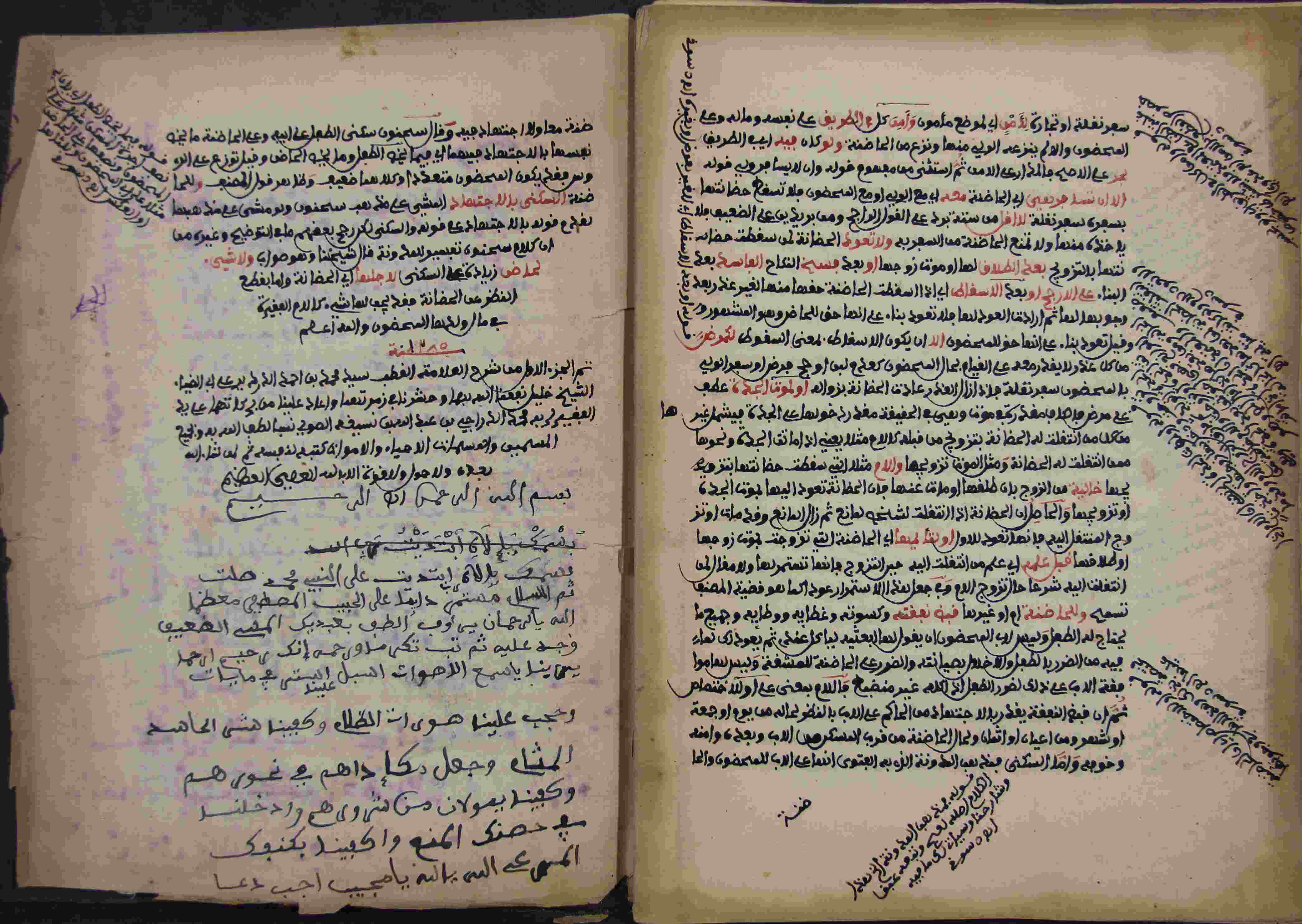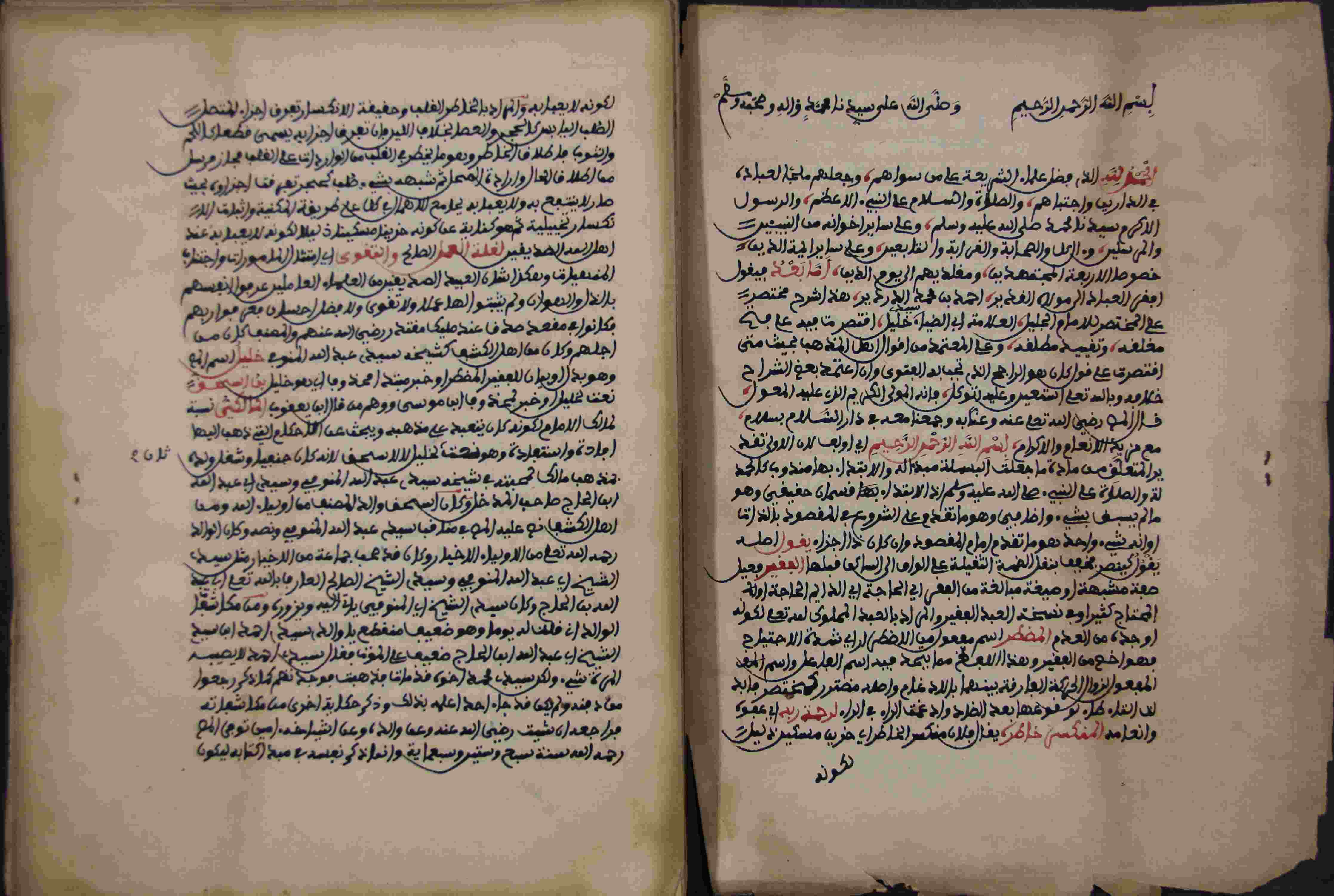 Description: أوله : " الحمد لله الذي فضل علماء الشريعة على من سواهم وجعلهم ملجأ العباد في الدارين واجتباهم..."/آخره : " تم الجزء الأول من شرح العلامة القطب سيد محمد بن أحمد الدردير "، نوع الخط مغربي، التجليد مزخرف، حالة المخطوط حسنة، بهامشه تعليقات، عليه آثار الرطوبة، بآخره زيادات، بداية المخطوط في الورقة الثانية، نهاية المخطوط في الورقة 290، المخطوط مرقمن، رقم المخطوط 323 م، مصدر المخطوط : مكتبة الشيخ نعيم النعيمي.