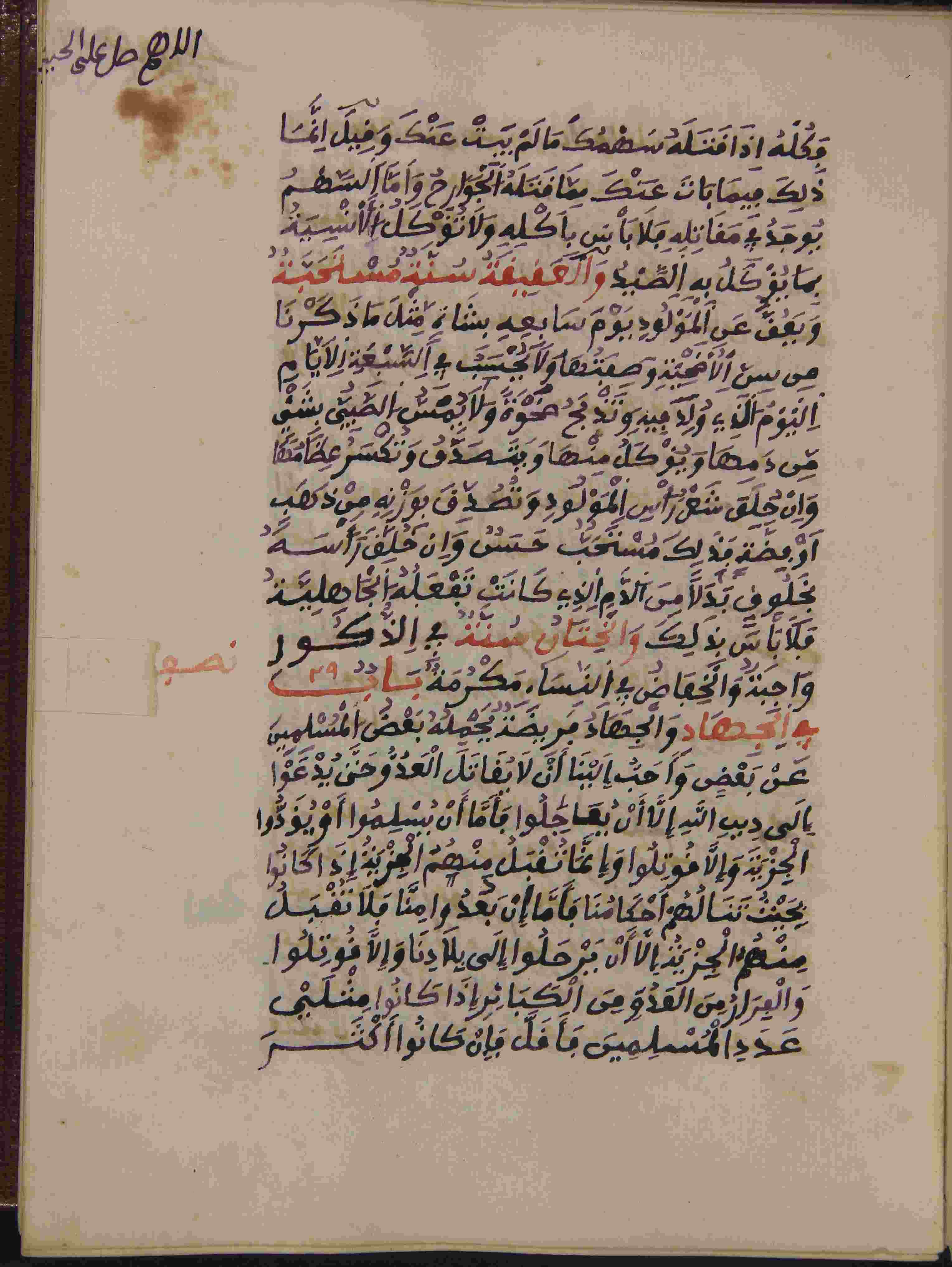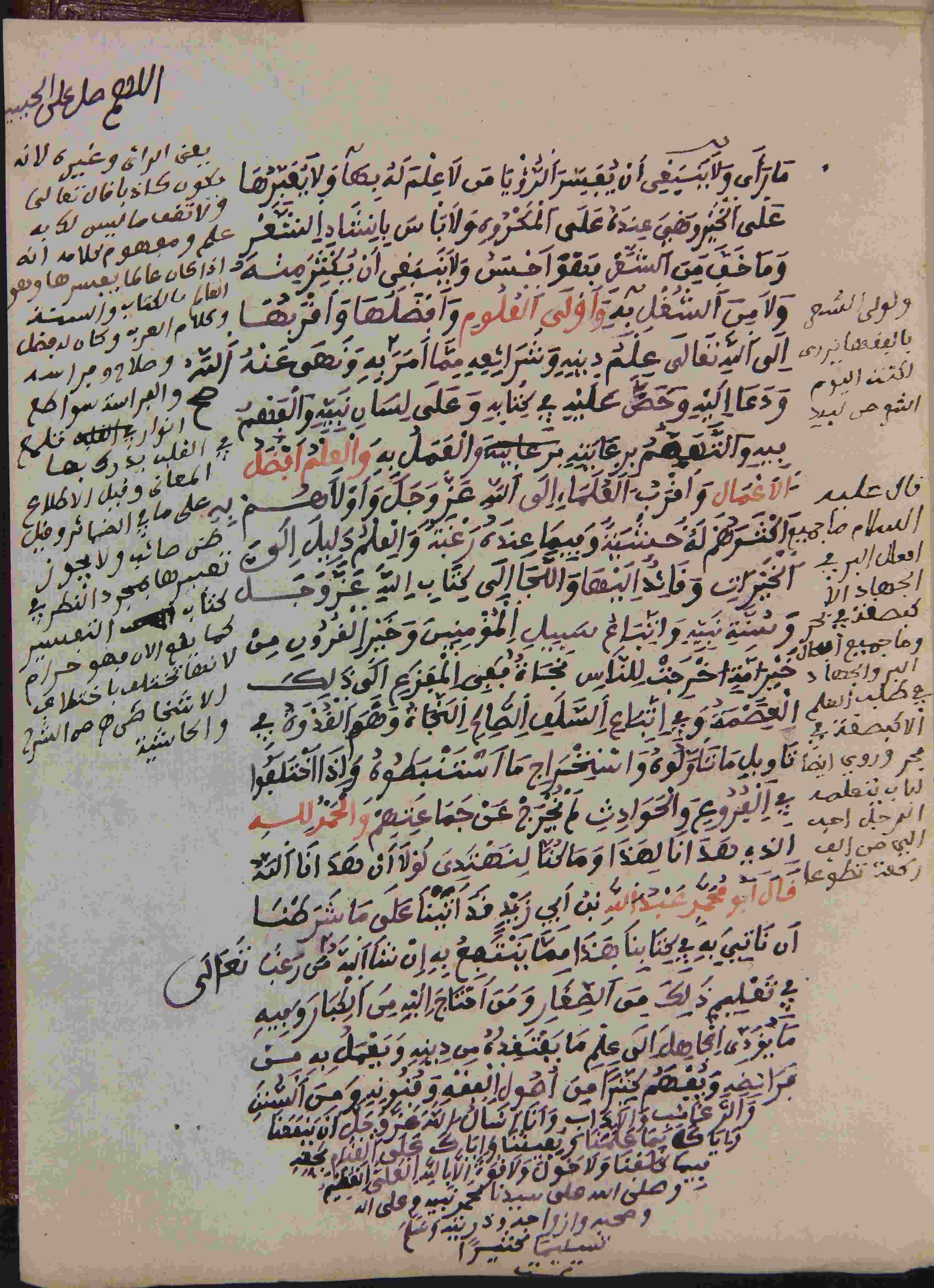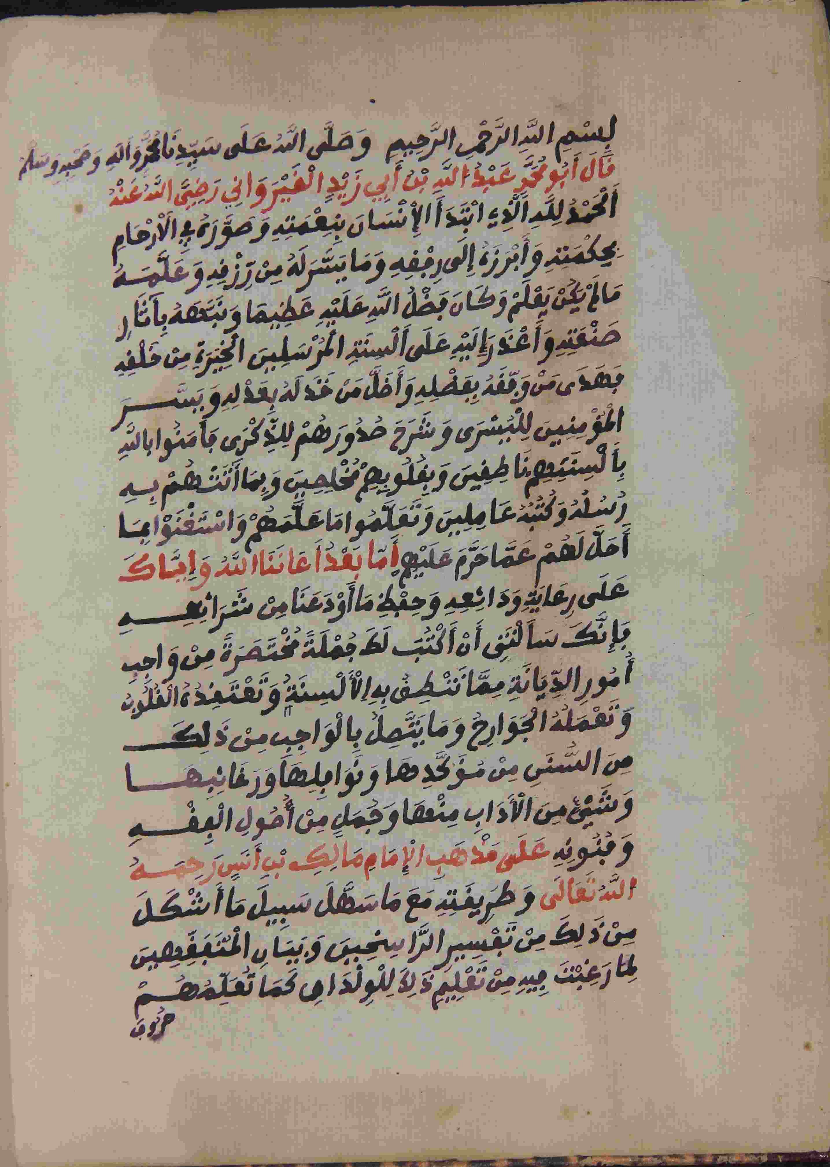 | Abstract: | أوله : " بعد البسملة، قال أبو محمد عبد الله بن أبي زيد القيرواني رضي الله عنه، الحمد لله الذي ابتدأ الإنسان بنعمته وصوره في الأرحام بحكمته..."/آخره : " وأنا أسأل الله عز وجل أن ينفعنا وأياك بما علمنا ويعيننا وأياك علي القيام بحقه فيما كلفنا ولا حول ولا قوة إلا بالله العلي العظيم "، نوع الخط نسخي، التجليد جيد بزخرفة مكبوسة على البارد، حالة المخطوط حسنة، المداد أسود للكتابة وأحمر للعناوين، بعض الكلمات مكتوبة بالحبر الأحمر، بعض الكلمات والتعاليق في الهامش، بداية المخطوط في الورقة الأولى، نهاية المخطوط في الورقة 66، المخطوط مرقمن، رقم المخطوط 309 م، مصدر المخطوط : مكتبة الشيوخ ؛ المراجع والمصادر : الأعلام 4/231، مداخل المؤلفين 4، معجم المؤلفين (6/ 73). |