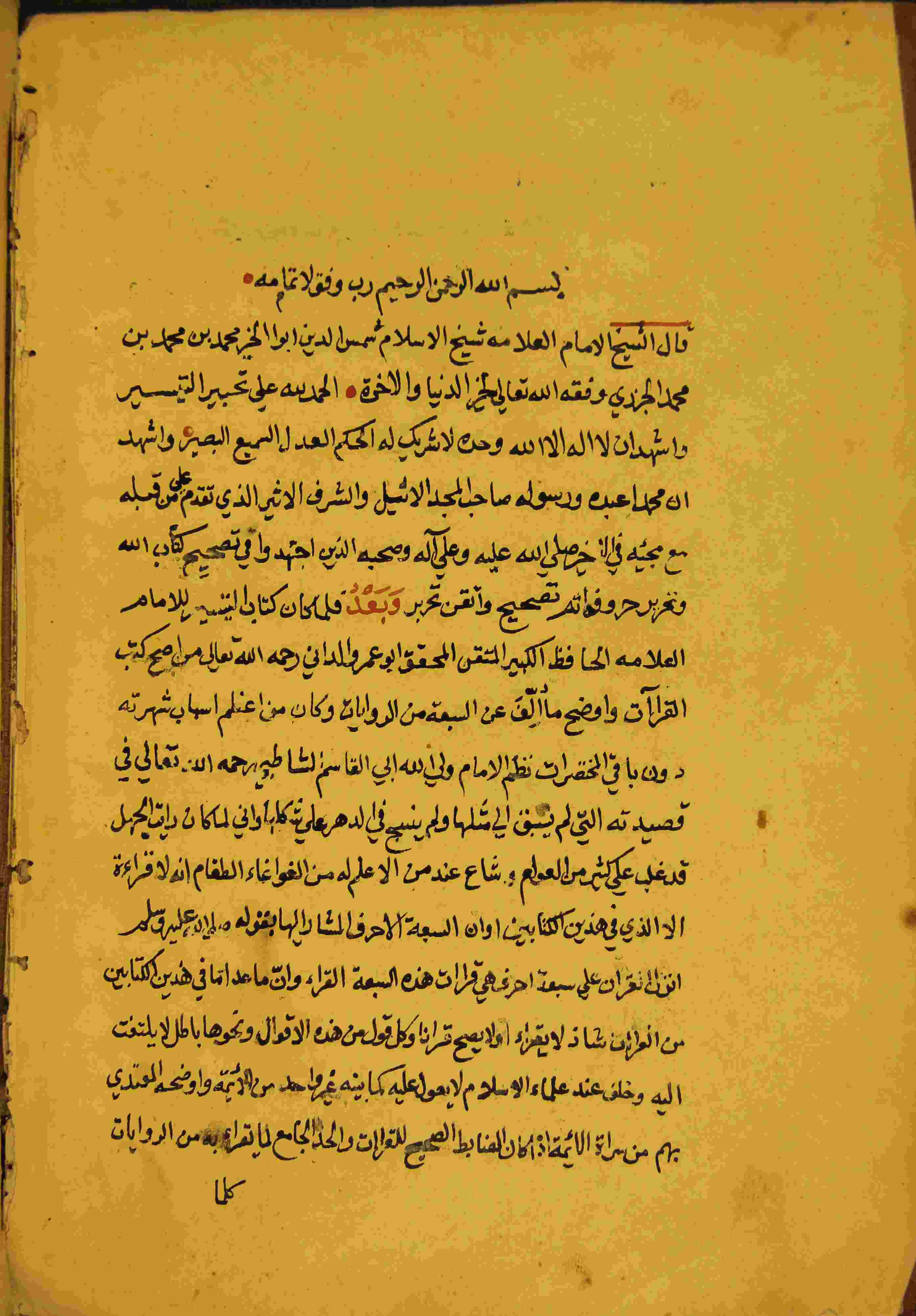 Description: أوله : " بسم الله الرحمان الرحيم رب وفق لإتمامه قال الشيخ الإمام العلامة شيخ الإسلام شمس الدين أبو الخير محمد بن محمد بن محمد الجزري وفقه الله تعالى لخير الدنيا والآخرة..."/آخره : " وأسقطت ألف الوصل التي في أول اسم الله في جميع ذلك استغنا عنها فاعلم ذلك موفقا لطريق الحج ومنهاج الصواب وبالله التوفيق والحمد لله رب العالمين "، بداية المخطوط في الورقة الثانية، نهاية المخطوط في الورقة 94، المخطوط مرقمن، رقم المخطوط 53 م، مصدر المخطوط : مكتبة الشيخ نعيم النعيمي.