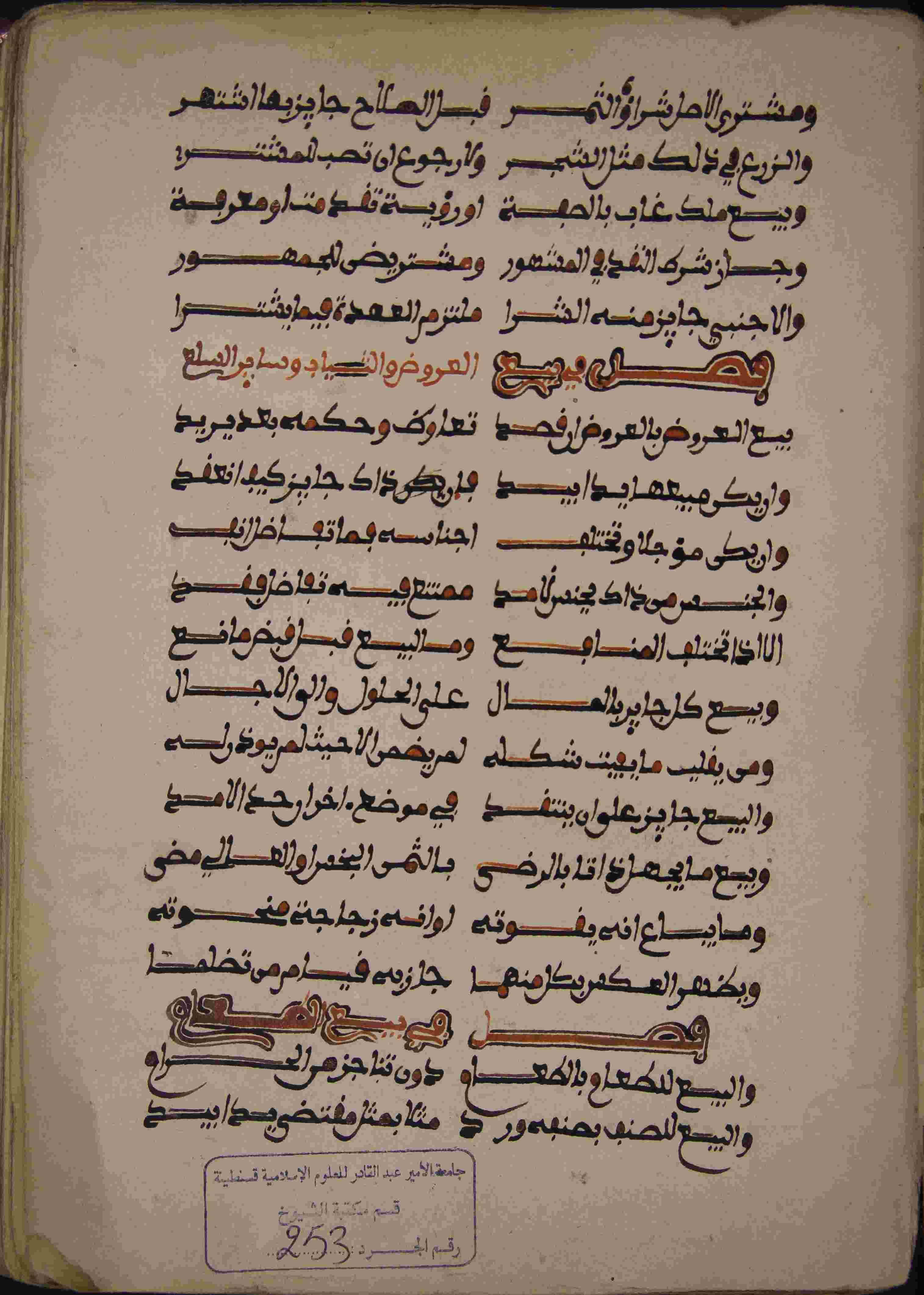 | Description: | أوله : " ومشتري الأصل شراف الثمر قبل الصلاح جايز بها اشتهر والزرع في ذلك مثل الشجر ولارجوع أن تصب للمشتري..."/ آخره : " وما قصدت جمعت هنا انتهى والحمد لله بغير منتهى وبالصلاة ختمه كما أبتدئ على الرسول المصطفى محمد وآله وصحبه الأخيار "، نوع الخط مغربي، التجليد مزخرف، حالة المخطوط حسنة، كان الفراغ منه بعد صلاة الظهر قبل صلاة العصر في شهر الله المعظم ذو القعدة بعد إنساخ خمسة وعشرون يوما منه عام 1222 هـ.، بخط المؤلف، بداية المخطوط في الورقة الأولى، نهايةالمخطوط في الورقة 36، المخطوط مرقمن، رقم المخطوط 253 م، مصدر المحطوط : مكتبة الشيوخ. |