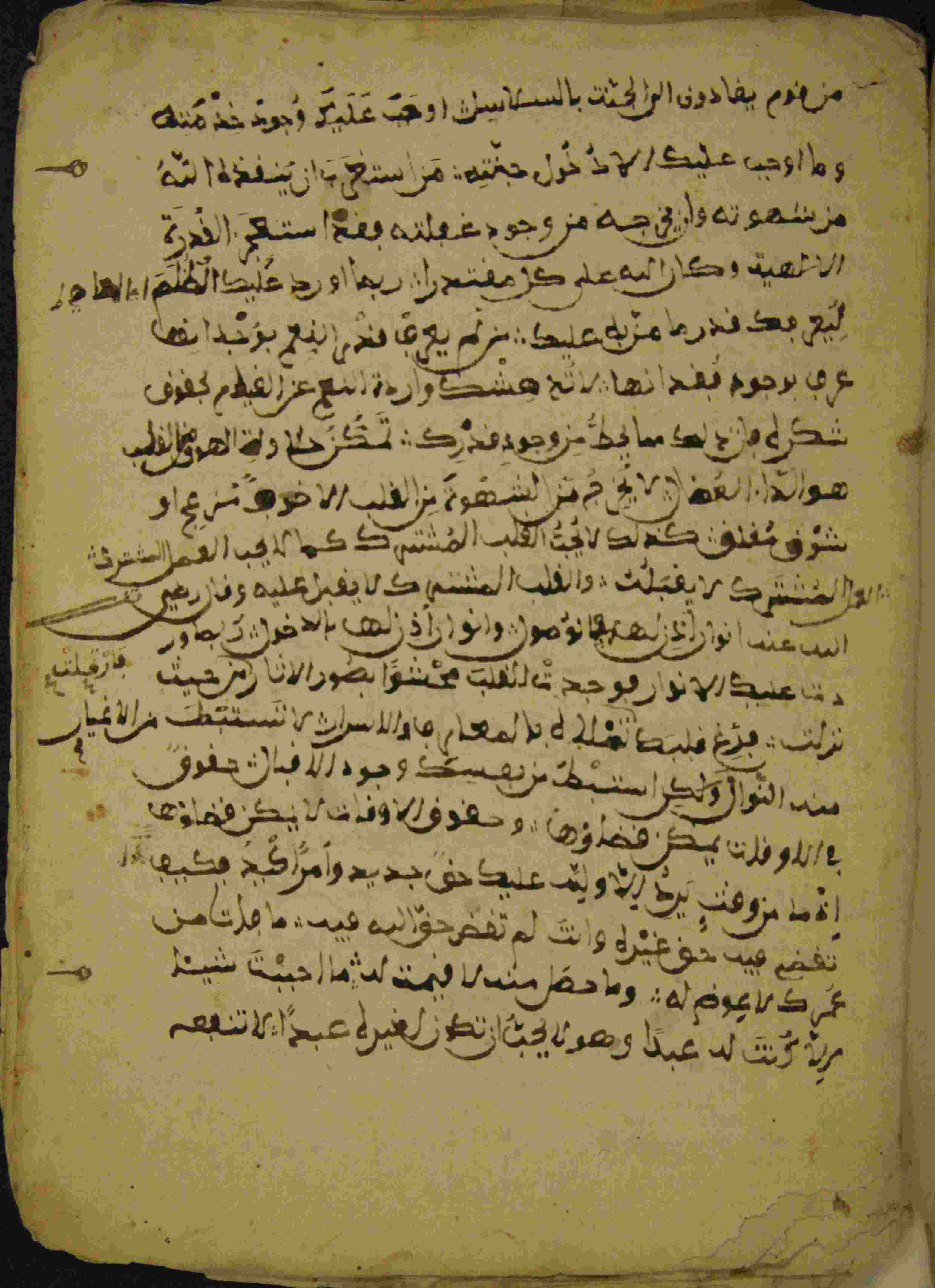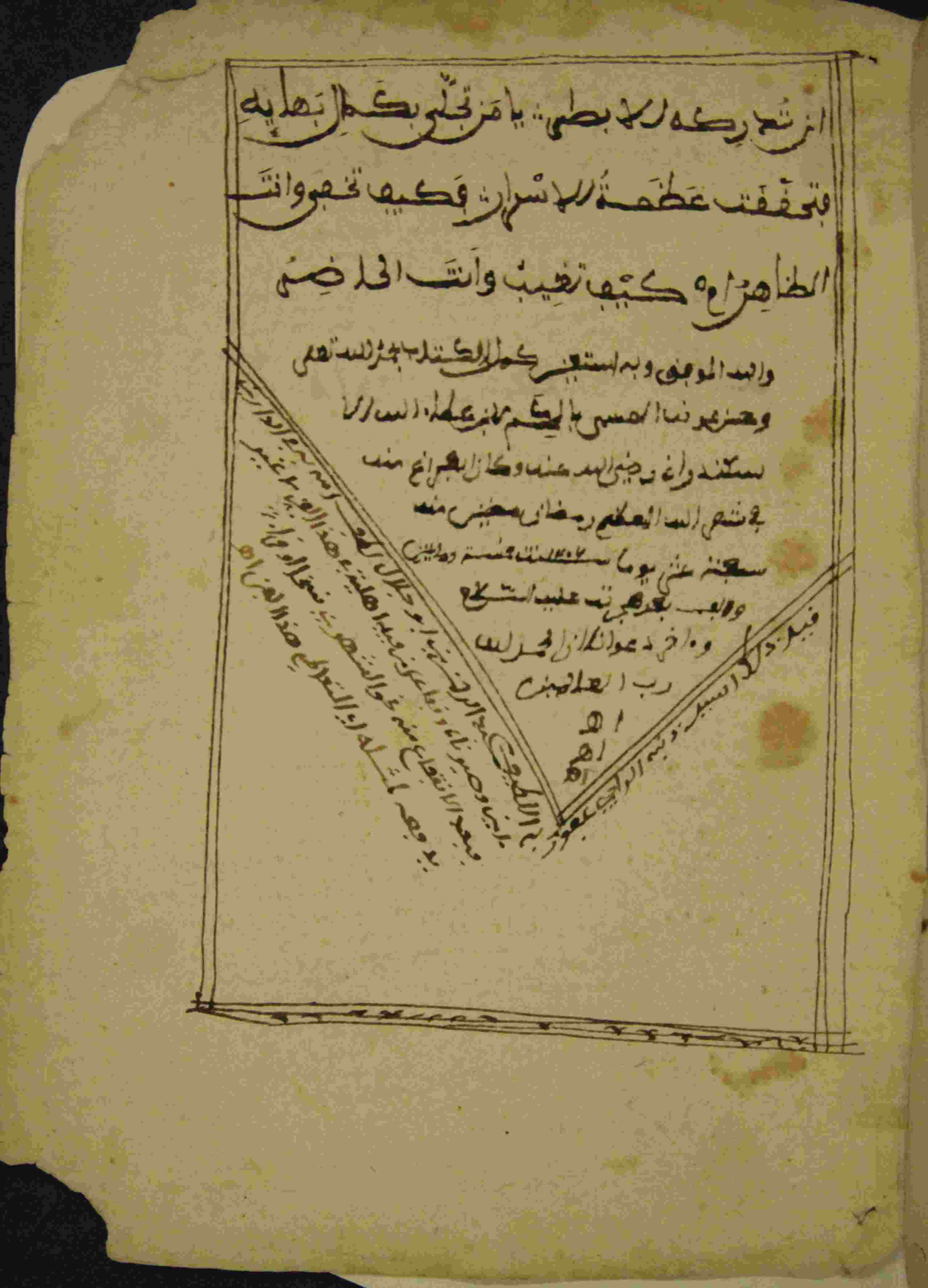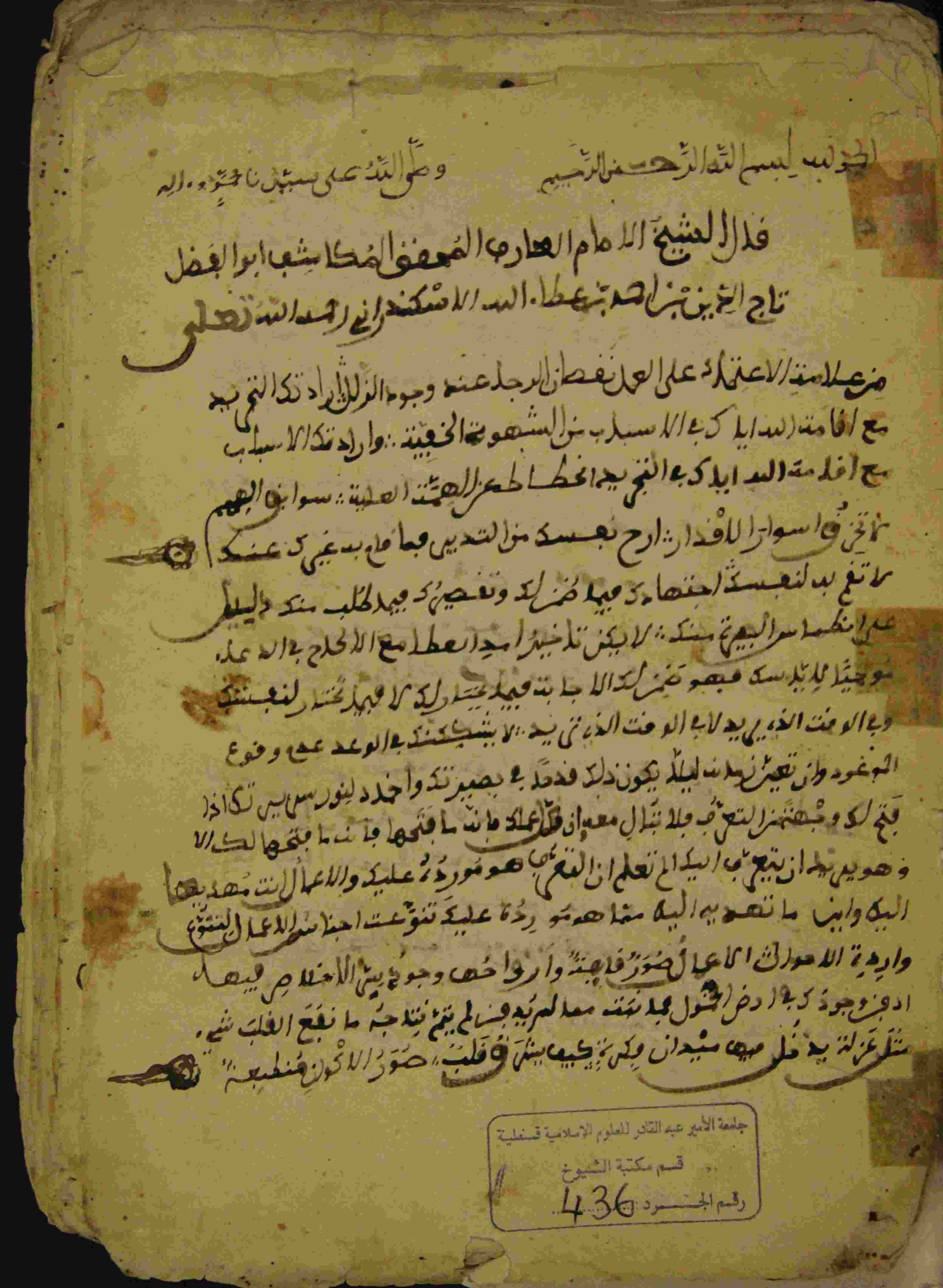 Description: أوله : " بعد البسملة، قال الشيخ من علامة الإعتماد على العمل نقصان الرجاء عند وجود الزلل ارادتك لتجريد مع إقامة الله.../ آخره : " فتحققت عظمة الإسرار فكيف تخفى وأنت الظاهر أم كيف تغيب وأنت الحاضر "، نوع الخط مغربي، التجليد غير مجلد، حالة المخطوط متوسطة، بداية المخطوط في الورقة الأولى، نهاية المخطوط في الورقة 16، كان الفراغ منه يوم 17 رمضان سنة 1205 هـ.، المداد أسود عادي، بعض الكلمات على الهامش، أثرت عليه الرطوبة، المخطوط مرقمن، رقم المخطوط 436 م، مصدر المخطوط : مكتبة الشيوخ ؛ المراجع والمصادر : الأعلام 1/213، مداخل المؤلفين 31.