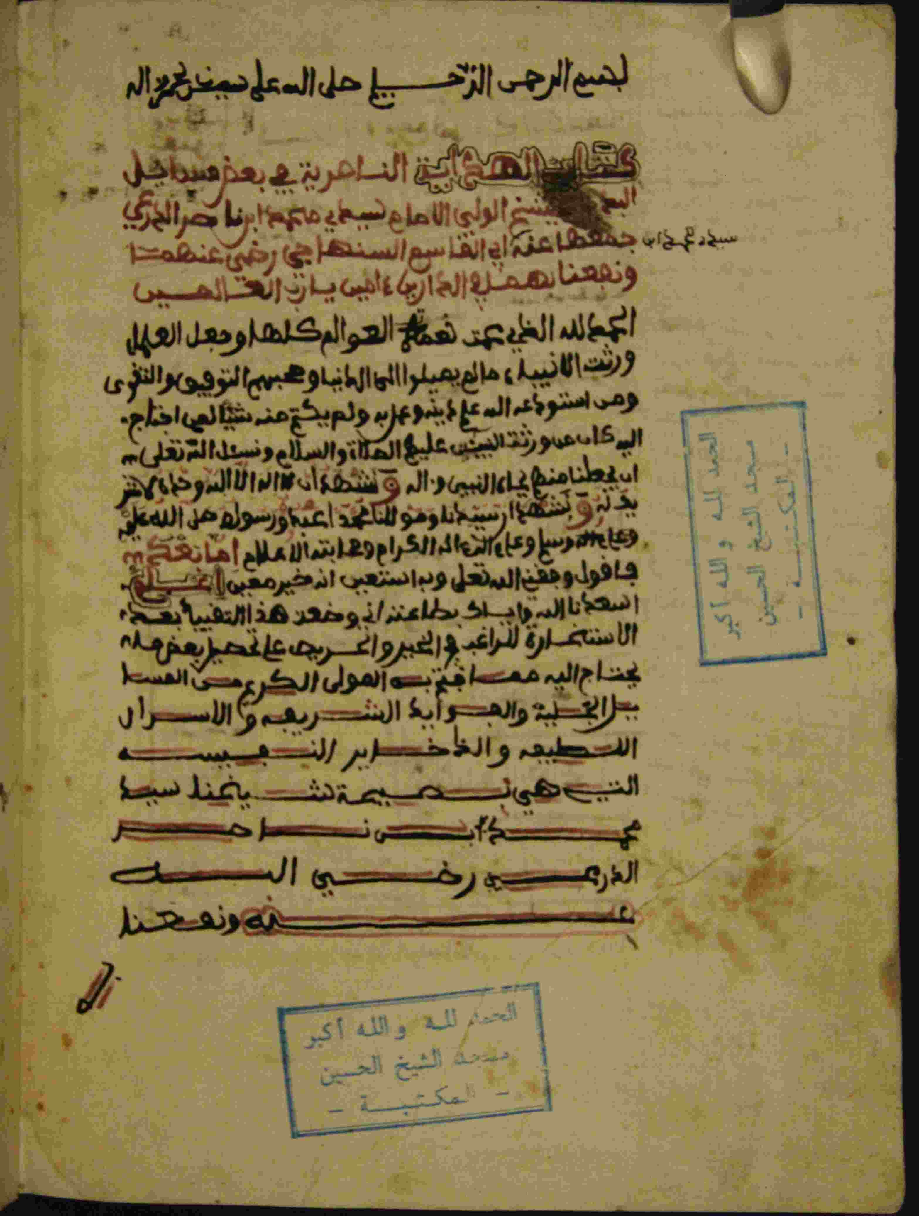 | Description: | أوله : " الحمد لله الذي عمت نعمته العوالم كلها وجعل العلماء ورثت الأنبياء مالم يميلوا إلى الدنيا وصحبهم التوفيق والتقوى..."/آخره : " والصلاة والسلام على سيد المرسلين وعلى آله و... طاعته أجمعين والحمد لله رب العالمين إنتهى ماهو المرغوب من تهذيب ماهو المكتوب "، نوع الخط مغربي، التجليد عادي، حالة المخطوط جيدة، عليه بعض الحواشي والتصحيحات، جمعها محمد بن أبي القاسم الصنهاجي، بداية المخطوط في الورقة الثانية، نهاية المخطوط في الورقة 64، المخطوط مرقمن، رقم المخطوط 682 م، مصدر المخطوط : زاوية الشيخ الحسين سيدي خليفة (ميلة) ؛ المراجع والمصادر : الأعلام خير الدين الزركلي (2/ 258). |
