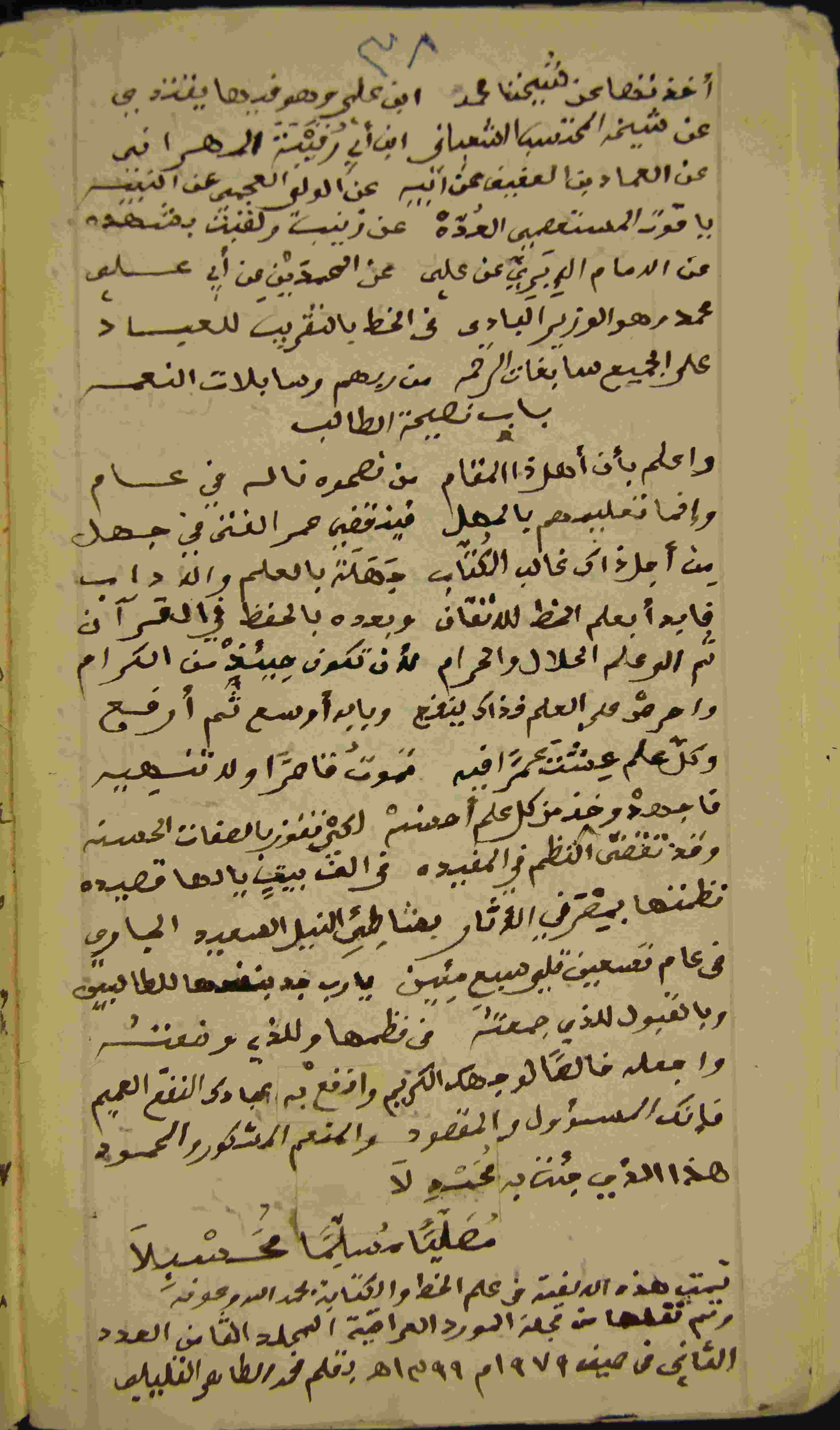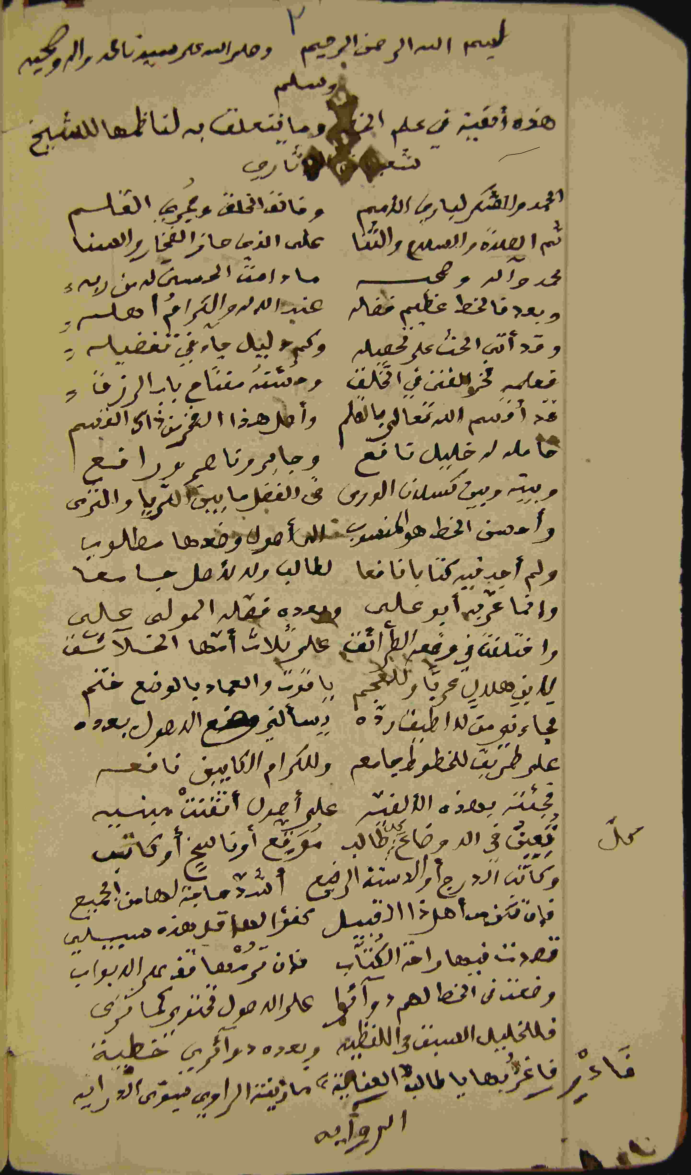 Description: أوله : " الحمد والشكر لباري الأمم * وخالق الخلق ومجري القلم "/آخره : " هذا الذي جئت به محمد لا * مصليا مسلما محسبلا "، نوع الخط مشرقي، التجليد عادي، حالة المخطوط حسنة، نقل هذه الألفية من مجلة المورد العراقية الشيخ محمد الطاهر التليلي القماري يوم الثاني من جمادى الثانية سنة 1400هـ. الموافق لـ 17 أفريل 1980 م.، في نهاية المخطوطة ذكر الناقل تراجم لبعض أعلام وردت في هذه المخطوطة ، سنة التأليف 790 هـ.، بداية المخطوط في الورقة الأولى، نهاية المخطوط في الورقة 19، المخطوط مرقمن، رقم المخطوط 951 م، مصدر المخطوط : مكتبة الشيخ محمد الطاهر التليلي القماري.