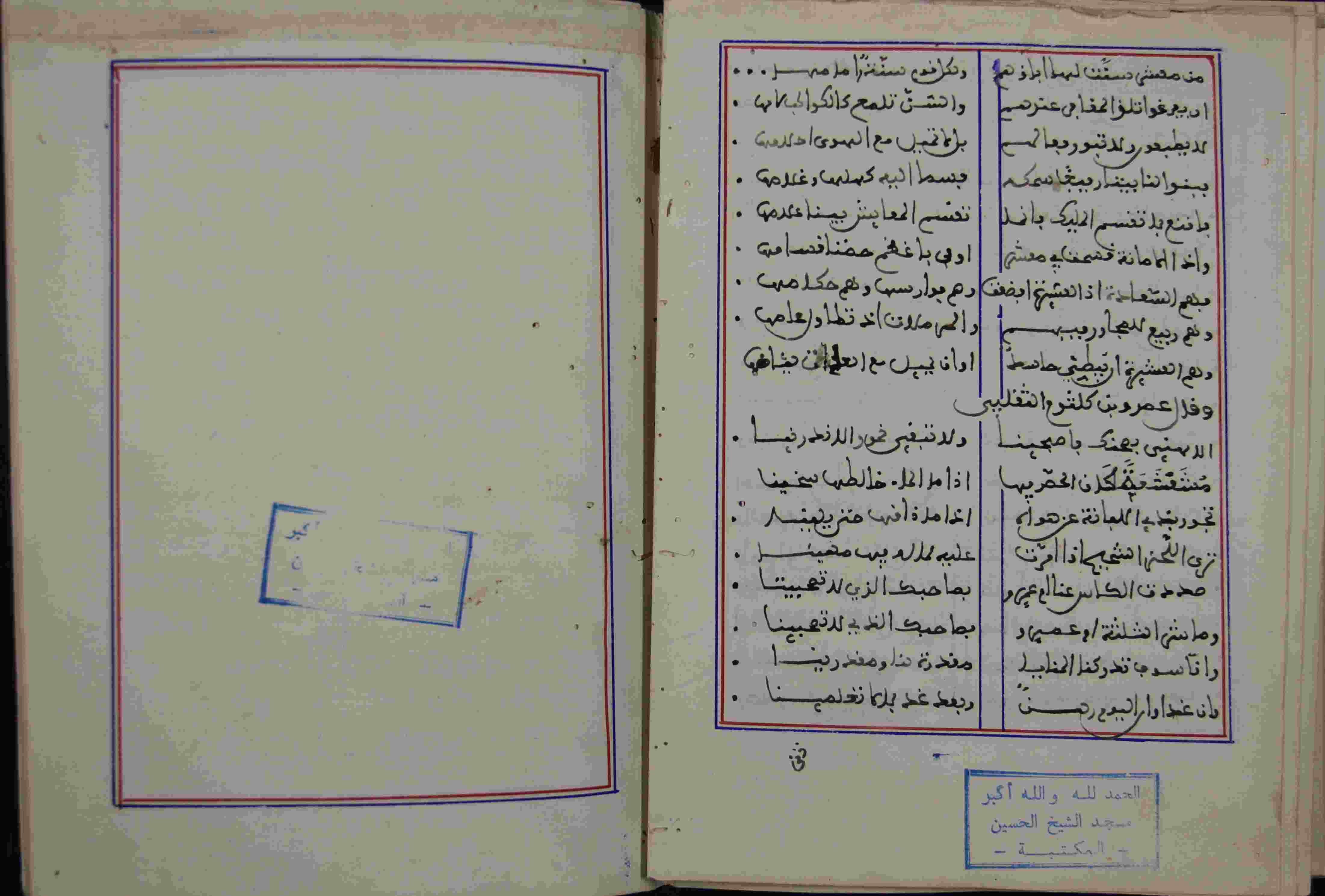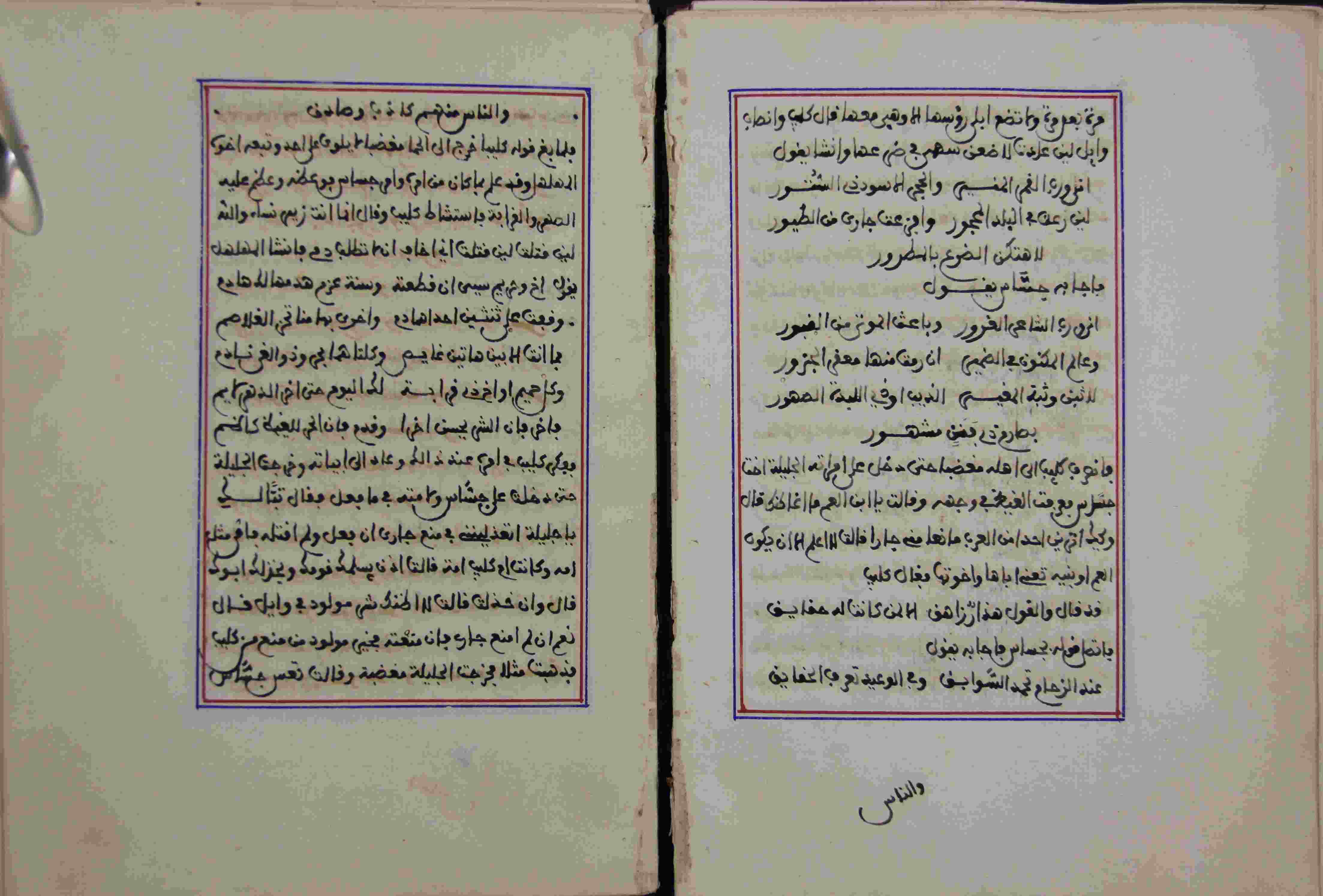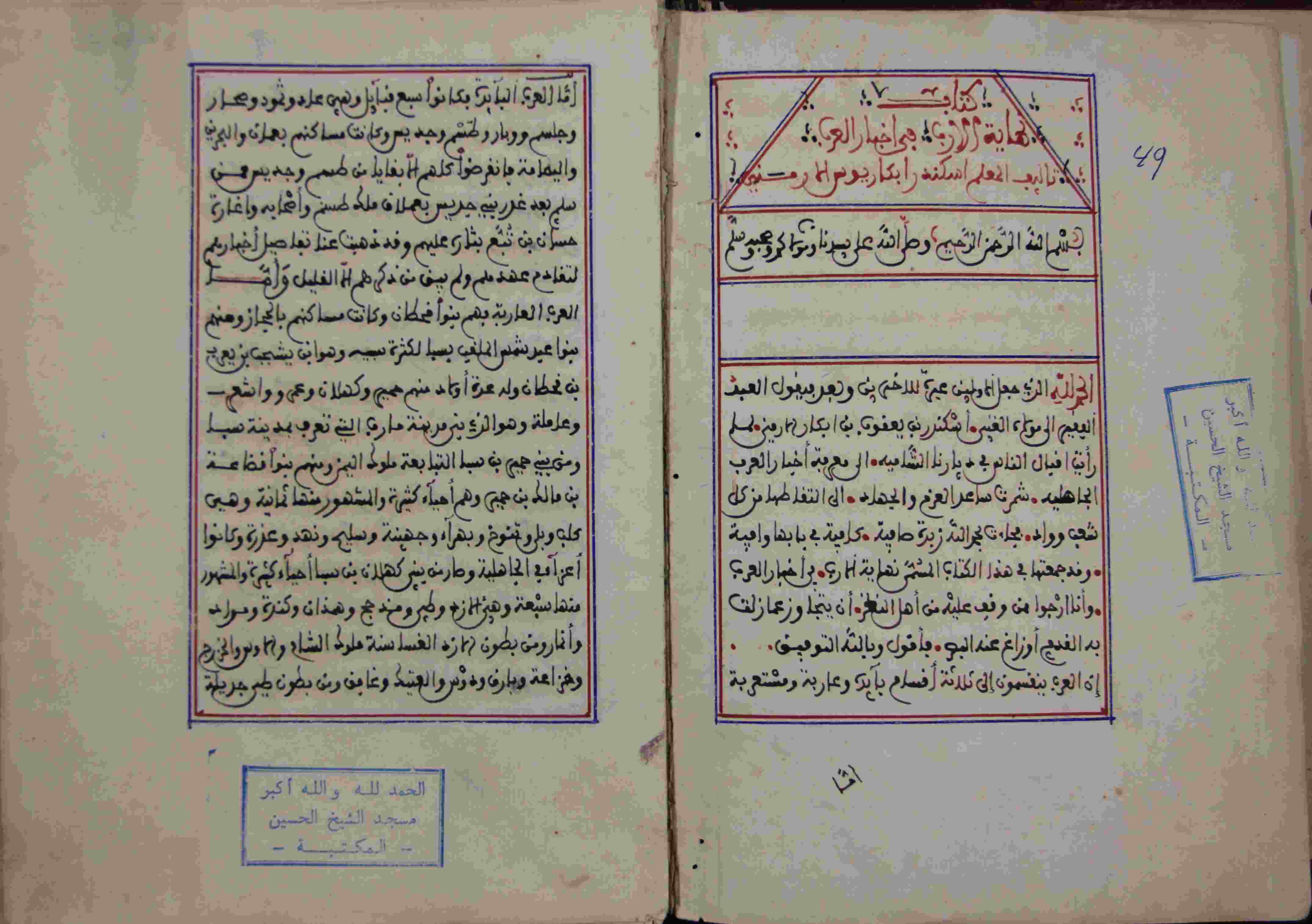| Description: | أوله : " بسم الله الرحمان الرحيم وصلى الله على سيدنا ومولانا محمد وصحبه وسلم الحمد لله الذي جعل الأولين عبرة للآخرين وبعد فيقول العبد الفقير إلى مولاه..."/آخره : " مبتور الآخر "، نوع الخط مغربي، التجليد مزخرف، حالة المخطوط جيدة، بداية المخطوط في الورقة الثانية، نهاية المخطوط في الورقة 101، المخطوط مرقمن، رقم المخطوط 749 م، مصدر المخطوط : زاوية الشيخ الحسين سيدي خليفة (ميلة) ؛ معجم المؤلفين (2/ 253). |