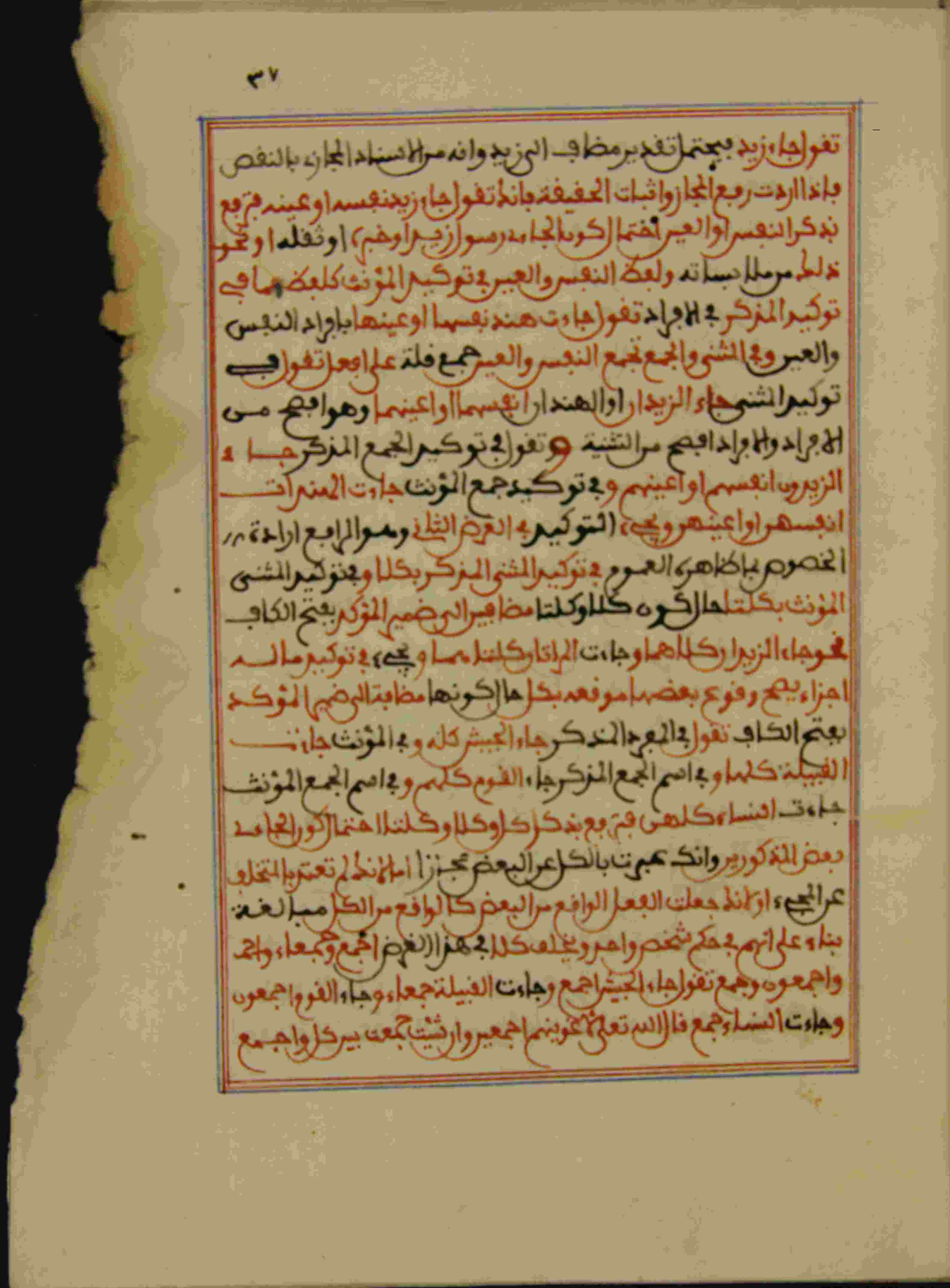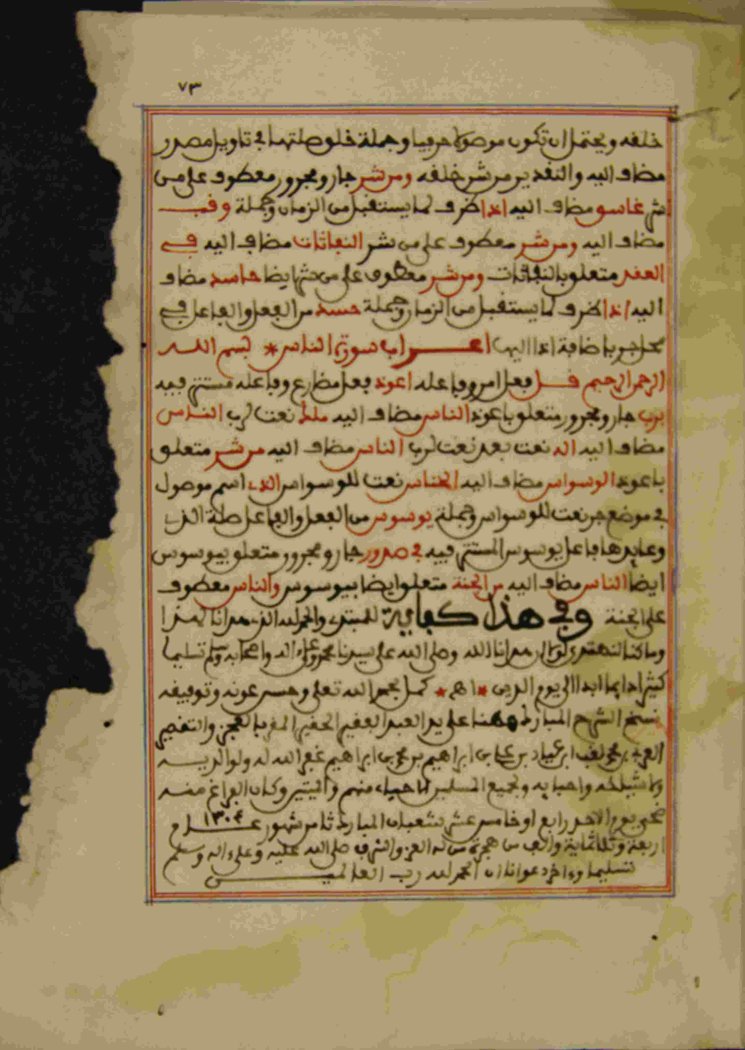 | Description: | أوله : " الحمد لله على جميع الأحوال وأشهد أن لا إله إلا الله وحده لا شريك له المنزه كلامه عن الألفاظ بالحروف في المقال..."/آخره : " وفي هذا القدر كفاية للمبتدئين والحمد لله الذي هدانا لهذا وما كنا لنهتدي لولا أن هدانا الله والحمد لله رب العالمين "، نوع الخط مغربي، حالة المخطوط حسنة، متآكل الأطراف، كان الفراغ منه رابع أو خامس عشر شعبان سنة 1304 هـ.، بداية المخطوط في الورقة الأولى، نهاية المخطوط في الورقة 37، المخطوط مرقمن، رقم المخطوط 630 م، مصدر المخطوط : زاوية الشيخ الحسين سيدي خليفة (ميلة) ؛ المراجع والمصادر : معجم المؤلفين. |