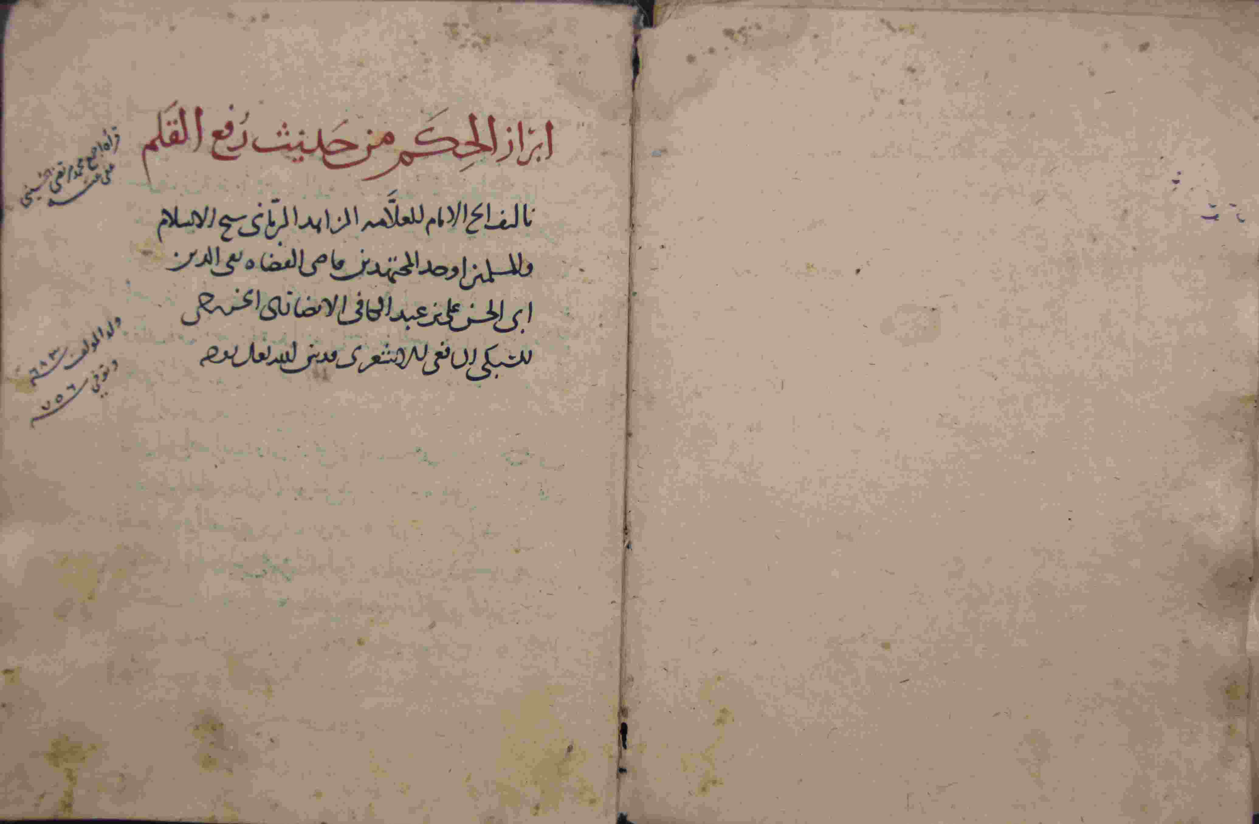 | Description: | أوله : " رب يسر، أخبرنا الحافظ الإمام أبو محمد عبد المؤمن بن خلف بن أبي الحسن بن شرف..."/آخره : " ويظهر أن الخرف رتبة متوسطة بين الاغما والجنون وهي إلى الآغما أقرب والله تعالى أعلم "، نوع الخط مشرقي، التجليد عادي مجلد العقب والحواشي، حالة المخطوط حسنة، عليه آثار الرطوبة، به تعليقات على بالهوامش، اعتمد على نظام التعقيبة في الترتيب، عدد الأوراق الخاصة به 35 ورقة، بداية المخطوط في الورقة 36، نهاية المخطوط في الورقة 70، المخطوط مرقمن، رقم المخطوط 2.6 /29 م، مصدر المخطوط : مكتبة الشيوخ. |