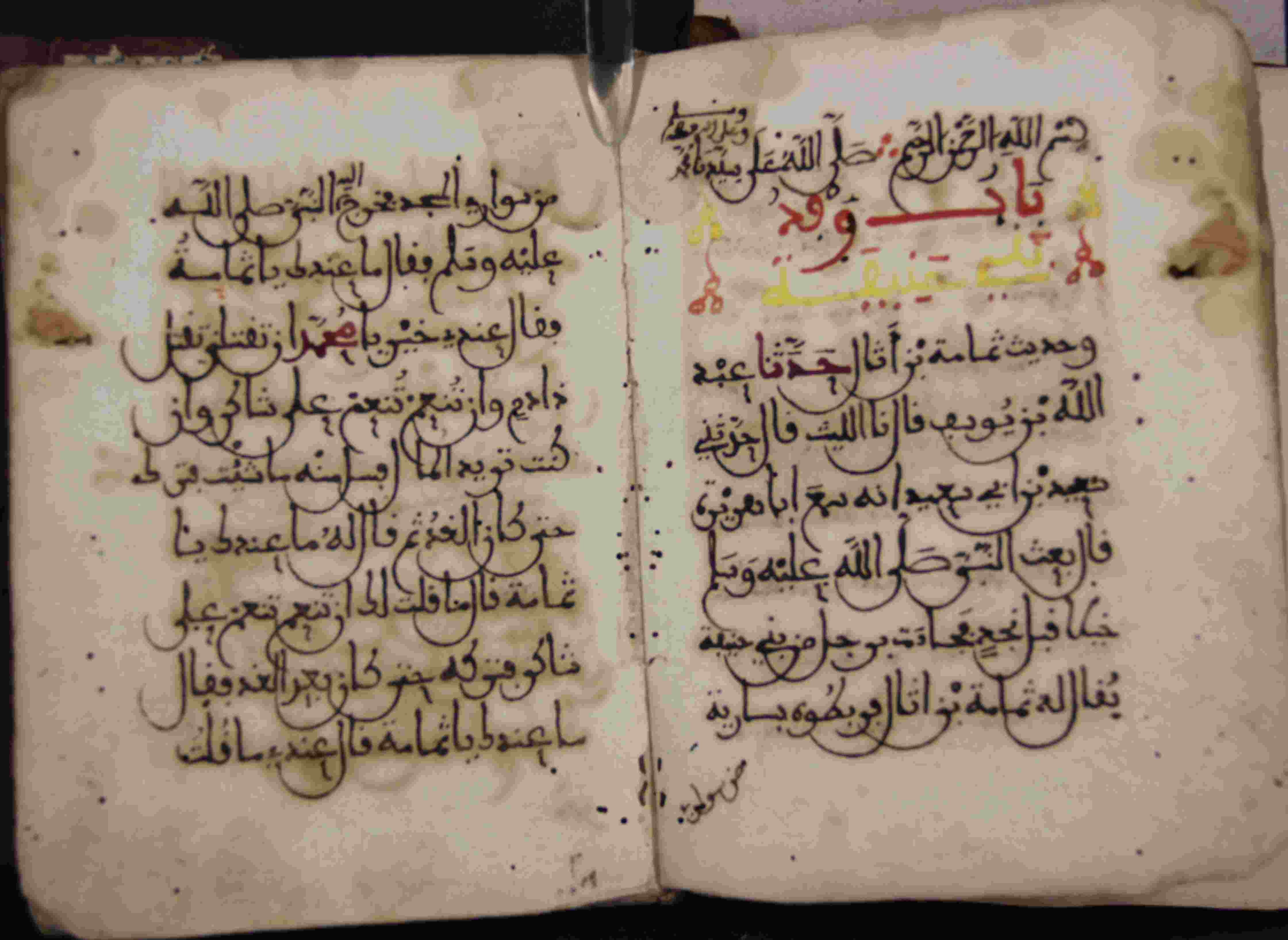 Description: أوله : " بسم الله الرحمن الرحيم صلى الله على سيدنا محمد باب وفد بني حنيفة وحديث تمامة بن أثال... "/آخره : " قال النبي صلى الله عليه وسلم اليمين على المدعى عليه "، نوع الخط مغربي، التجليد مزخرف، حالة المخطوط حسنة، به ثقوب سببها الأرضة، بداية المخطوط في الورقة الثالثة، نهاية المخطوط في الورقة 129، المخطوط مرقمن، رقم المخطوط 784 م، مصدر المخطوط : زاوية الشيخ الحسين سيدي خليفة (ميلة).