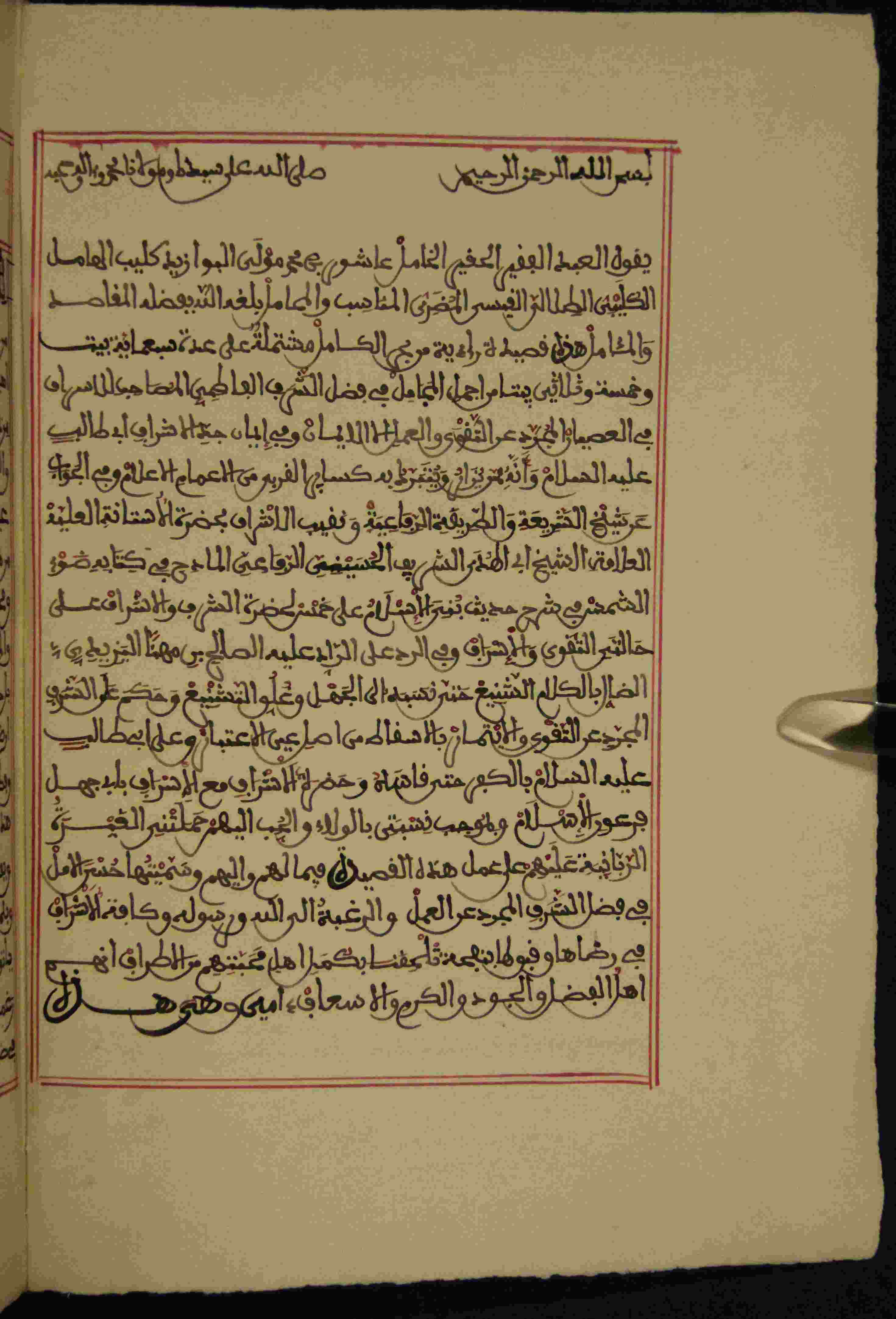 | Description: | أوله : " بعد البسملة، يقول العبد الفقير الحقير الخامل عاشور بن محمد مولى البوازيد كليب الهامل الكليبي الطلالي القيسي المضري المناسب..."/ آخره : " وما الكل إلا شافعون لهم بها ــ لديه ألا تكفي العصاة لو أستدل، وأجمع أهل الحق أن اعتبارهم ــ على الغاية القصوى وأن لم يكن عمل "، نوع الخط مغربي، التجليد منزوع الغلاف، حالة المخطوط حسنة، القصيدة مكتوبة في إطار ملون بالأحمر، بداية المخطوط في الورقة الأولى، نهاية المخطوط في الورقة 22، المخطوط مرقمن، رقم المخطوط 570 م، مصدر المخطوط : مكتبة الشيوخ. |