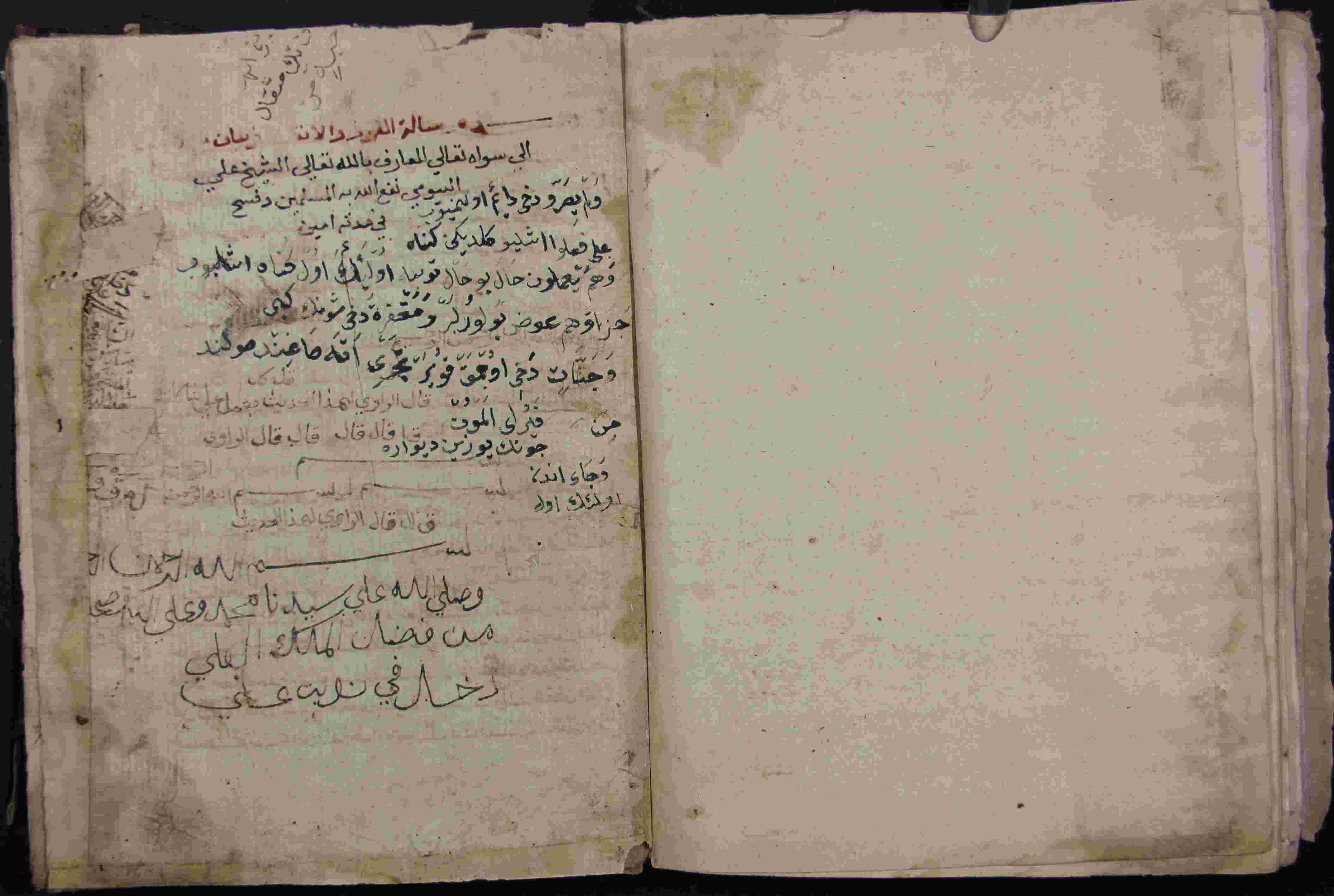 Description: أوله : " الحمد لله الذي أفرد قلوب أحبابه لوحدانيته وترك ما سواه والصلاة والسلام على من أحبه واجتباه وبعد..."/آخره : " وفي هذا القدر كفاية لمن وفقه اله تعالى وصلى الله على سيدنا محمد وعلى آله وصحبه وسلم تمت الرسالة بحمد الله وعونه "، نوع الخط مغربي، التجليد عادي، حالة المخطوط حسنة، عليه آثار الرطوبة، اتبع نظام التعقيبة في الترتيب، عدد الأوراق الخاصة به 18 ورقة، بداية المخطوط في الورقة 63، نهاية المخطوط في الورقة 81، المخطوط مرقمن، رقم المخطوط 4.10 /2 م، مصدر المخطوط : مكتبة الشيخ نعيم النعيمي ؛ المراجع والمصادر : معجم المؤلفين (7/56).