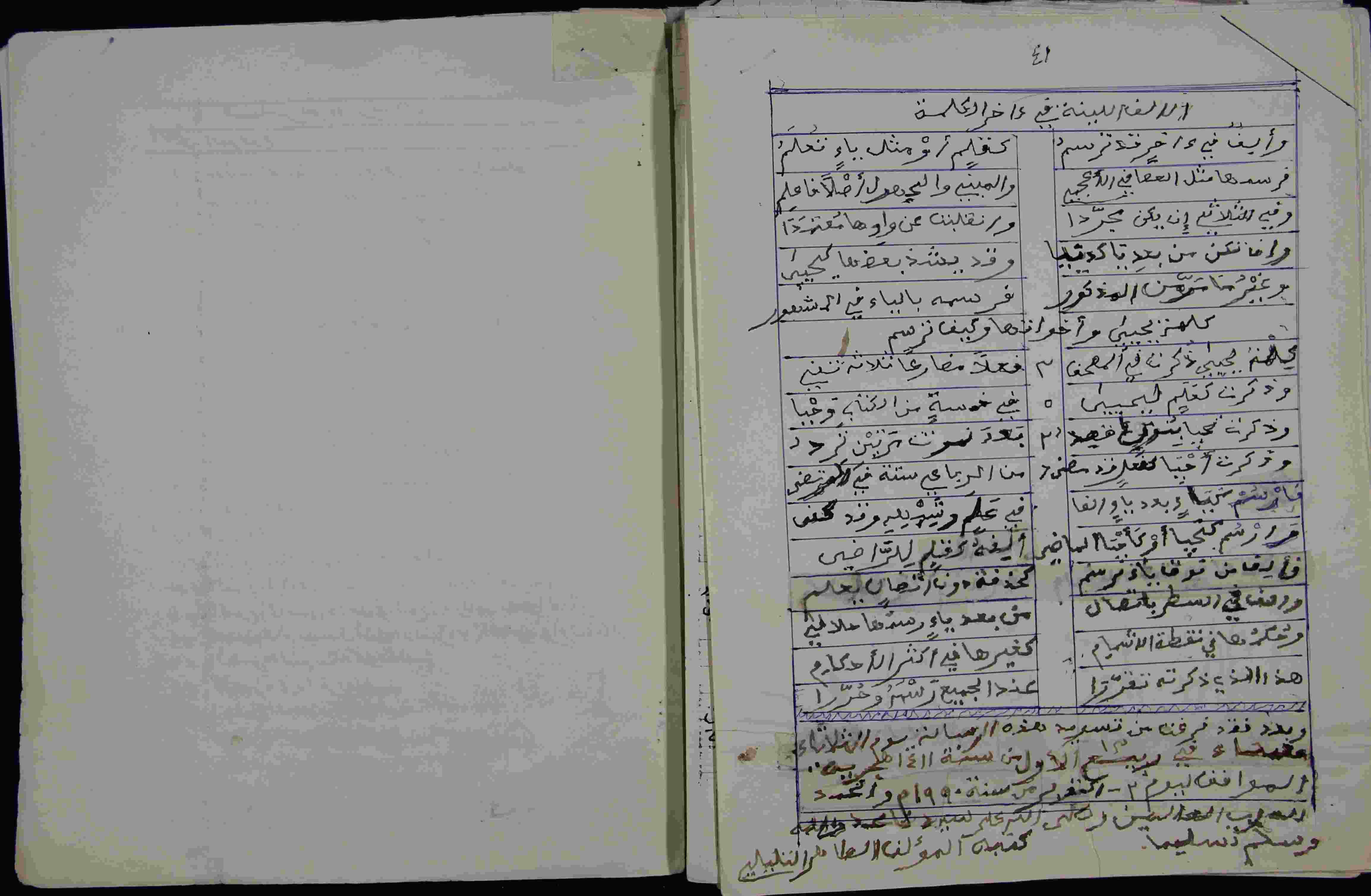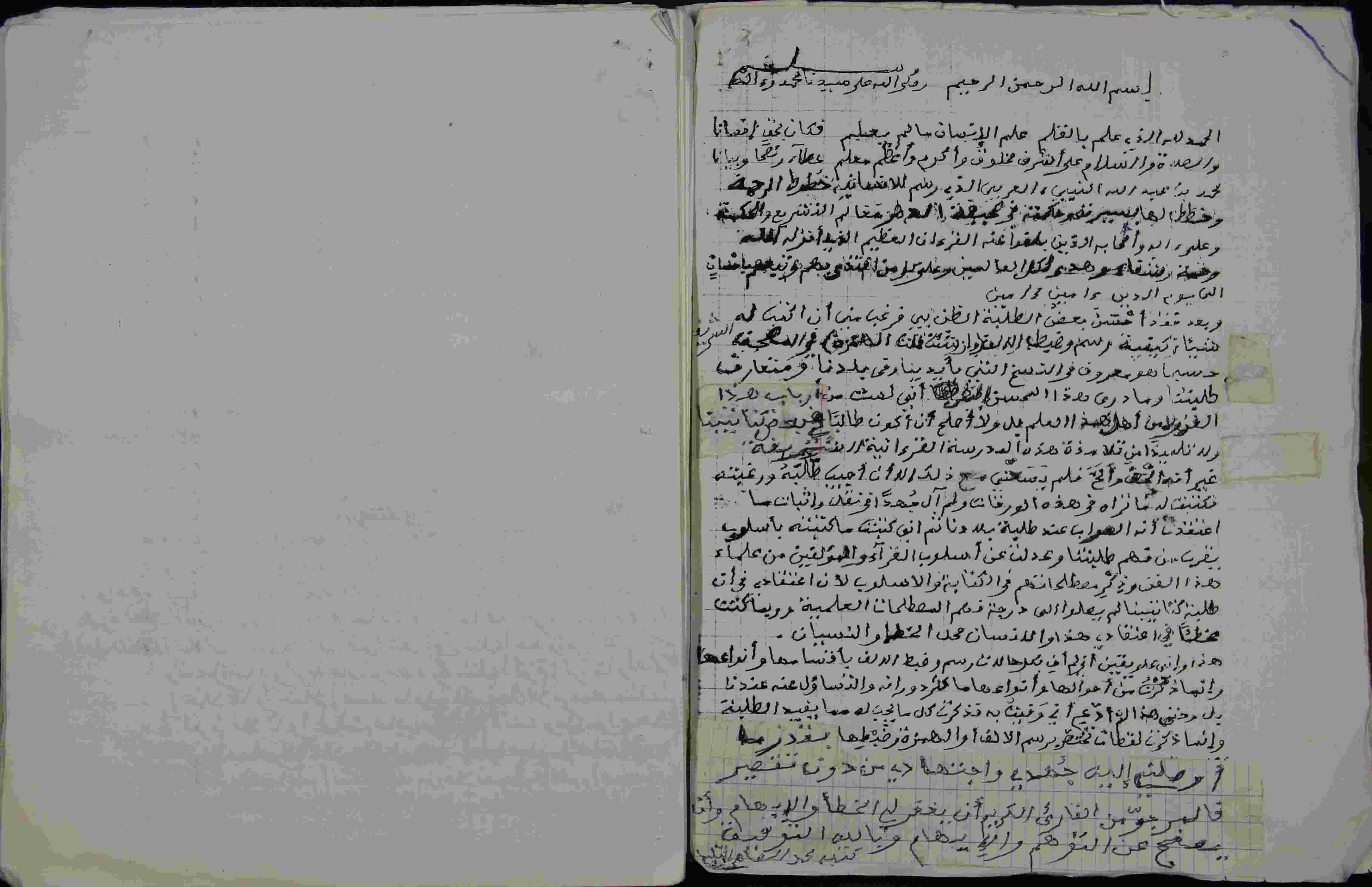 | Description: | أوله : " بسم الله الرحمن الرحيم وصلى الله على سيدنا محمد وآله الحمد لله الذي علم بالقلم علم الإنسان مالم يعلم فكان بحق إنسانا..."/أوله : " هذا الذي ذكرته تقررا * عند الجميع رسمه وحررا "، نوع الخط مشرقي، التجليد غير مغلف، حالة المخطوط متوسطة، الرسالة صورة طبق الأصل، في اللوحة الأخيرة فهرس الرسالة، فرغ من تسويد هذه الرسالة يوم الثلاثاء مساء 13 ربيع الأول من سنة 1411 هـ. الموافق لـ 1990 م.، بداية المخطوط في الورقة الرابعة، نهاية المخطوط في الورقة 45، المخطوط مرقمن، رقم المخطوط 601 م، مصدر المخطوط : مكتبة الشيخ محمد الطاهر التليلي القماري. |