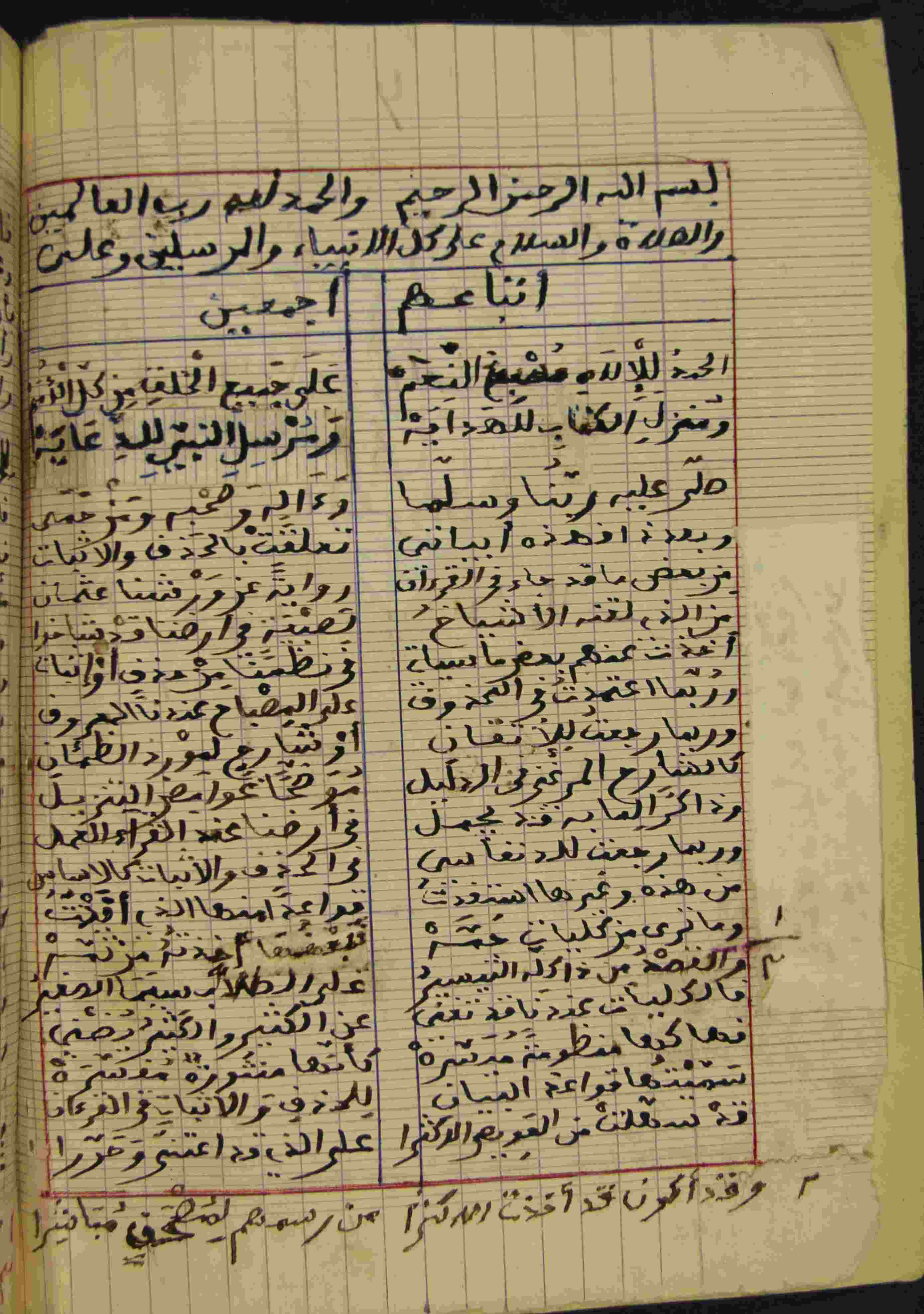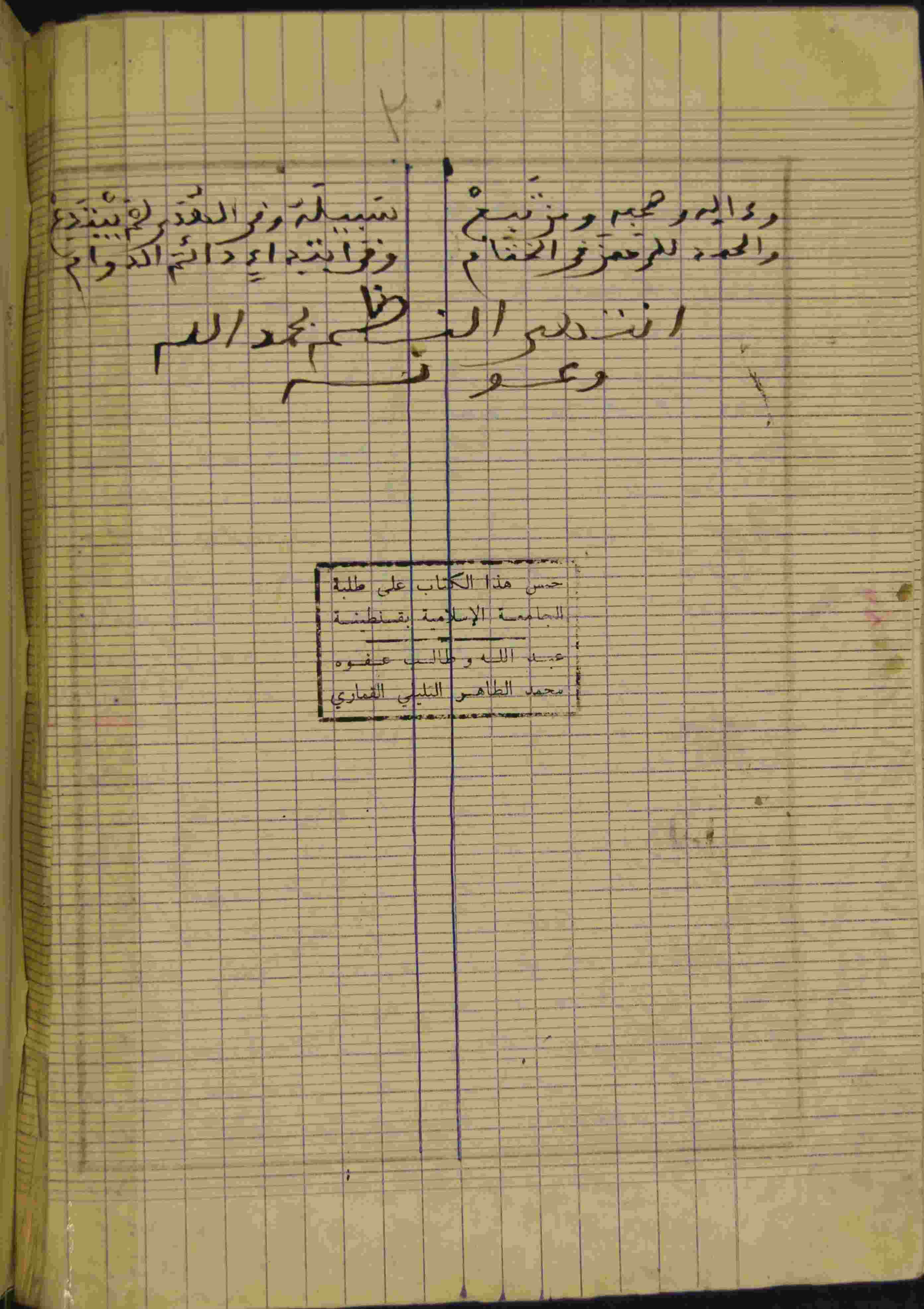 Description: أوله : " الحمد للإ لاه مسبح النعم * على جميع الخلق من كل الأمم..."/آخره : " والحمد للرحمان في الختام * وفي ابتداء دائم الدوام "، النص مكتوب في كراس، نوع الخط مشرقي، التجليد عادي، حالة المخطوط متوسطة، بداية المخطوط في الورقة الأولى، نهاية المخطوط في الورقة 10، المخطوط مرقمن، رقم المخطوط 608 م، مصدر المخطوط : مكتبة الشيخ محمد الطاهر التليلي القماري.