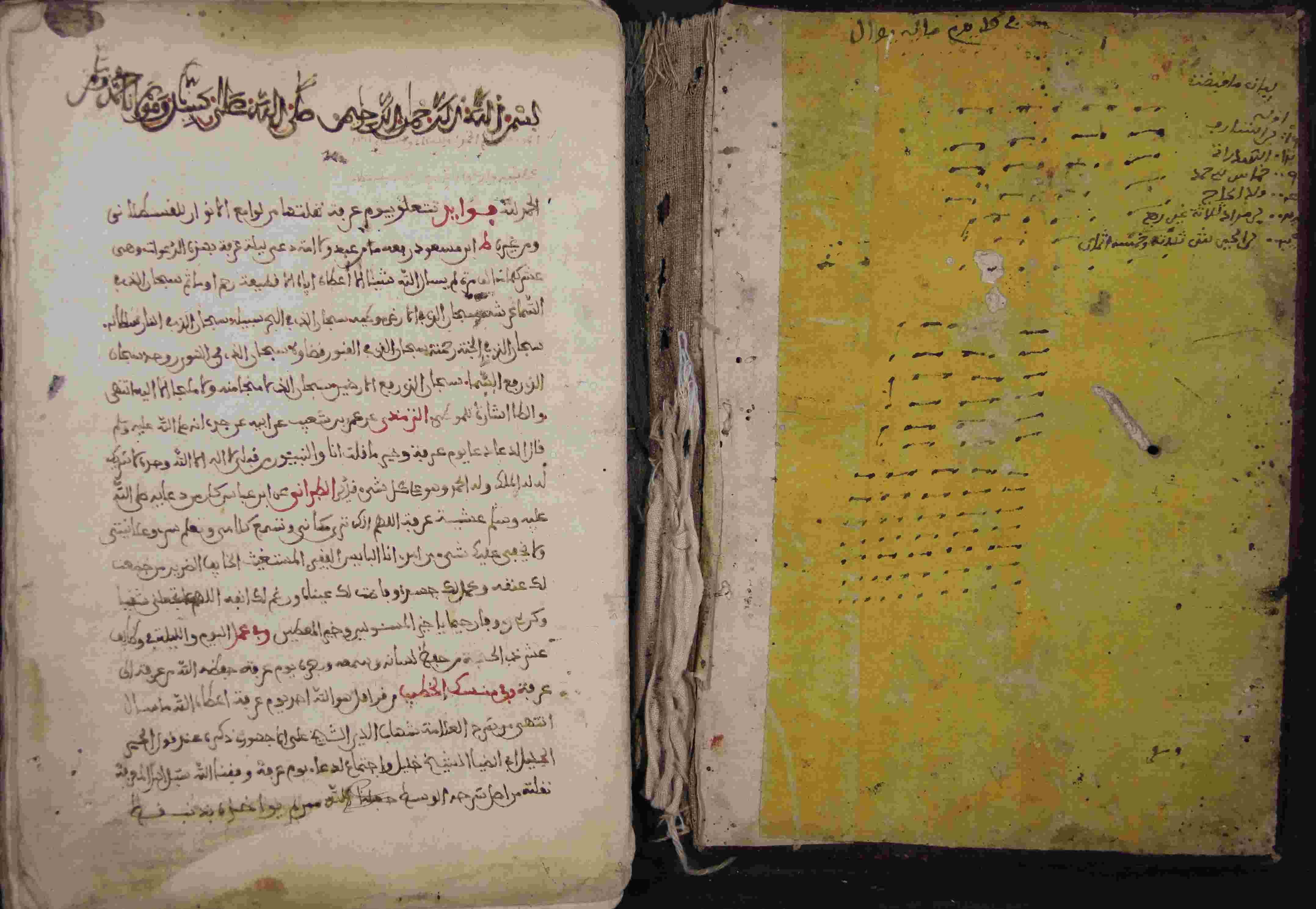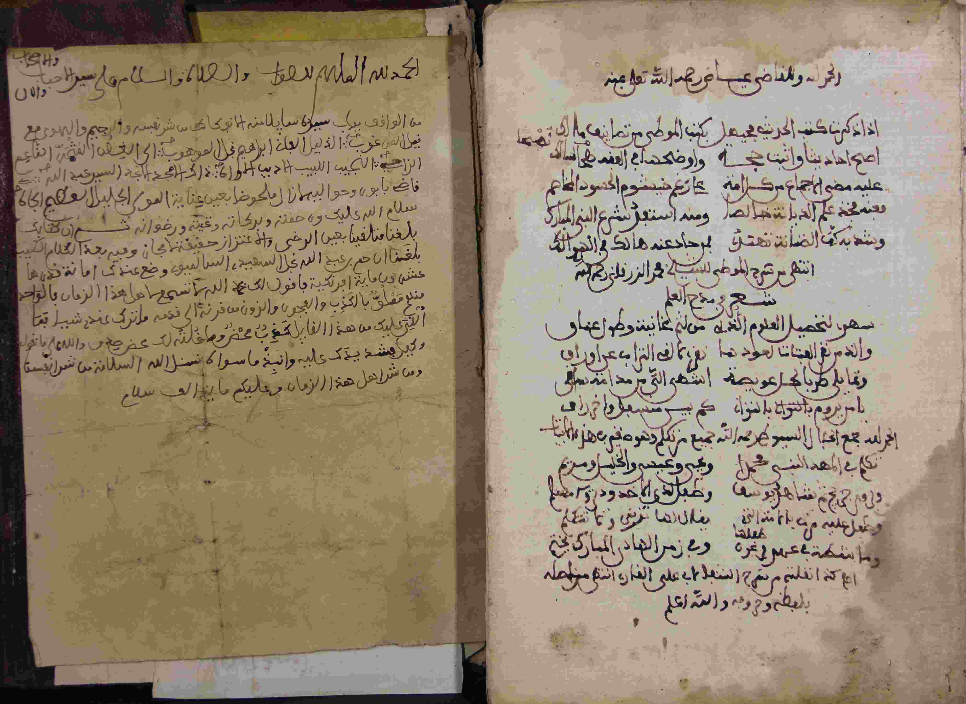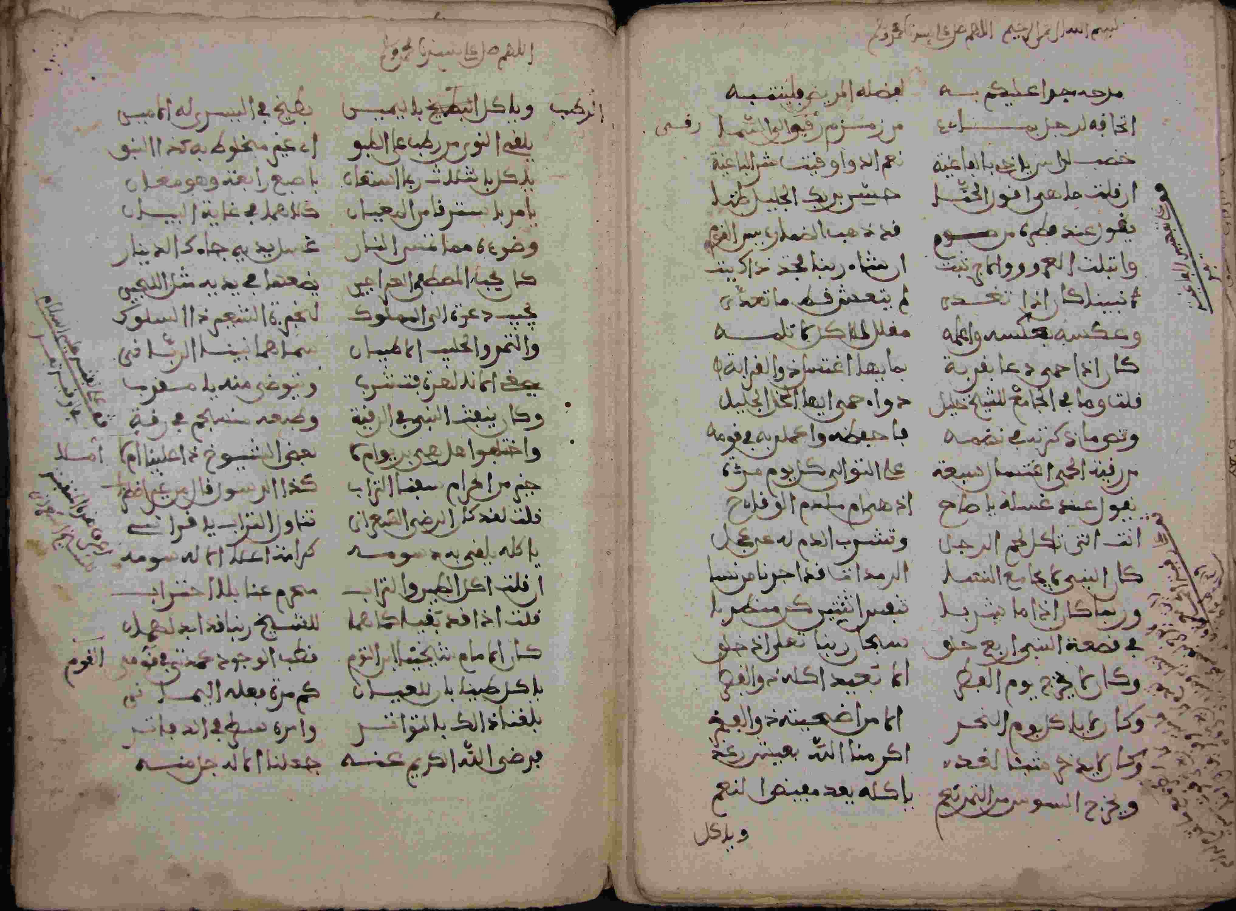 | Description: | أوله : " بعد البسملة والحمدلة فوائد تتعلق بيوم عرفة نقلتها من لوامع الأنوار للقسطلاني ومن غيره إبن مسعود رفعه ما عبد ولا إمتد عبر ليلة عرفة بهذه الدعوات وهي..."/آخره : " إنتهى من شرح الموطى للشيخ محمد الزرقاني رحمه الله...نقلته من شرح الشفا باب على القاريء إنتهى من أصله بلفظة وخروجه والله أعلم "، نوع الخط مغربي، التجليد مزخرف، حالة المخطوط جيدة، تعليقات على الحواشي، هناك روايات داخل جلد المخطوط، المسطرة ما بين 19-20 سطر، به أوراق مضافة بها أحاديث، بداية المخطوط في الورقة الأولى، نهاية المخطوط في الورقة 56، المخطوط مرقمن، رقم المخطوط 692 م، مصدر المخطوط : زاوية الشيخ الحسين سيدي خليفة (ميلة) ؛ المراجع والمصادر : الأعلام خير الدين الزركلي (2/ 143). |