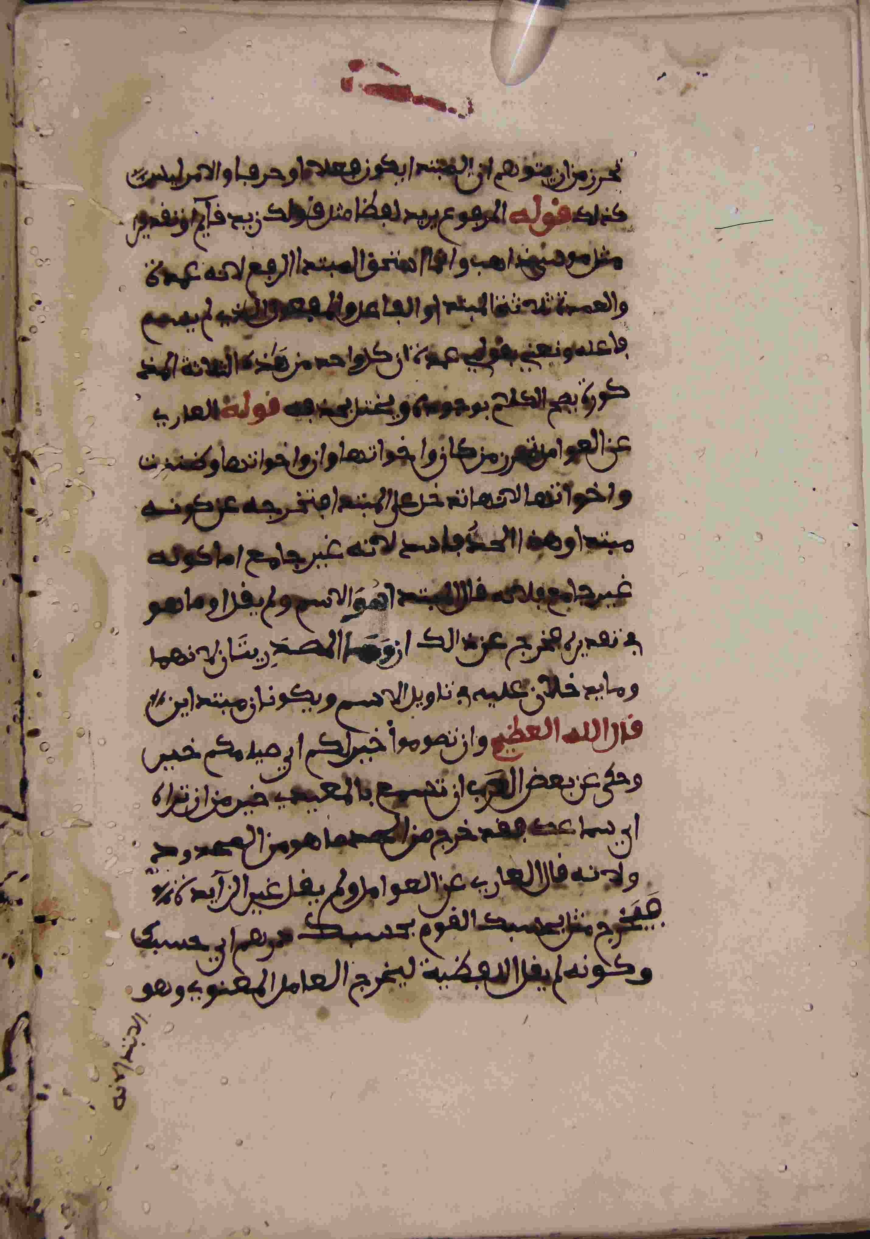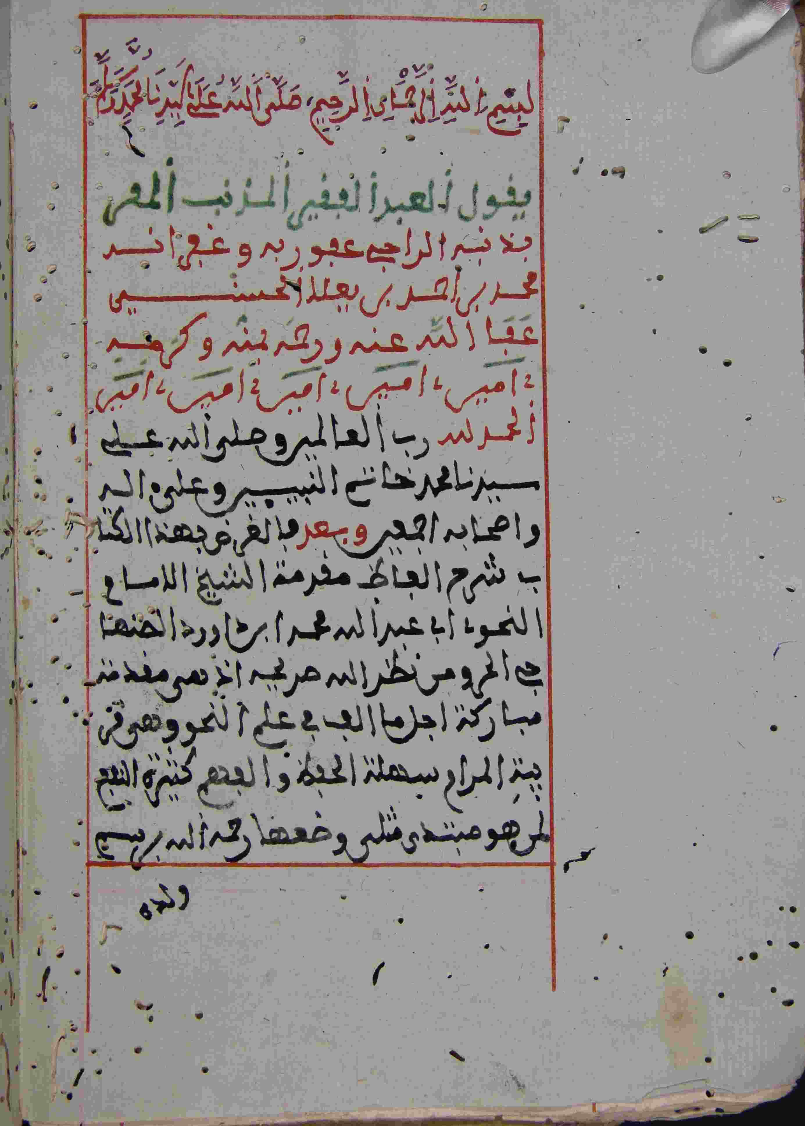 | Description: | أوله : " بعد البسملة والحمدلة بالغرض بهذا الكتاب بشرح ألفاظ مقدمة الشيخ النحوي أبي عبد الله محمد إبن داوود الصنهاجي..."/آخره : " من حيث الهم لم ينووا بها الإنفصال والله تعالى أعلم وهو حسبنا ونعم الوكيل ولا حول ولا قوة إلا بالله العلي العظيم "، نوع الخط مغربي، غير مجلد، حالة المخطوط متوسطة، عليه تمليكات عبد الكريم الفكون, خضع لعملية ترميم, الغلاف متآكل, عليه تعليقات في الهامش, بداية المخطوط في الورقة الثالثة، نهاية المخطوط في الورقة 101، المخطوط مرقمن، رقم المخطوط 708 م، مصدر المخطوط : زاوية الشيخ الحسين سيدي خليفة (ميلة) ؛ المراجع والمصادر : إيضاح المكنون لإسماعيل البغدادي (2/ 541). |