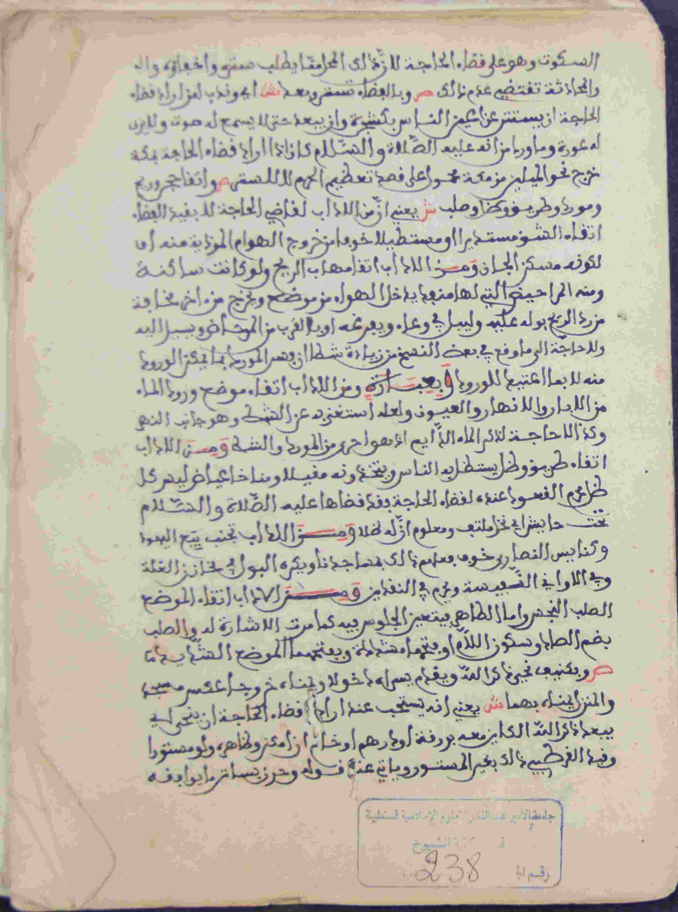 Description: أوله : " السكوت وهو على قضاء الحاجة لأن ذلك المحل منا يطلب ستره وإخفاءه والمحادثة تقتضي..."/آخره : " إنتهى أواخر ذي القعدة "، نوع الخط نسخي مشرقي، التجليد عادي، حالة المخطوط حسنة، مبتور الأول والآخر، تعليقات في الهامش، بداية المخطوط في الورقة الأولى، نهاية المخطوط في الورقة 135، المخطوط مرقمن، رقم المخطوط 238 م، مصدر المخطوط : مكتبة الشيوخ ؛ المراجع والمصادر : الأعلام 7/118، مداخل المؤلفين 98 .