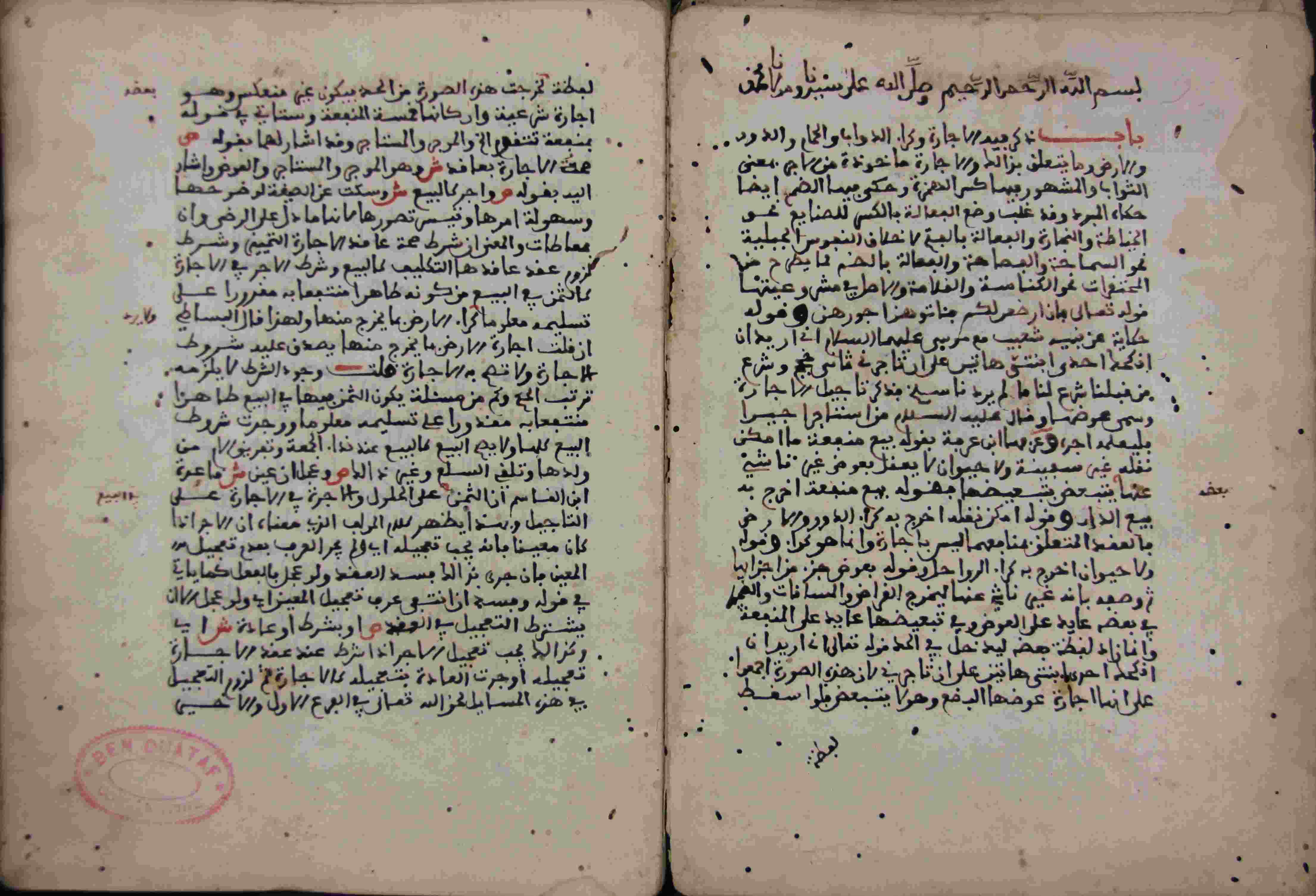 Description: بسم الله الرحمن الرحيم وصلى الله على سيدنا ومولانا محمد باب ذكر فيه الإجارة وكراء الدواب والحمام..."/آخره : " مبتور الآخر...إذا التزم عدم الرجوع فيها هل تلزم أولا قولان "، نوع الخط مغربي، التجليد مزخرف، حالة المخطوط حسنة، به ختم بن وطاف قسنطينة، أتبع في ترتيب أوراقه نظام التعقيبة والأرقام، في اللوحة الأولى فهرس الكتاب، تملكه بالشراء الصحيح القاضي بحضرة قسنطينة عام 1304 هـ.، بداية المخطوط في الورقة الرابعة، نهاية المخطوط في الورقة 272، المخطوط مرقمن، رقم المخطوط 325 م، مصدر المخطوط : مكتبة الشيخ نعيم النعيمي ؛ المراجع والمصادر : الأعلام خير الدين الزركلي (14/ 108).
