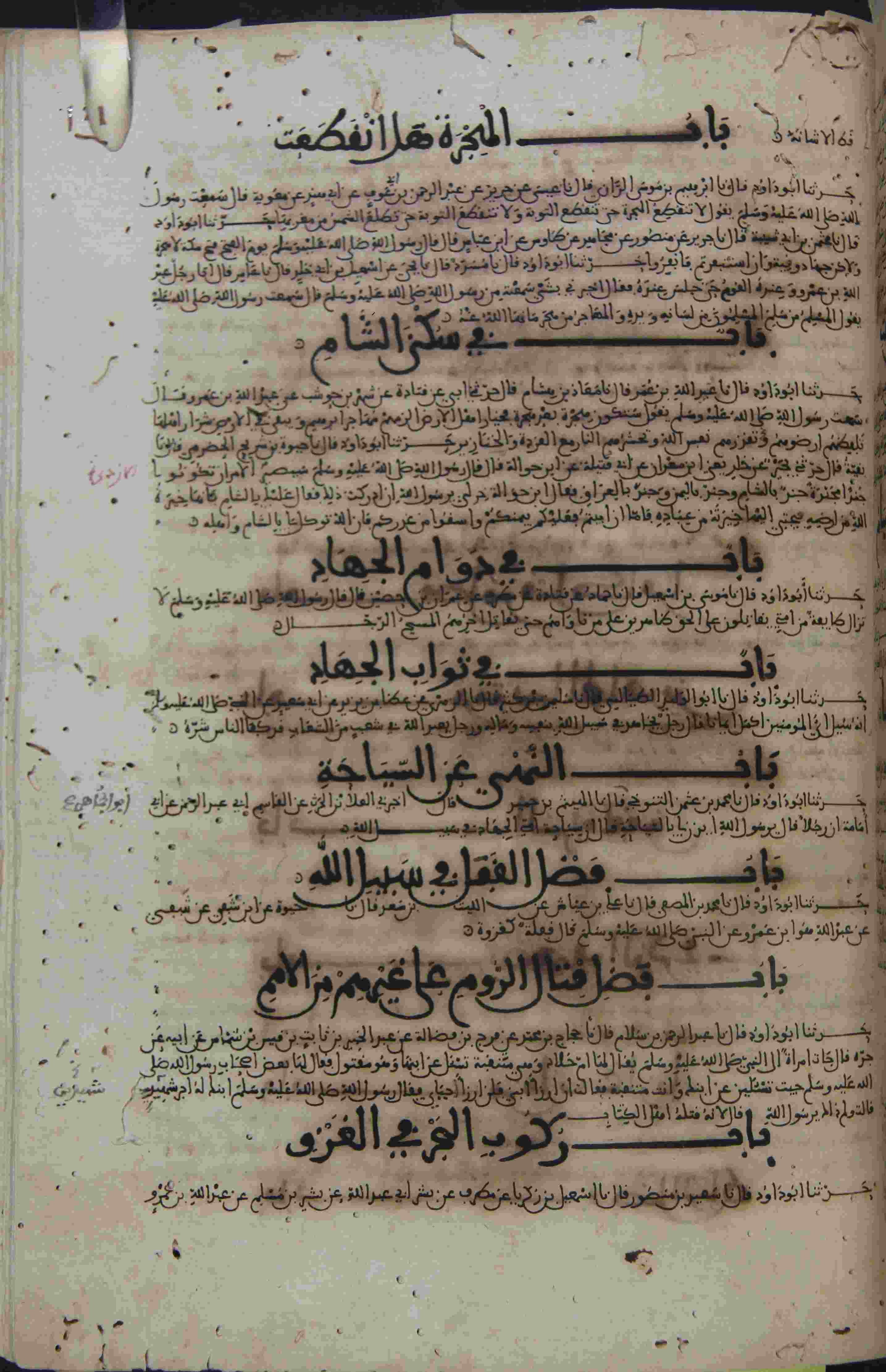 | Description: | أوله : " كتاب الطهارة، باب التخلي عند قضاء الحاجة..."/آخره : " باب في الأمر والنهي "، نوع الخط مغربي، التجليد مزخرف، حالة المخطوط متوسطة، كان الفراغ من نسخه على يد الحاج الزهري إمام مسجد إشبيليا، في الورقة الثانية تملك محمد لفكون سنة 1213هـ.، به أكل الأرضة وآثار الرطوبة، بهامشه تعليقات، برواية ابن داسة، بداية المخطوط في الورقة الثالثة، نهاية المخطوط في الورقة 216، المخطوط مرقمن، رقم المخطوط 779 م، مصدر المخطوط : زاوية الشيخ الحسين سيدي خليفة (ميلة) ؛ المراجع والمصادر : الأعلام للزركلي (3/ 122). |