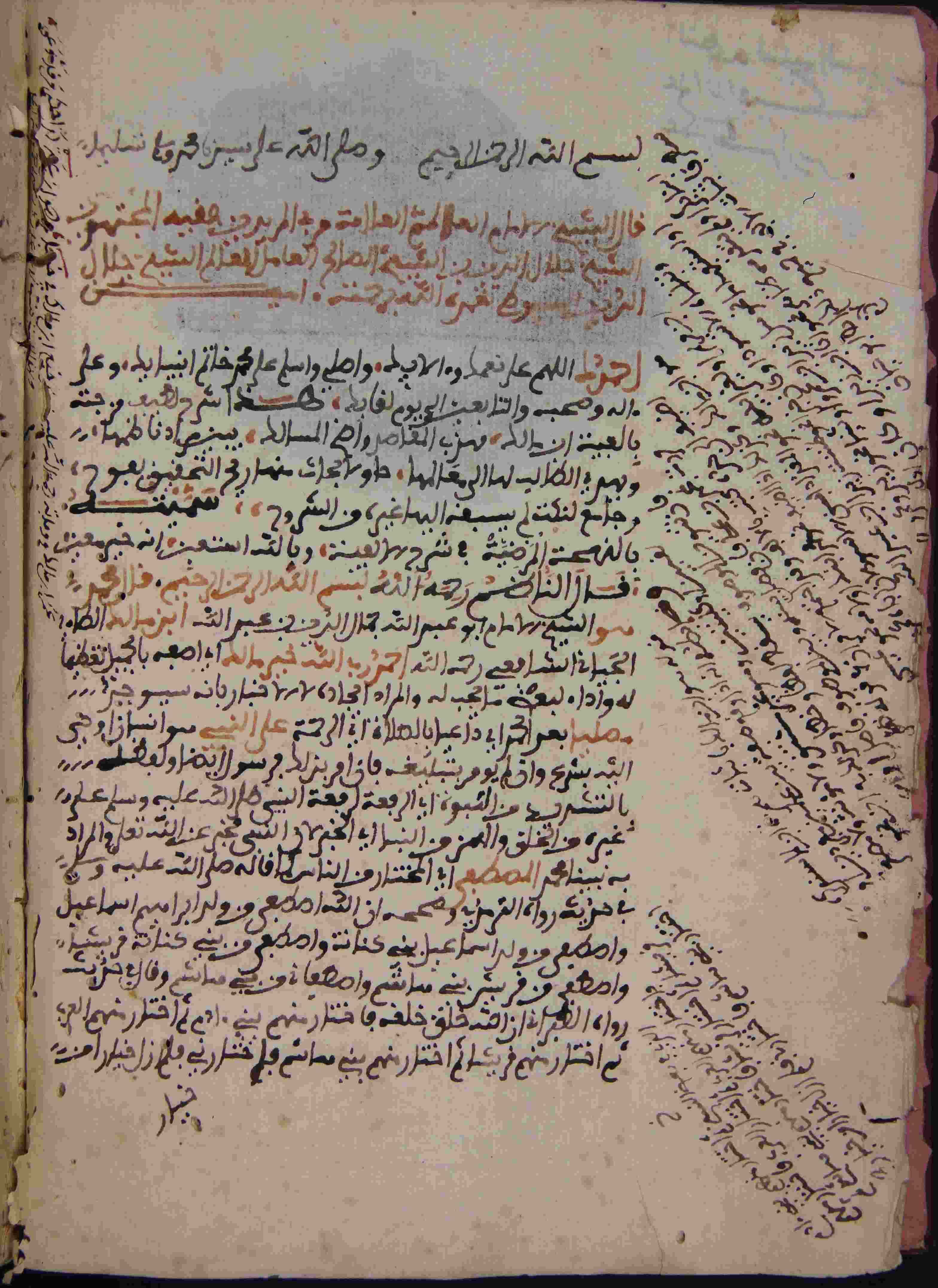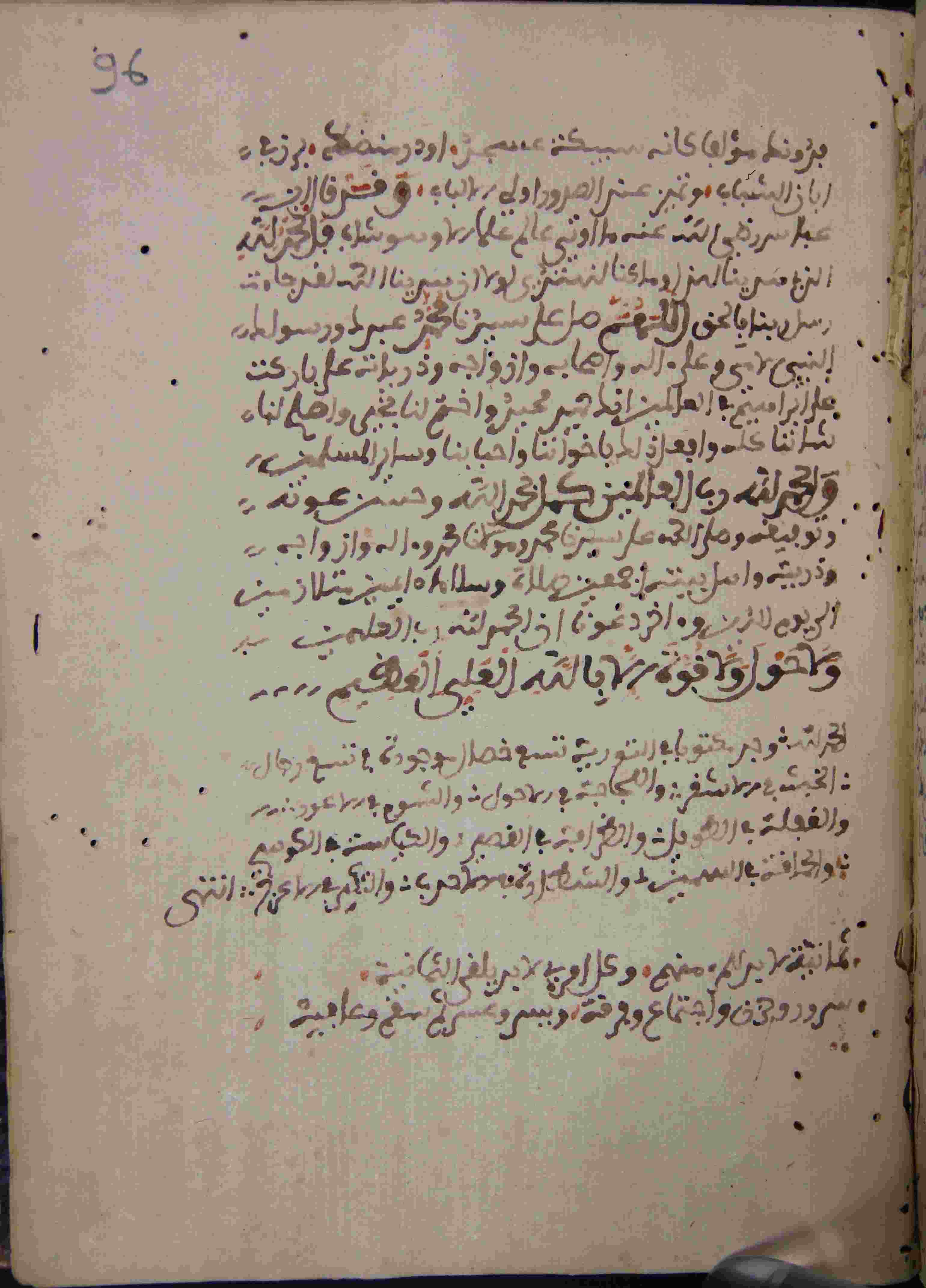 | Description: | أوله : " أحمدك اللهم على نعمك وآلائك وأصلي وأسلم على محمد خاتم أنبيائك وآله وصحبه إلى يوم لقائك..."/آخره : " وذريته وأهل بيته أجمعين صلاة وسلام أتمين متلازمين إلى يوم الدين وآخر دعوانا أن الحمد لله رب العالمين "، نوع الخط مغربي، التجليد عادي، حالة المخطوط جيدة، عليه بعض التعليقات، بداية المخطوط في الورقة الثالثة، نهاية المخطوط في الورقة 98، المخطوط مرقمن، رقم المخطوط 674 م، مصدر المخطوط : زاوية الشيخ الحسين سيدي خليفة (ميلة). |