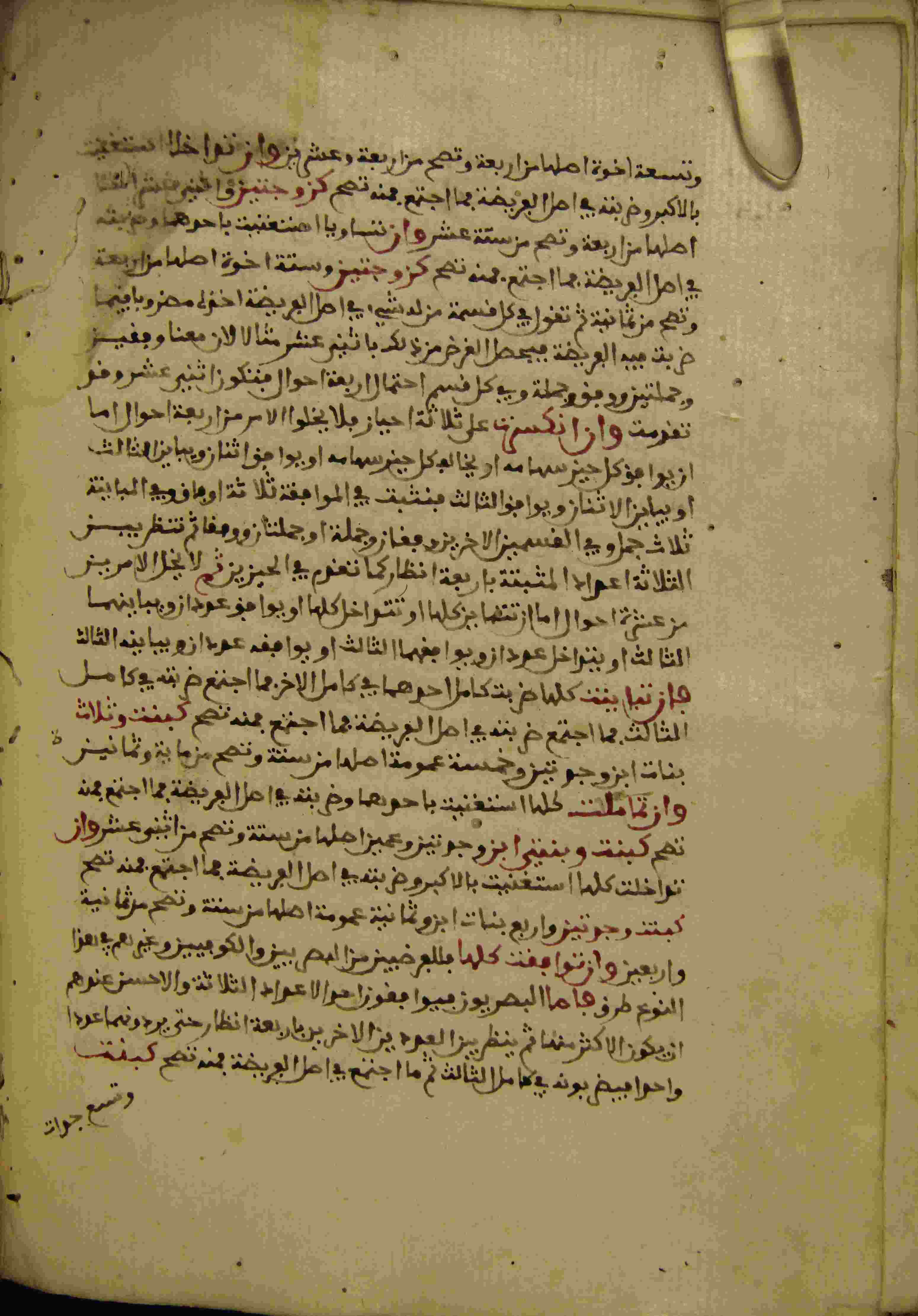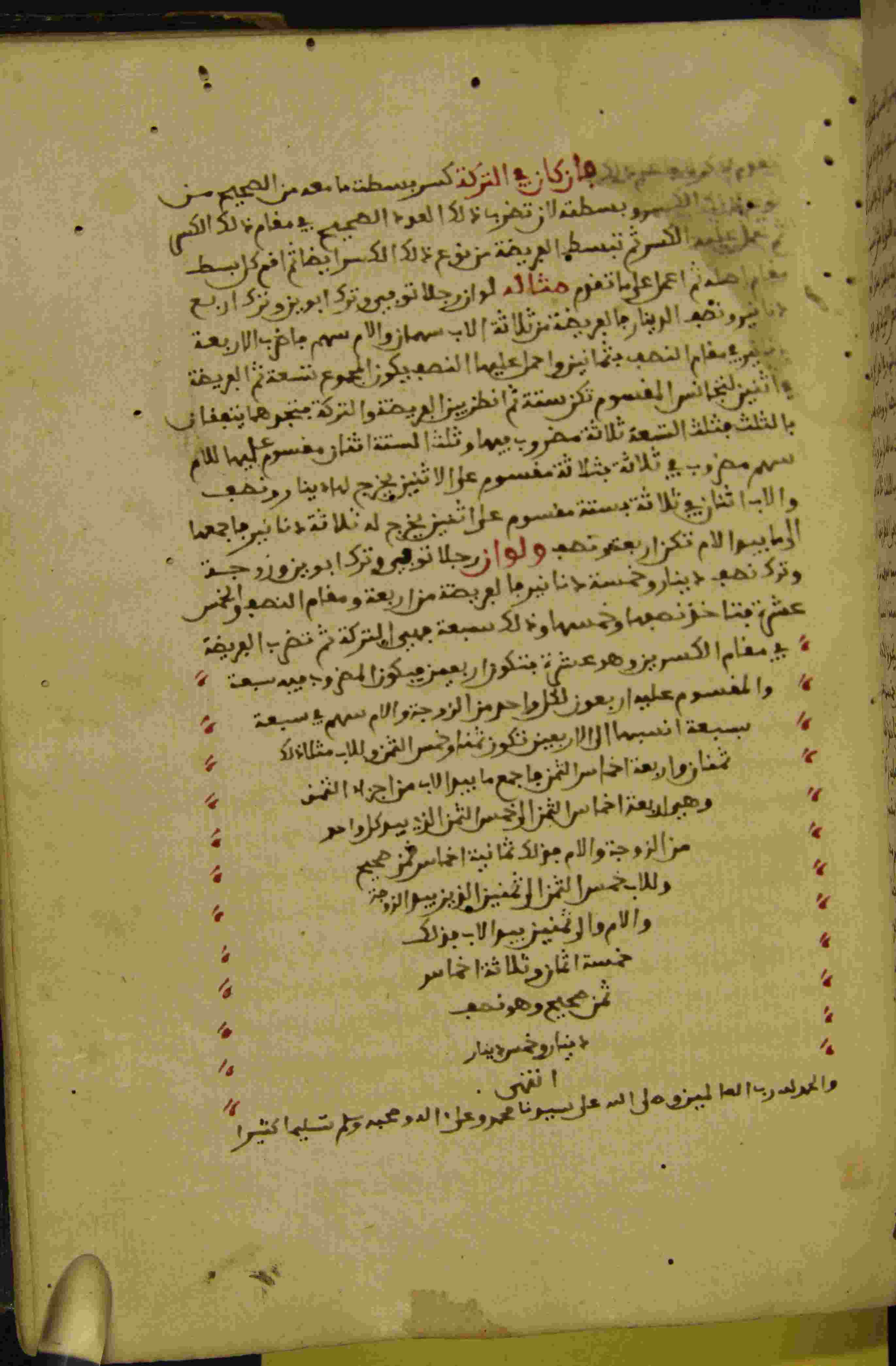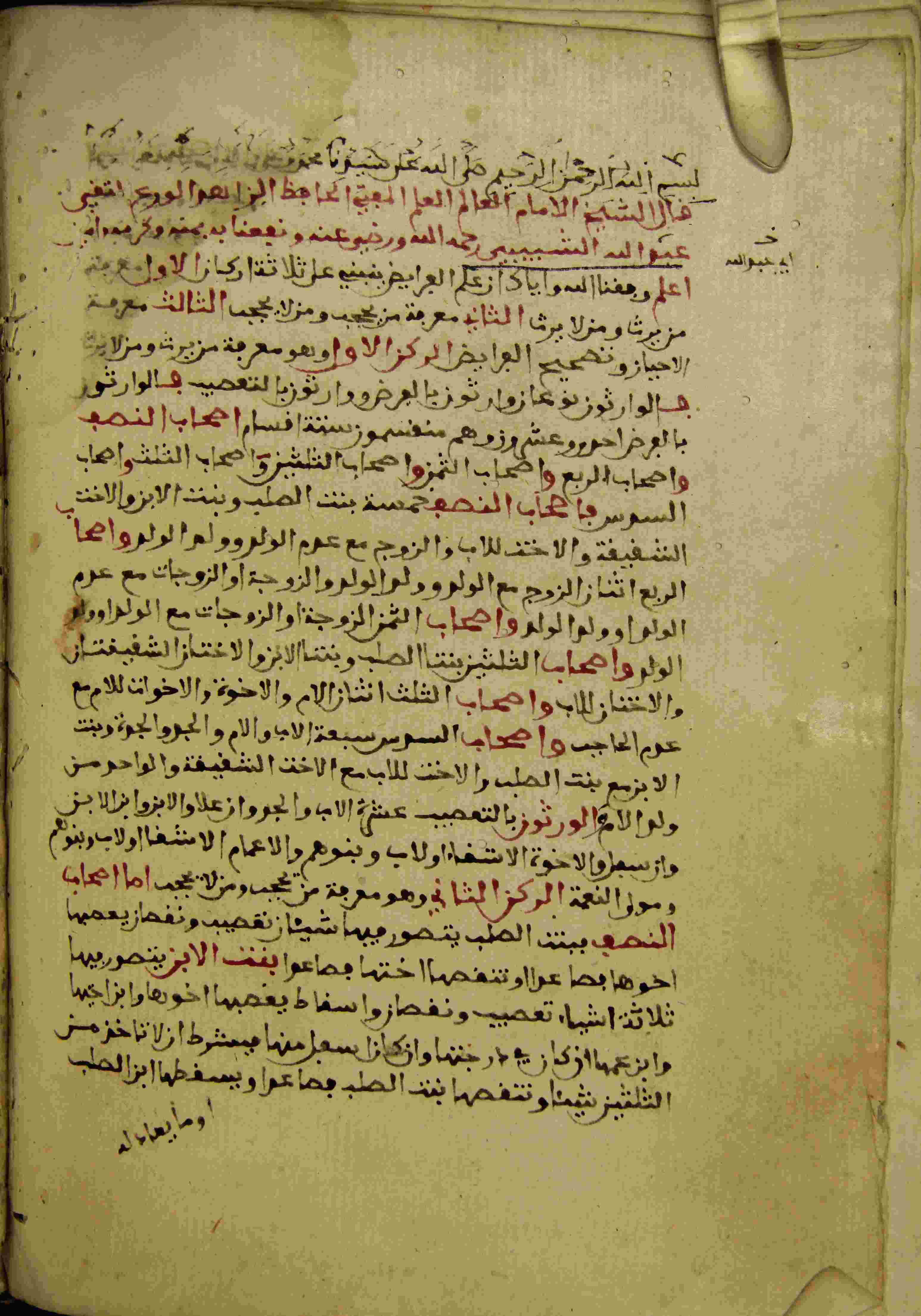 Description: أوله : " أعلم وفقنا الله وإياك أن أعلم الفرائض ينبني على ثلاثة أركان الأول معرفة من يرث ومن لا يرث..."/آخره : " بذلك خمسة أتمان وثلاثة أخماس ثمن صحيح وهو نصف دينار وخمس دينار "، نوع الخط مغربي، التجليد مزخرف، حالة المخطوط حسنة، تملكه محمد الهادي ابن بلقاسم الأحمدي سنة 1346 هـ.، تملكه محمد الحسين بن الرحايل [النووي] سنة 1381 هـ.، تملكه الحاج قاسم الزلال، إضافة إلى تملكات أخرى، أثرت عليه الرطوبة، عدد الأوراق الخاصة به 7 ورقة، بداية المخطوط في الورقة 109، نهاية المخطوط في الورقة 116، المخطوط مرقمن، رقم المخطوط 5.8 /550 م، مصدر المخطوط : مكتبة الشيخ نعيم النعيمي.