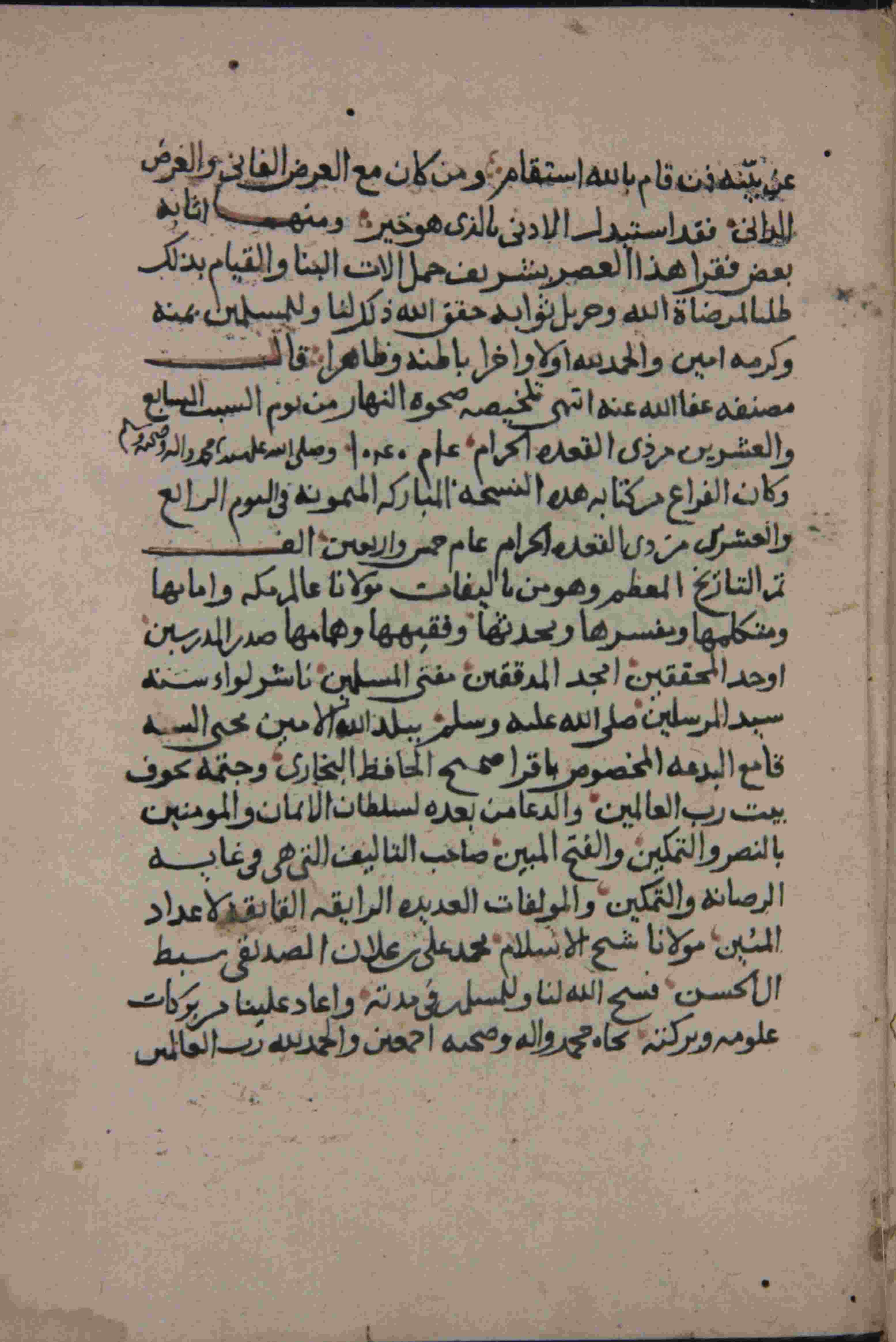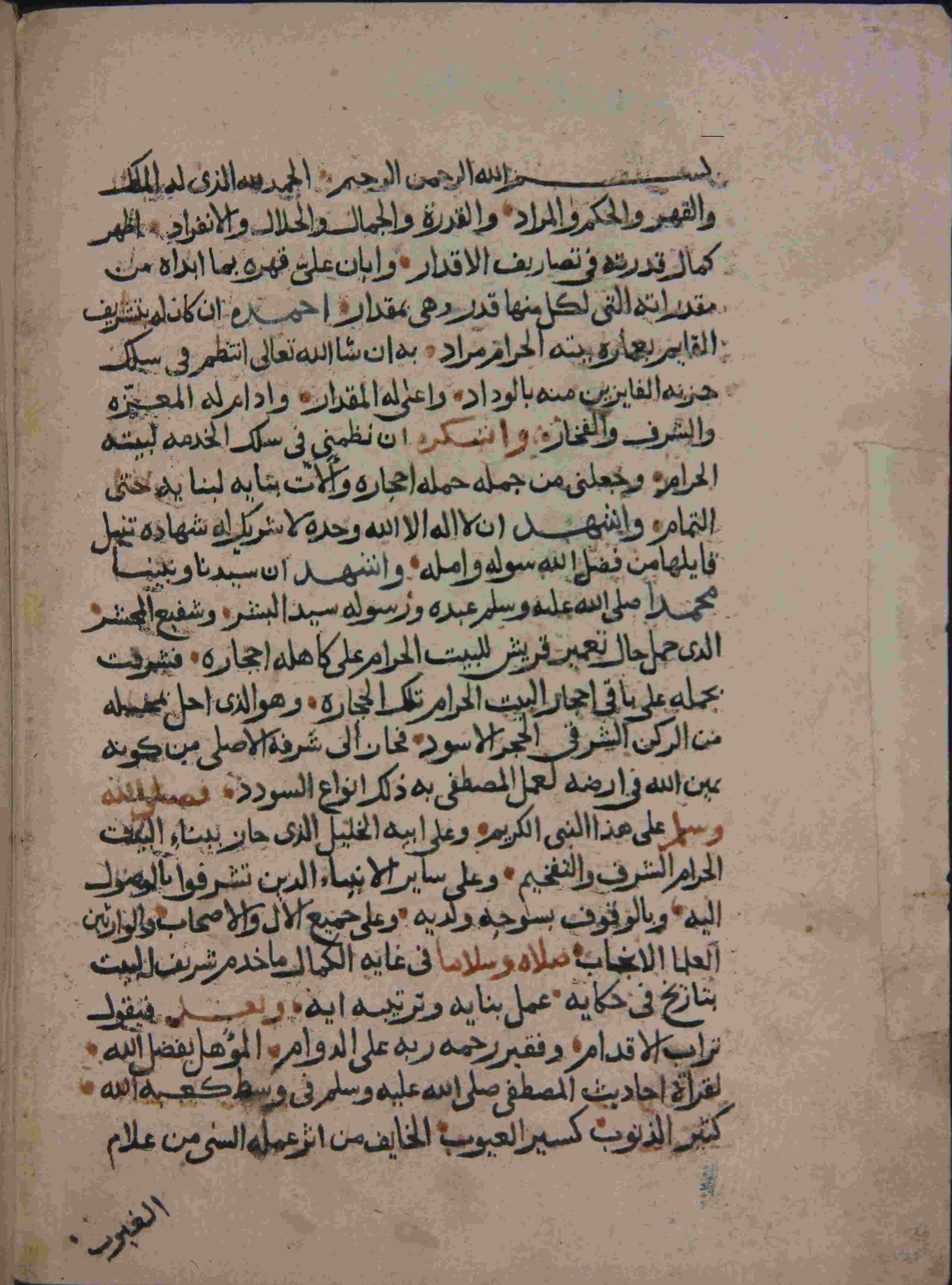 | Description: | أوله : " الحمد لله الذي له الملك والقهر والمراد والقدرة والجمال والجلال والإنفرادأظهر كمال قدرته في تصاريف الأقدار ..."/آخره : " والقيام بذالك طلبا لمرضات الله أولا وآخرا باطنه وظاهره قال مصنفه عفا الله عنه "، نوع الخط نسخي مشرقي، التجليد عادي، حالة المخطوط جيدة، نسخة في حياة المؤلف قبل وفاته ب 12سنة، يظهر أنه من تلاميذ ابن علان الصديقي، سنة النسخ 1045 هـ.، بداية المخطوط في الورقة الثانية، نهاية المخطوط في الورقة 51، المخطوط مرقمن، رقم المخطوط 628 م، مصدر المخطوط : زاوية الشيخ الحسين سيدي خليفة (ميلة) ؛ المراجع والمصادر : معجم المؤلفين، إيضاح المكنون لإسماعيل البغدادي (1/ 128). |
