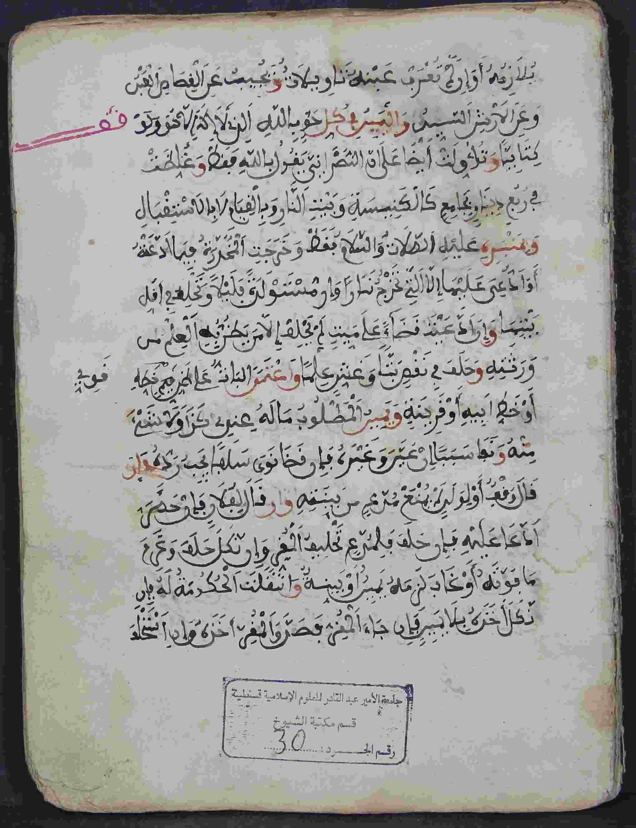 Description: أوله : " يلازمه أو إن لم تعرف عينع تأويلات ويجيب عن القصاص العبد وعن الأرش السيد..."/آخره : " ومن خلف بثلاث ماله تصد وبثلاث على قول ملك وقال أبو بكر الأبهر فيخرج زكاة ماله "، نوع الخط مغربي، التجليد مزخرف، حالة المخطوط متوسطة، مبتور الأول، أثرت عليه الرطوبة، به تعليقات بالهوامش، اعتمد على نظام التعقيبة في ترتيبه، بداية المخطوط في الورقة الأولى، نهاية المخطوط في الورقة 213، المخطوط مرقمن، رقم المخطوط 30 م، مصدر المخطوط : مكتبة الشيوخ.