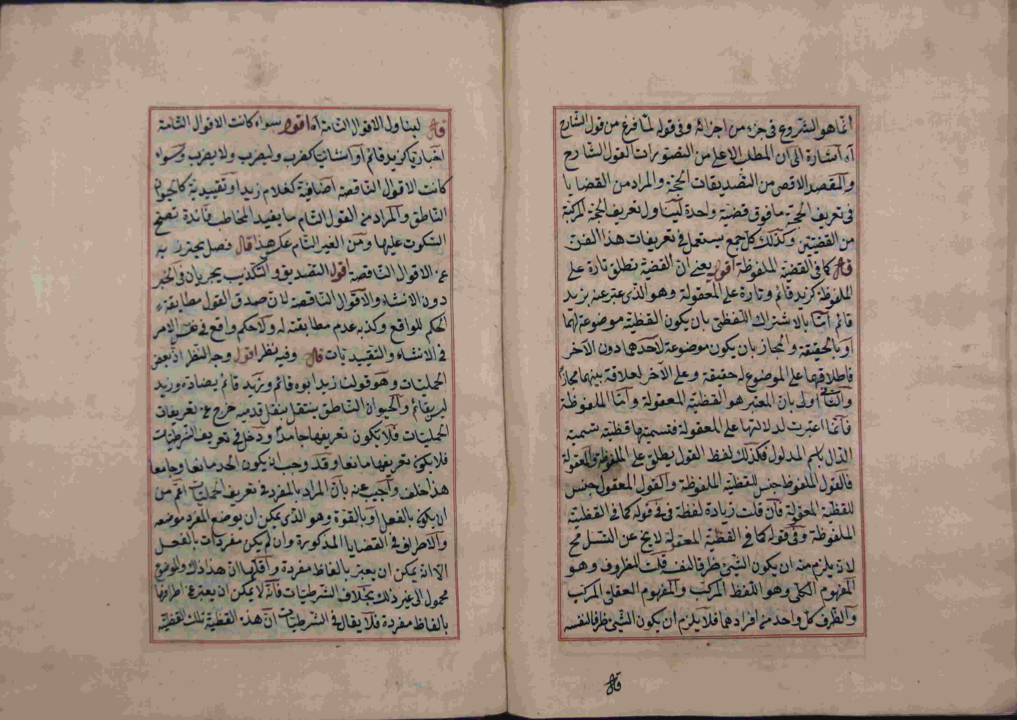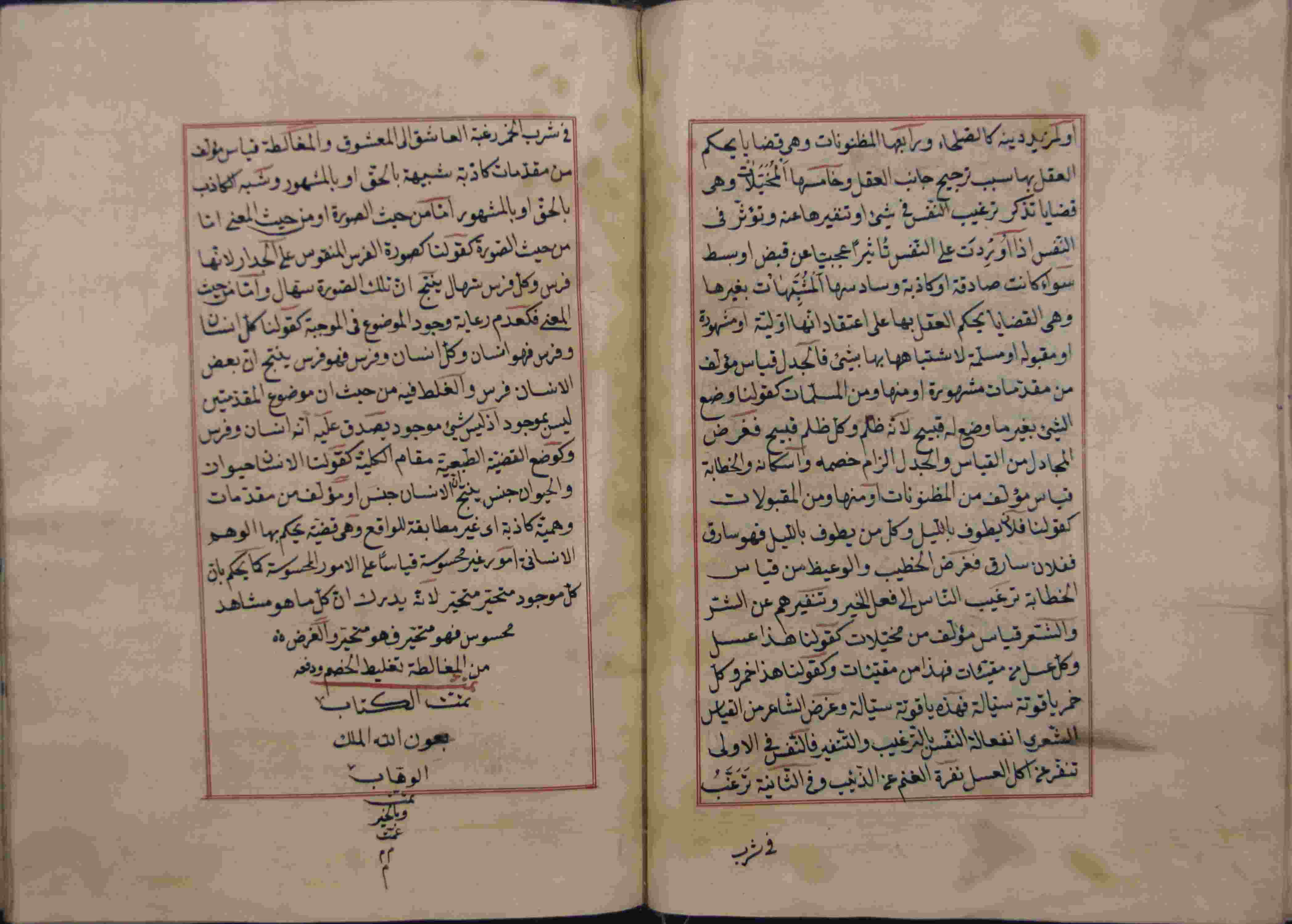 Description: أوله : " الحمد لله رب العالمين والصلاة والسلام على سيدنا محمد وآله أجمعين.../آخره : " إن كل ماهو مشاهد محسوس فهو متحير والغرض من المغالطة تغليط الخصم ودفعه "، نوع الخط مشرقي، التجليد عادي، حالة المخطوط حسنة، عليه آثار الرطوبة، به تعليقات بالهامش، مكتوب في إطار ملون، اتبع نظام التعقيبة في الترتيب، عدد الأوراق الخاصة به 55 ورقة، بداية المخطوط في الورقة الثانية، نهاية المخطوط في الورقة 55، المخطوط مرقمن، رقم المخطوط 1.13 /17 م، مصدر المخطوط : مكتبة الشيخ نعيم النعيمي.