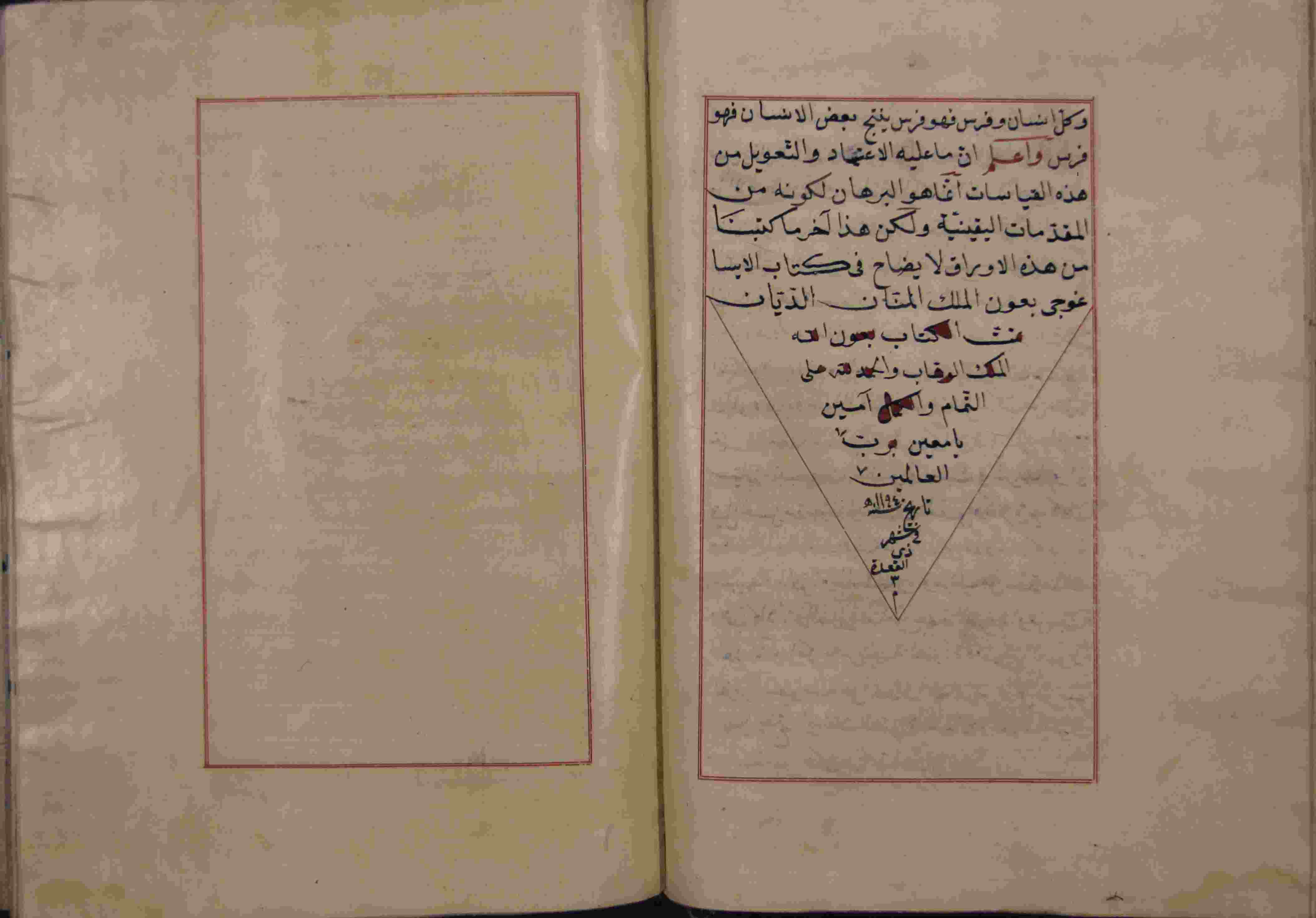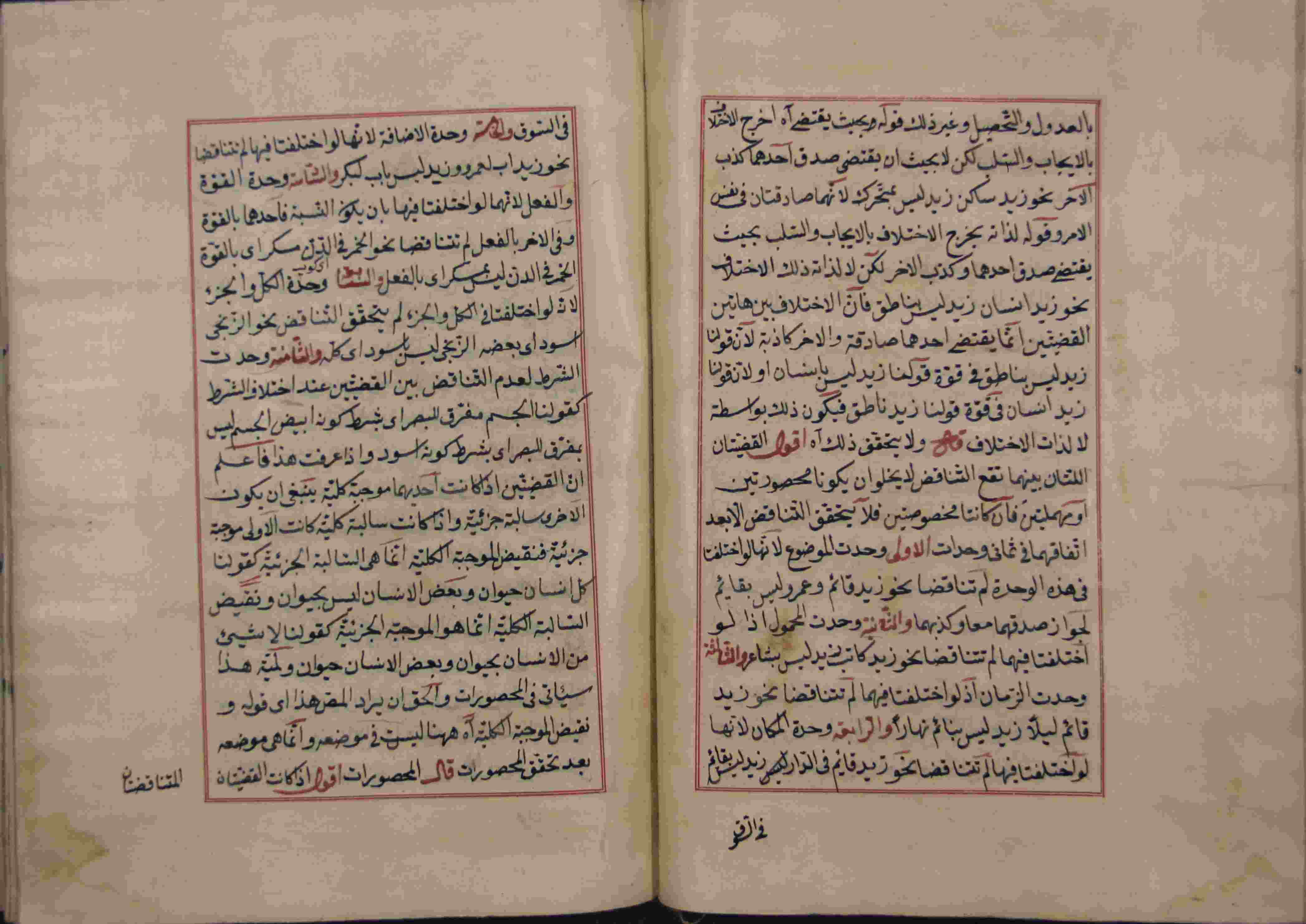 Description: أوله : " الحمد لله الواجب وجوده الممتنع نظيره الممكن سواه وغيره الصادر باختياره شره وخيره.../آخره : " وأعلم أن ما عليه الإعتماد والتعويل من هذه القياسات إنما هو البرهان لكونه من المقدمات اليقينية "، نوع الخط مشرقي، التجليد عادي، حالة المخطوط حسنة، عليه آثار الرطوبة، به تعليقات بالهامش، مكتوب في إطار ملون، اتبع نظام التعقيبة في الترتيب، مكتوب على غلاف المجموع أن الرسالة الثانية للكاتبي الشيخ حسن على ايساغوجي، عدد الأوراق الخاصة به 18 ورقة، بداية المخطوط في الورقة 57، نهاية المخطوط في الورقة 74، المخطوط مرقمن، رقم المخطوط 2.13 /17 م، مصدر المخطوط : مكتبة الشيخ نعيم النعيمي.