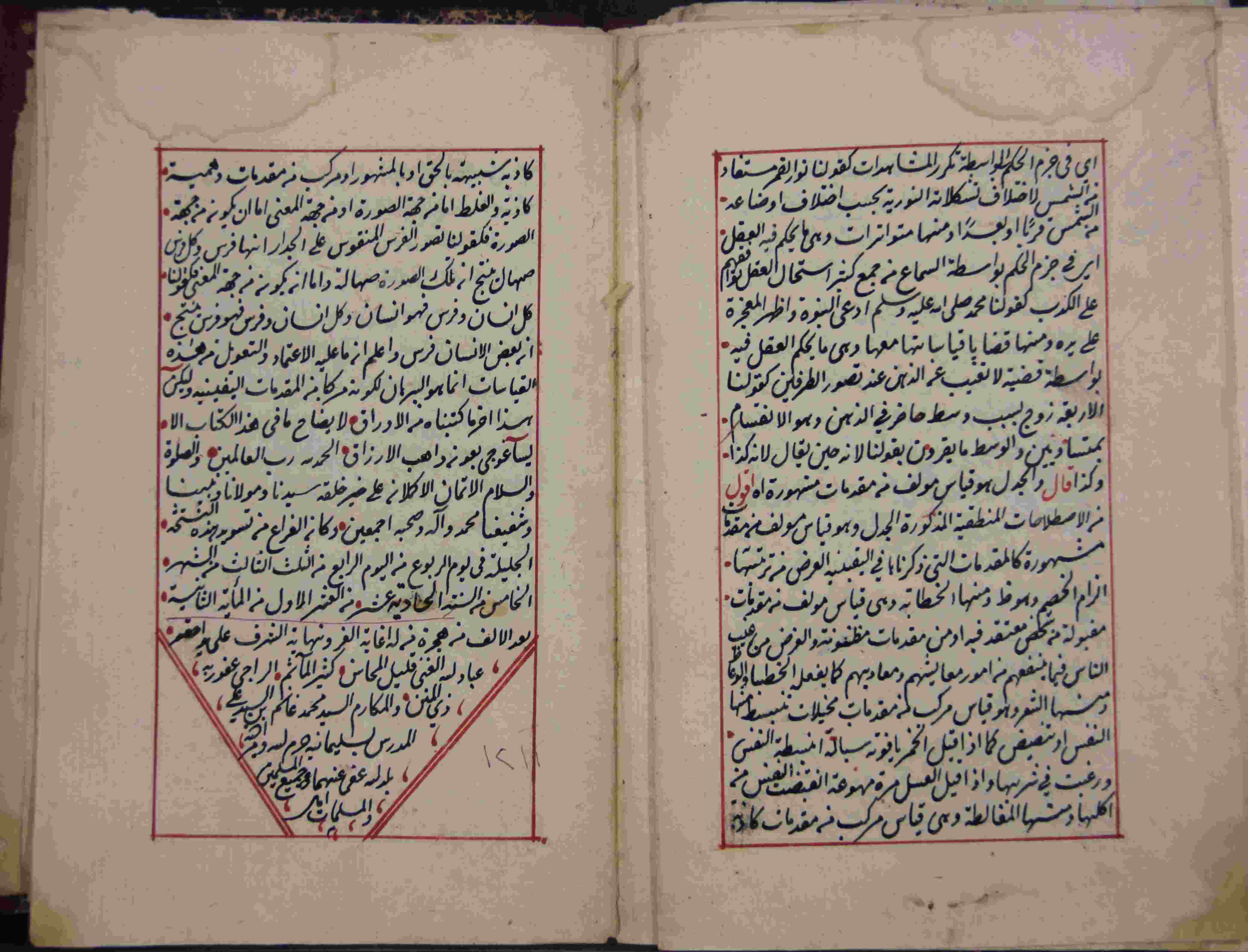 Description: أوله : " بسم الله الرحمن الرحيم والحمد لله رب العالمين والصلاة والسلام على سيدنا محمد وآله وصحبه أجمعين..."/آخره : " لا يضاح ما في هذا الكتاب إلا ياساغوجي بعون واهب الأرزاق عفا عنهما وجميع المسلمين والمسلمات "، نوع الخط مشرقي، التجليد عادي، حالة المخطوط حسنة، الصفحات مكتوبة بطريقتين مختلفتين وتحتاج أوراقه إلى ترتيب، بداية المخطوط في الورقة الثالثة، نهاية المخطوط في الورقة 78، المخطوط مرقمن، رقم المخطوط 23 م، مصدر المخطوط : مكتبة الشيخ نعيم النعيمي ؛ المراجع والمصادر : معجم المؤلفين (7/ 159).