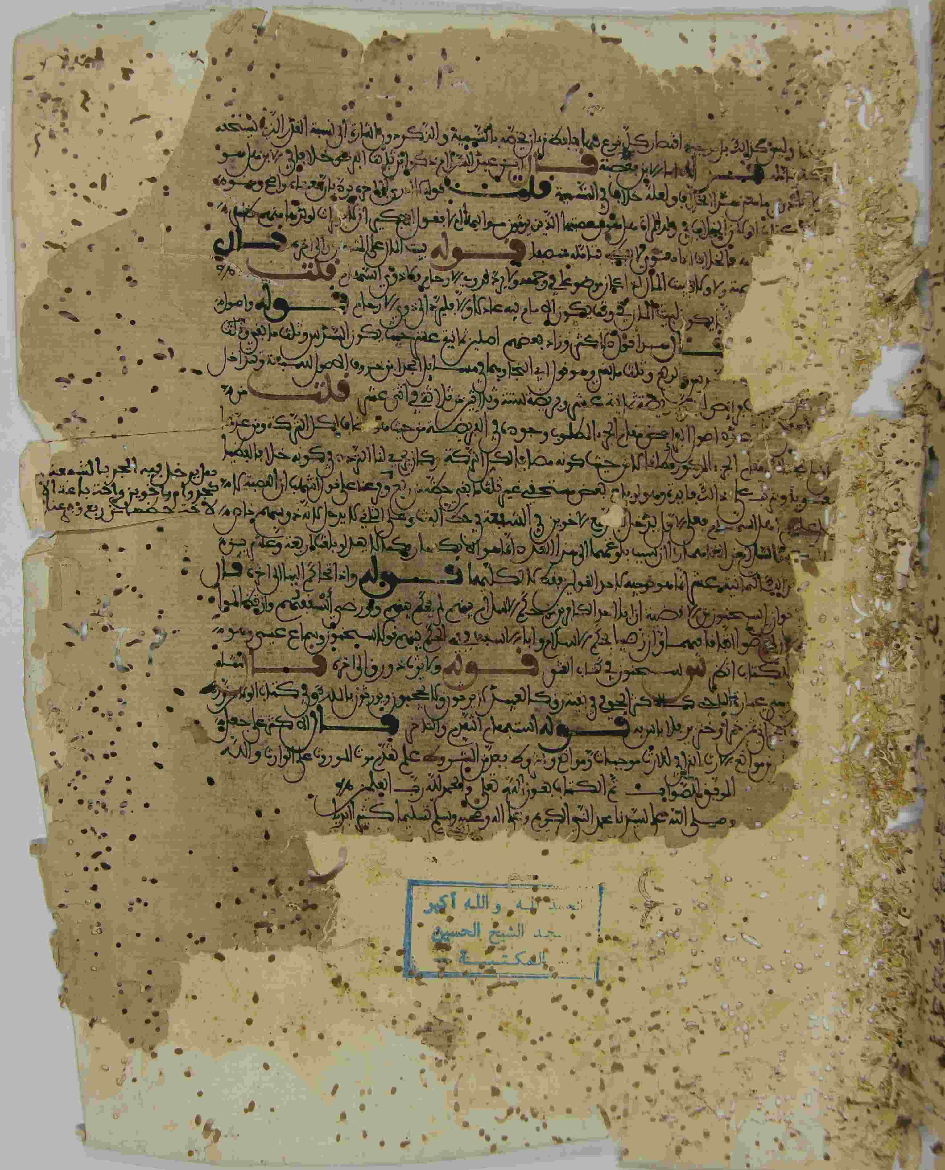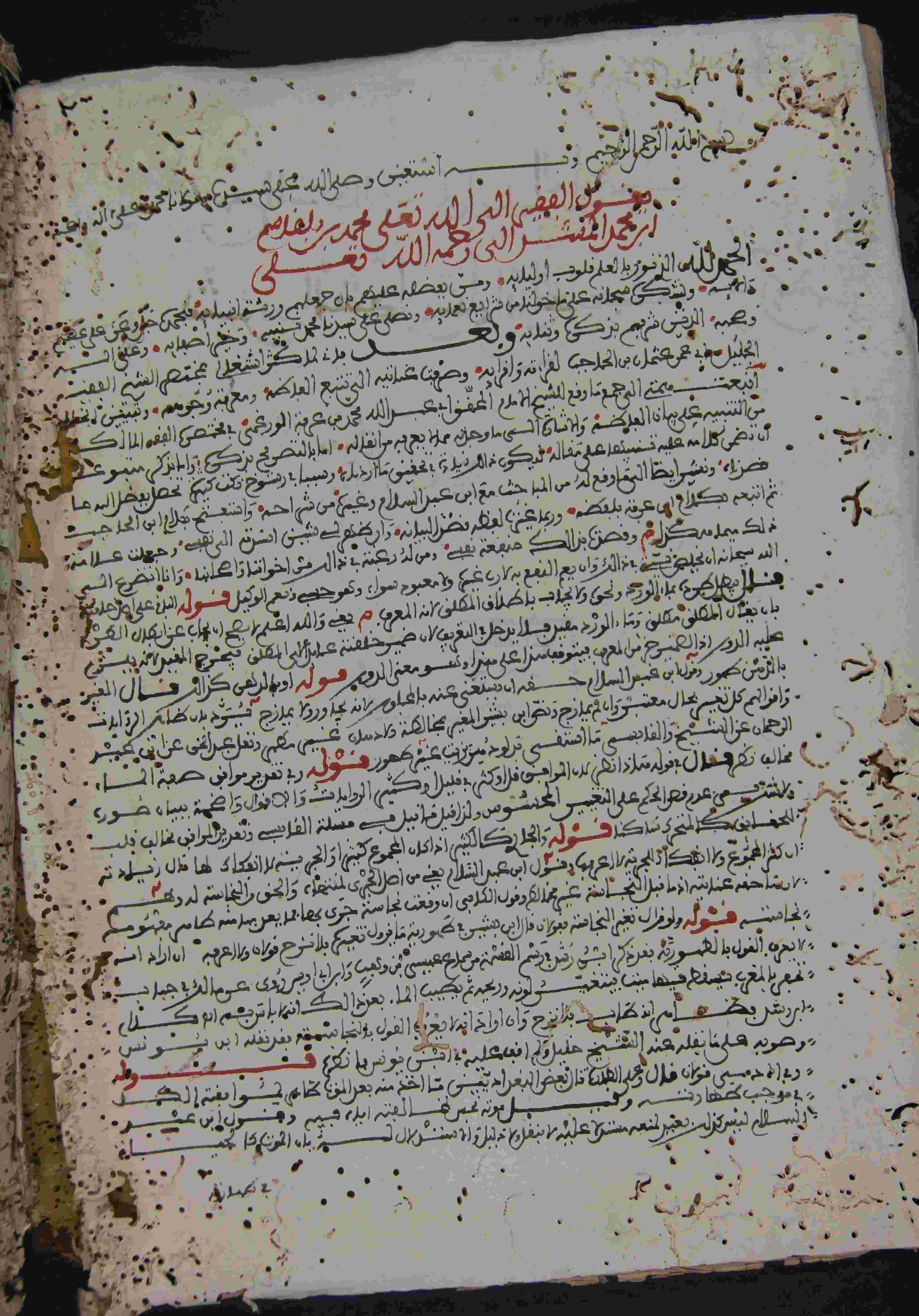 | Description: | أوله : " يقول الفقير إلى الله تعالى محمد بن بلقاسم ابن محمد المشدالي رحمه الله تعالى الحمد لله الذي نور بالعلم قلوب أوليائه ومن بفضله عليهم بأن جعلهم ورثة النبي..."/آخره : " قال الأكثر على جعل من موانع الأرث القرافي للأرث موجبات وموانع وشروط فعد من الشروط علم تقدم موت المورث على الوارث والله الموفق للصواب تم الكتاب بعون الله "، نوع الخط مغربي، التجليد عادي، حالة المخطوط رديئة، بداية المخطوط في الورقة الثانية، نهاية المخطوط في الورقة 128، المخطوط مرقمن، رقم المخطوط 622 م، مصدر المخطوط : زاوية الشيخ الحسين سيدي خليفة (ميلة) ؛ المراجع والمصادر : معجم المؤلفين (11/ 144). |