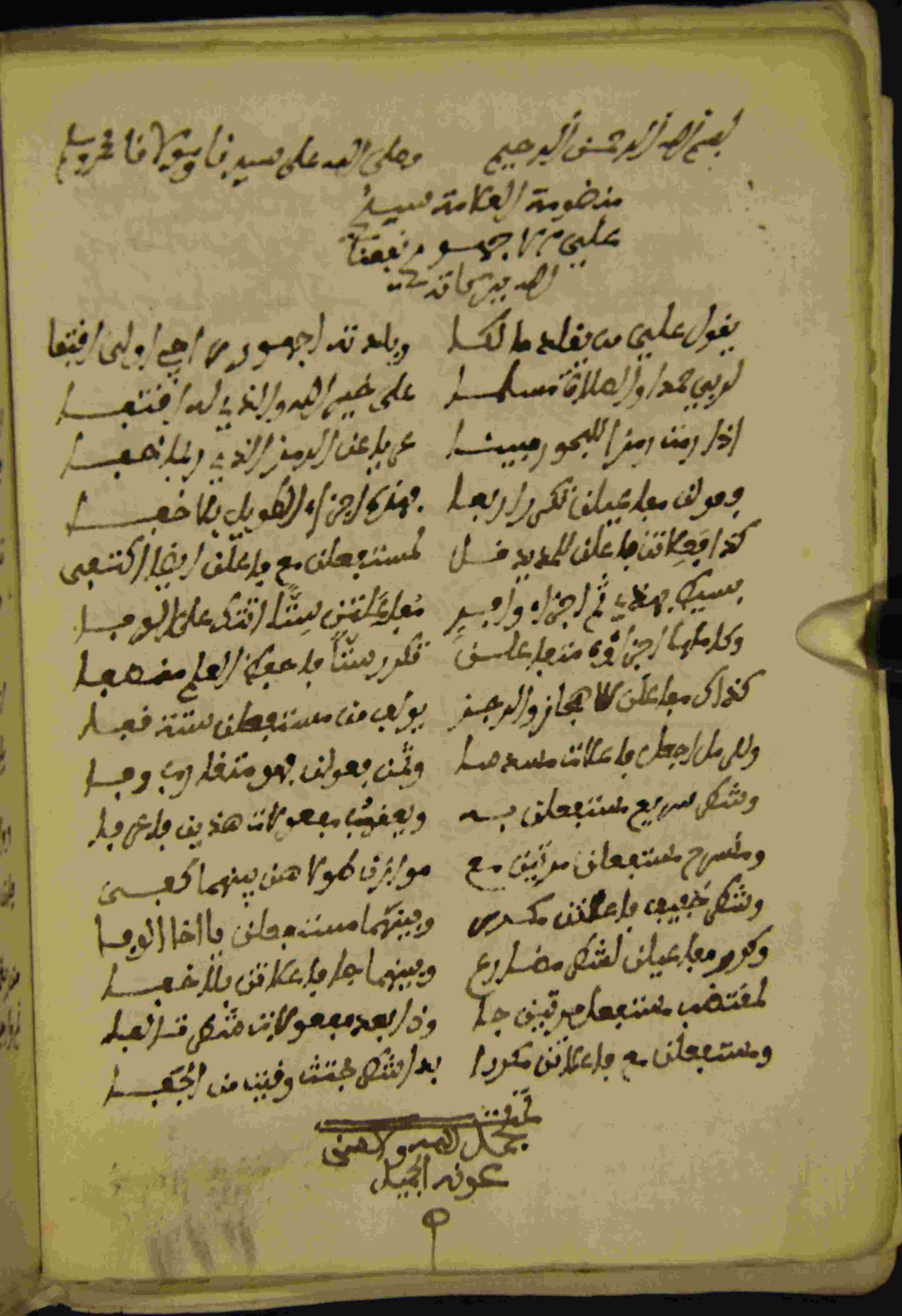 | Description: | أوله : " يقول علي من يقلد مالكا * وبلدته أجهور راجي أولى اقتفا لربي حمدا والصلاة مسلما..."/آخره : " تمت بحمد الله وحسن عونه الجميل "، نوع الخط مغربي، التجليد غير مجلد، حالة المخطوط حسنة، بداية المخطوط في الورقة 15، نهاية المخطوط في الورقة 15،المخطوط مرقمن، رقم المخطوط 4.5 /563 م، مصدر المخطوط : مكتبة الشيوخ. |