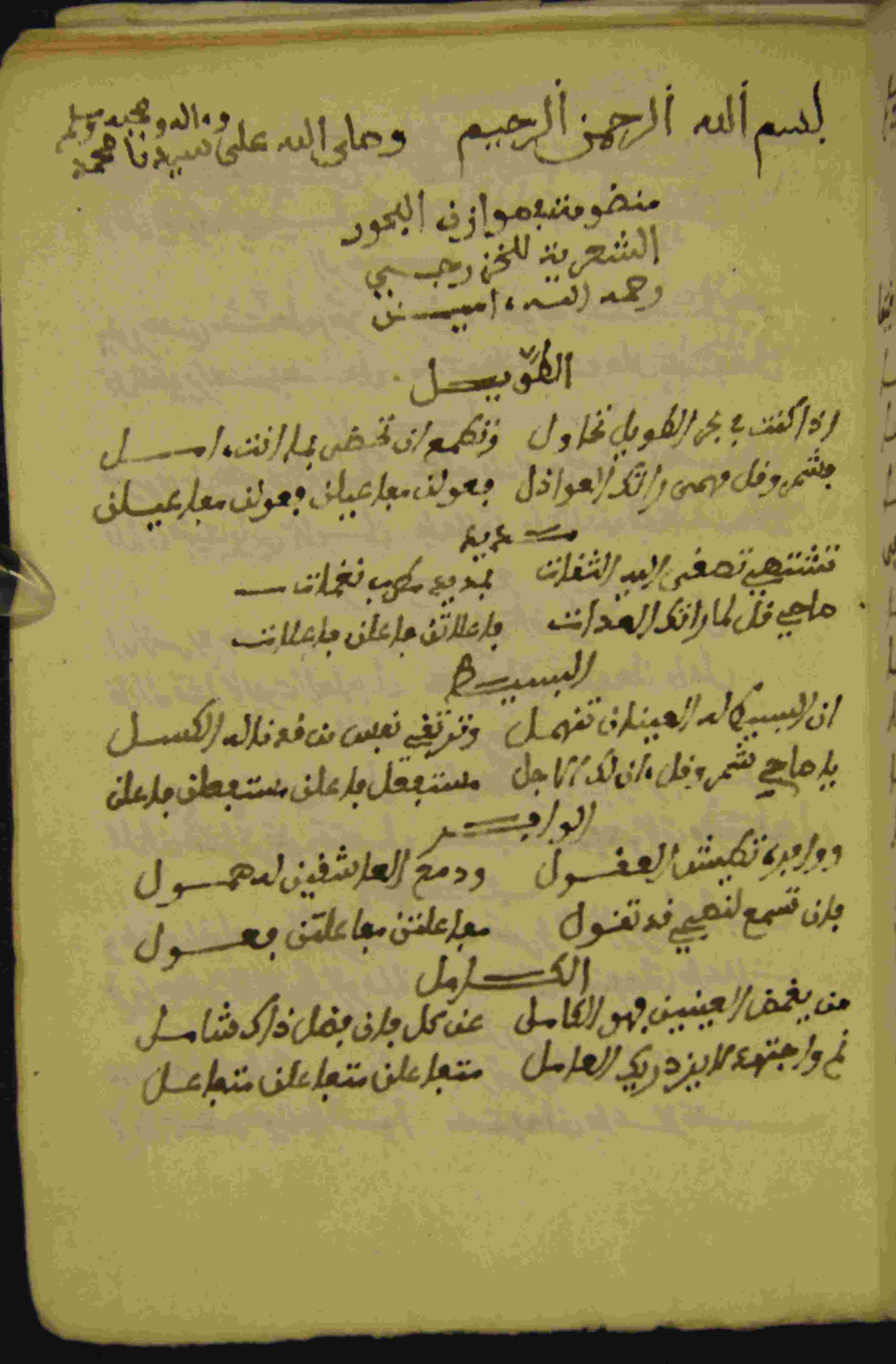 | Description: | أوله : " إذا كنت في بحر الطويل تحاول * وتطمع أن تحضر بما أنت أمل..."/آخره : " تمت بحمد الله وحسن عونه الجميل ولا حول ولا قوة إلا بالله العلي العظيم "، بداية المخطوط في الورقة 16، نهاية المخطوط في الورقة 17، المخطوط مرقمن، رقم المخطوط 5.5 /563 م، مصدر المخطوط : مكتبة الشيوخ. |