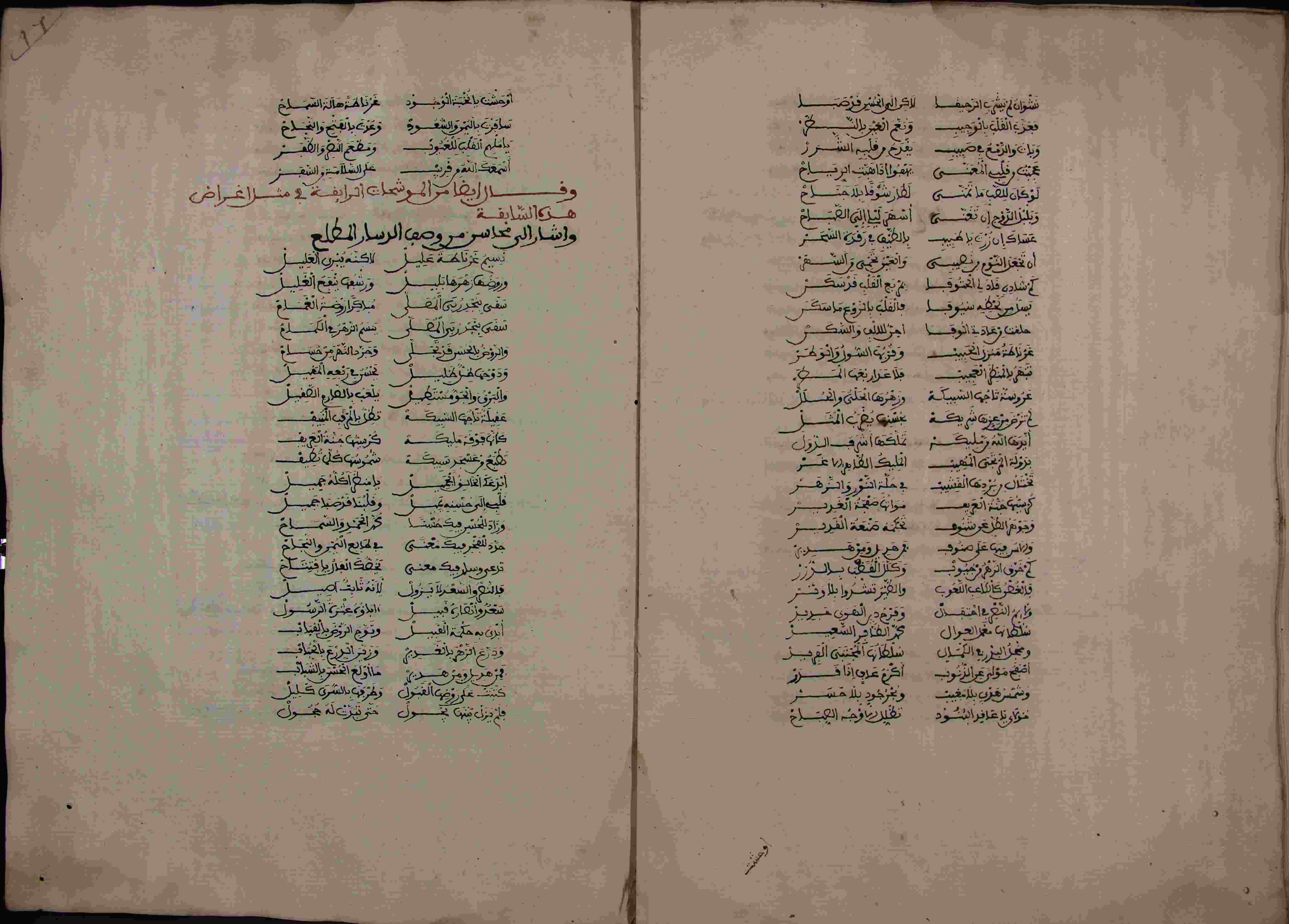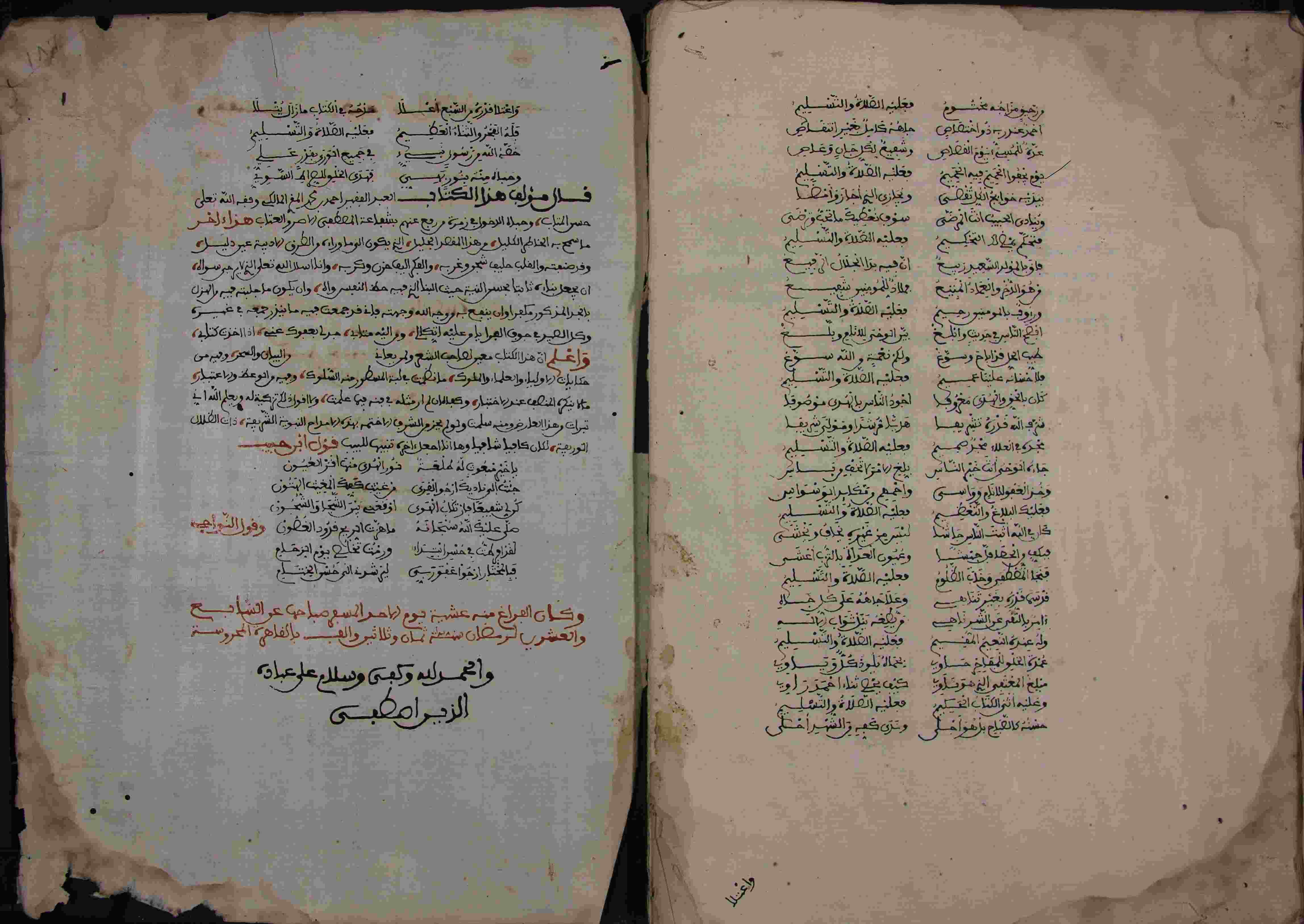 | Description: | أوله : " ولما دعاني داعي الهوى وواخلف ما كنت املته..."/آخره : " فبالمختار ارجوا عفو ربي ليرشدني الختام "، نوع الخط مغربي، التجليد مزخرف، حالة المخطوط متوسطة، أثرت عليه الرطوبة، الغلاف نصفه مقطوع، الستة أوراق الأولى مبتورة إضافة إلى الورقة التاسعة، كان الفراغ منه عشية يوم الأحد 27 من رمضان 1038هـ.، رقم المخطوط 560 م، مصدر المخطوط : مكتبة الشيوخ. |