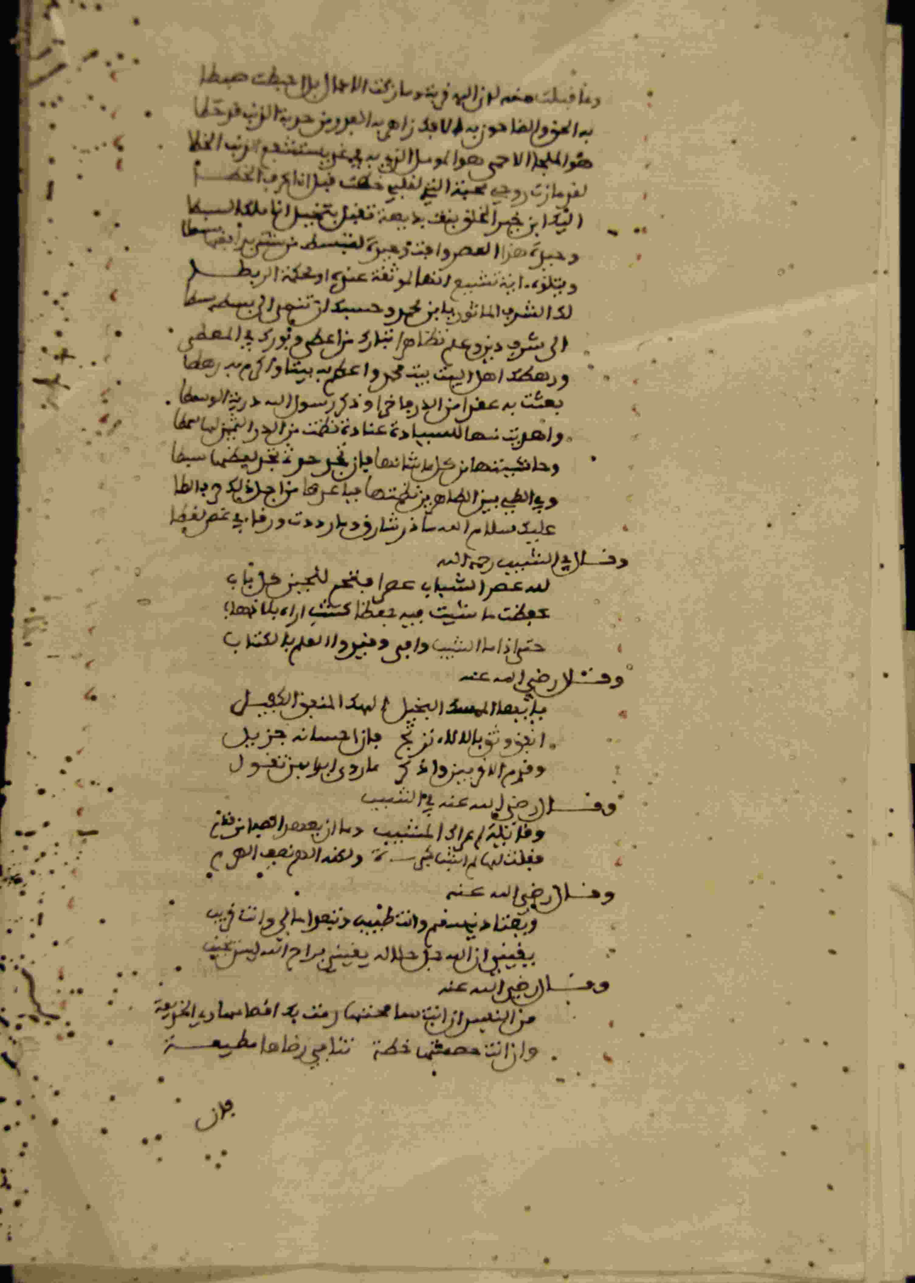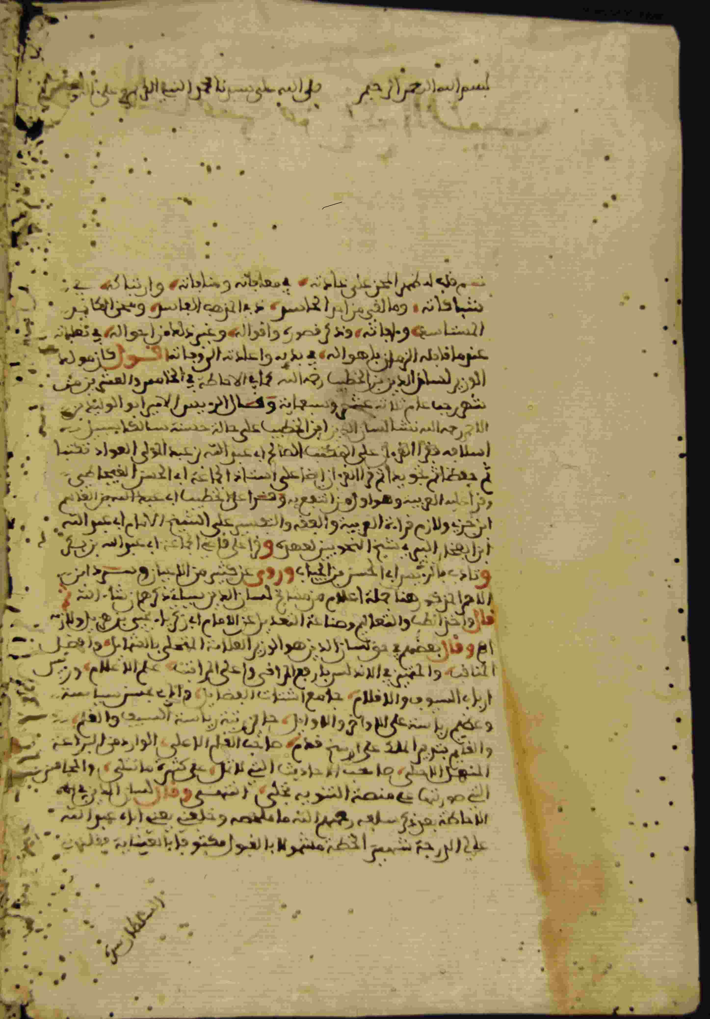 | Description: | أوله : " بسم الله الرحمان الرحيم صلى الله على سيدنا محمد النبي الكريم وعلى آله وصحبه ثم قلب له ظهر المحن على عادته..."/آخره : " وإن أنت خصمتها خطة تنافي رضاها مطيعة "، ليس له غلاف، أثرت عليه الأرضة، به هوامش وتعليقات، أوراق مفقودة في آخره، نوع الخط مغربي، التجليد غير مجلد، حالة المخطوط متوسطة، بداية المخطوط في الورقة الثانية، نهاية المخطوط في الورقة 102، المخطوط مرقمن، رقم المخطوط 942 م، مصدر المخطوط : زاوية الشيخ الحسين سيدي خليفة (ميلة). |