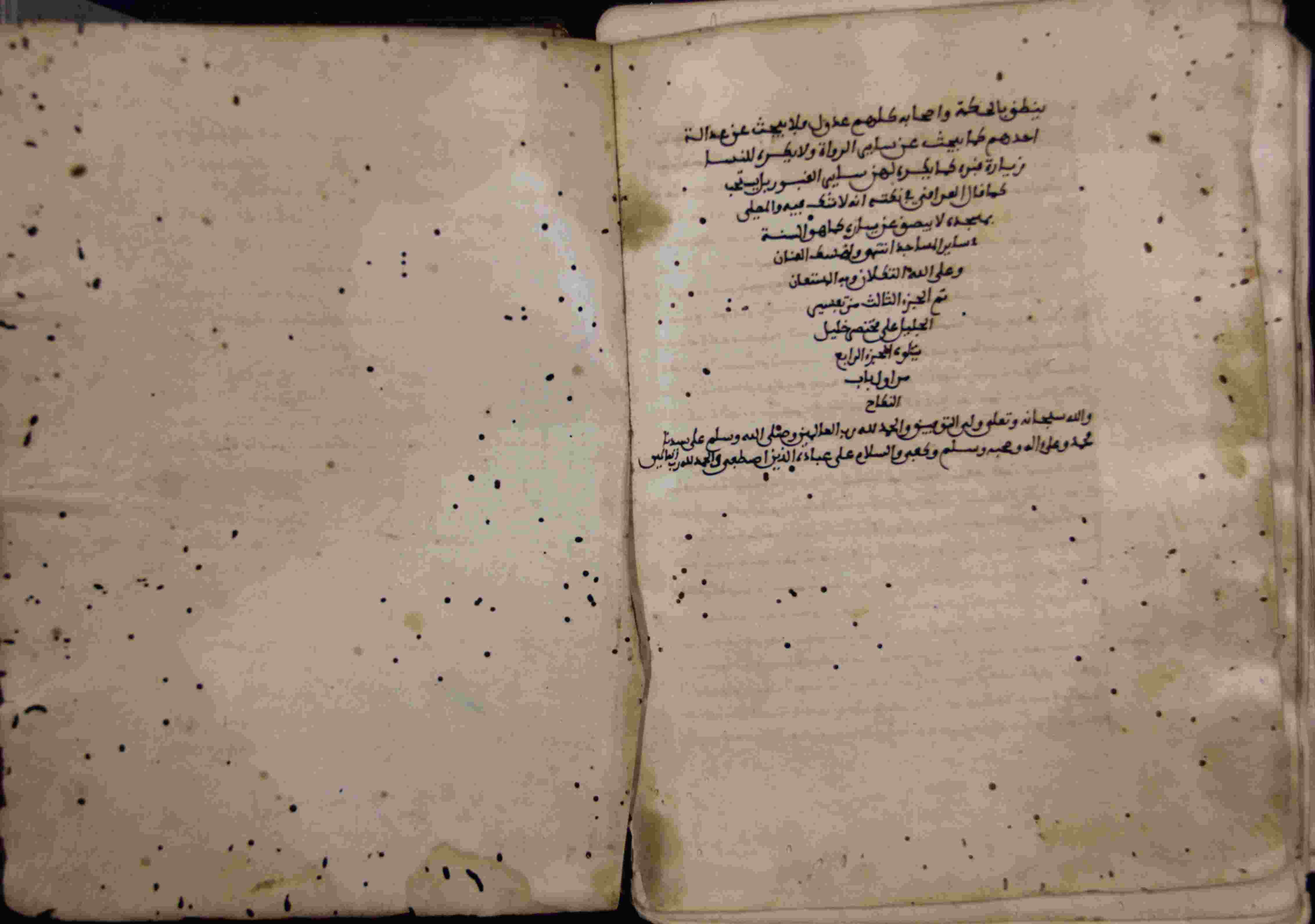 | Description: | أوله : " بسم الله الرحمان الرحيم وصلى الله وسلم على سيدنا محمد صلى الله عليه وسلم ولما أنهى الكلام على الأركان المشترك..."/آخره : " إنه لا شك فيه والمصلى بمسجده لا يبصق عن يساره كما هو في السنة في ساير المساجد انتهى "، نوع الخط مغربي، التجليد مزخرف، حالة المخطوط حسنة، بداية المخطوط في الورقة الثانية، نهاية المخطوط في الورقة 301، المخطوط مرقمن، رقم المخطوط 841 م، مصدر المخطوط : زاوية الشيخ الحسين سيدي خليفة (ميلة). |