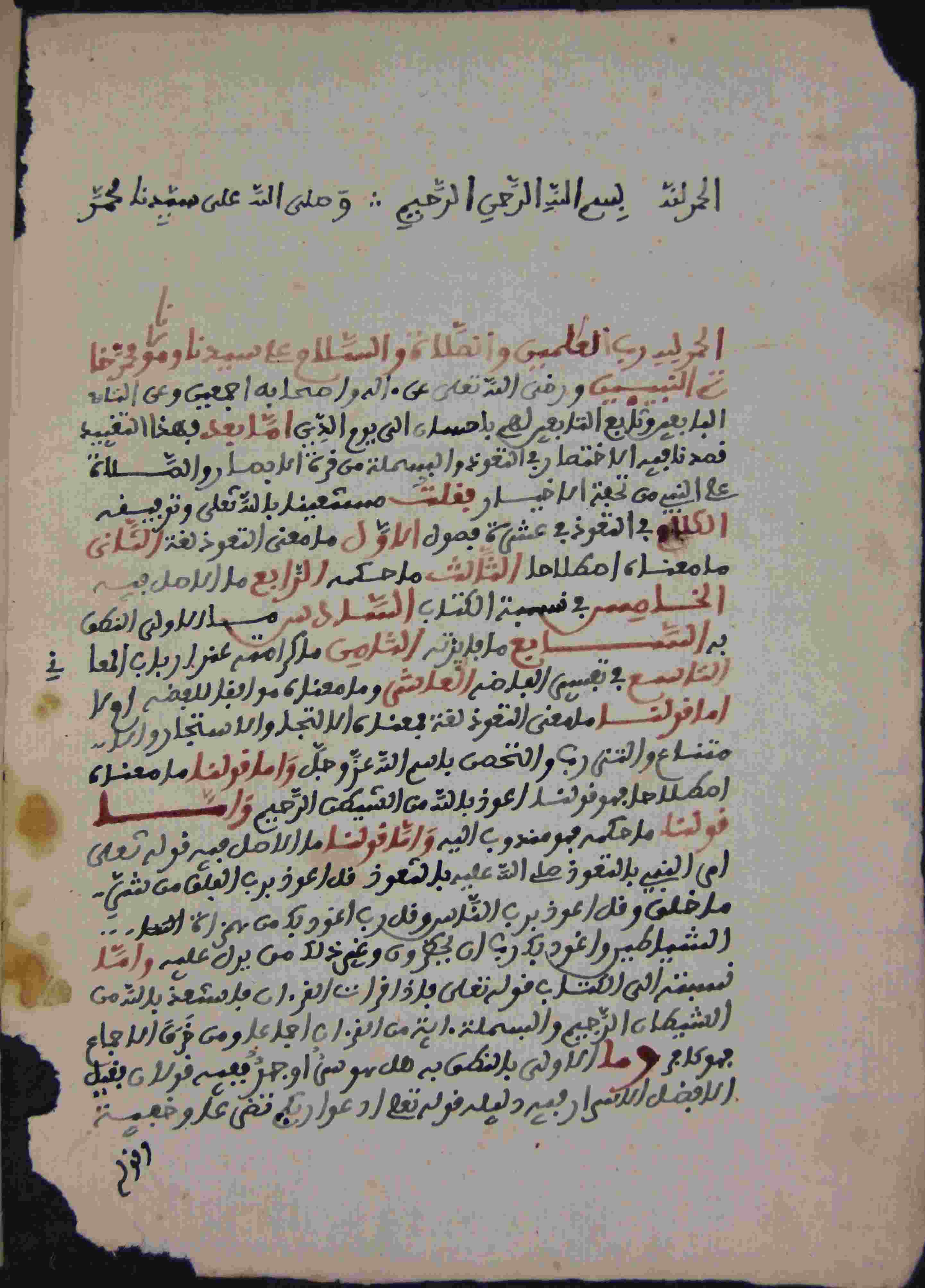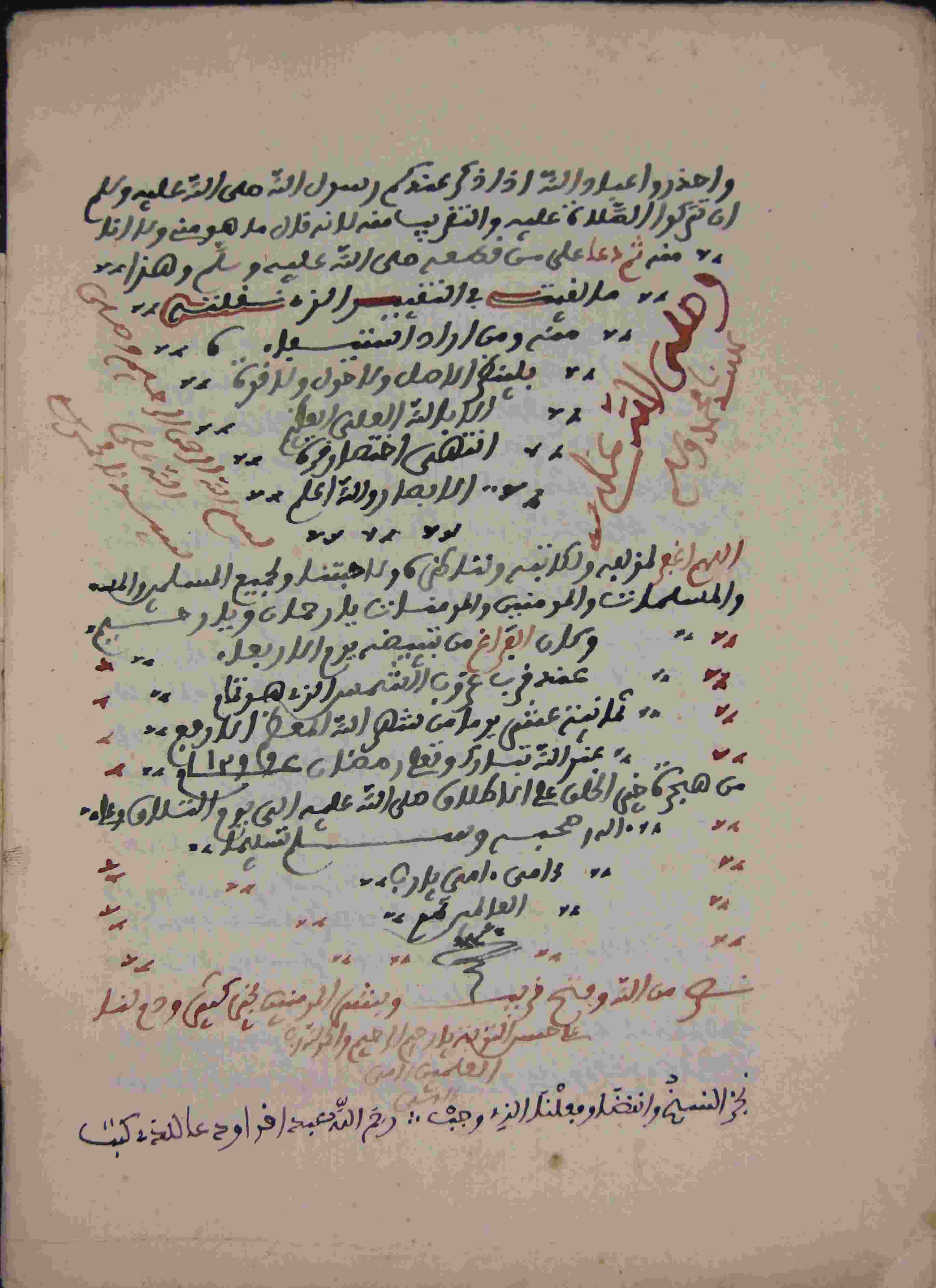 | Description: | أوله : " الحمد لله رب العالمين والصلاة والسلام على سيدنا ومولانا محمد خاتم النبيين ورضي الله تعالى عن آله وأصحابه أجمعين..."/آخره : " واحذروا عباد الله إذا ذكر عندكم رسول الله صلى الله عليه وسلم أن تتركوا الصلاة عليه والتقرب منه لأنه قال ماهو مني ولا أنا منه "، منزوع الغلاف، كان الفراغ من تبييضه يوم الأربعاء ثمانية عشر رمضان 1299هـ.، نوع الخط مغربي، التجليد منزوع الغلاف، حالة المخطوط حسنة، بداية المخطوط في الورقة الأولى، نهاية المخطوط في الورقة التاسعة، المخطوط مرقمن، رقم المخطوط 947 م، مصدر المخطوط : زاوية الشيخ الحسين سيدي خليفة (ميلة). |