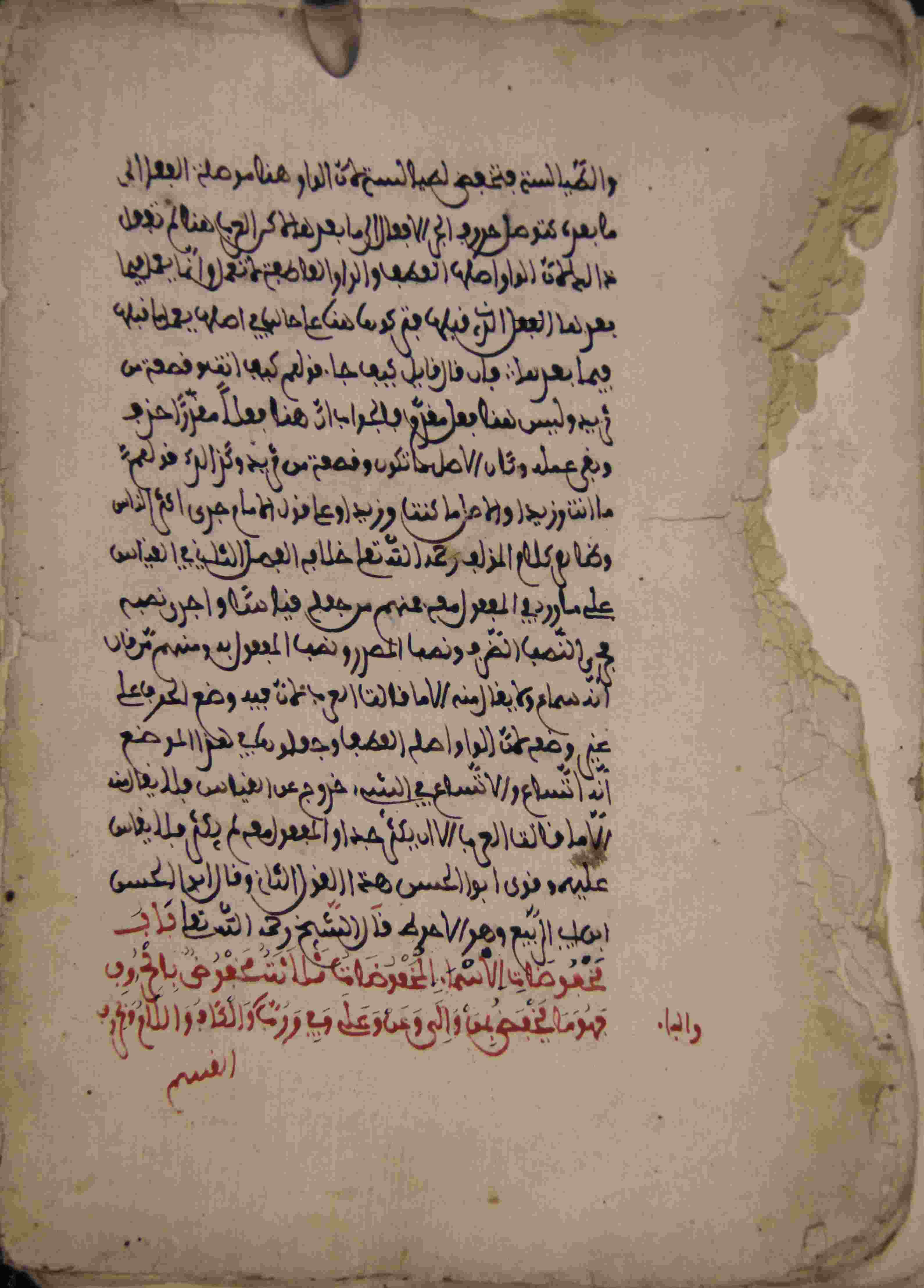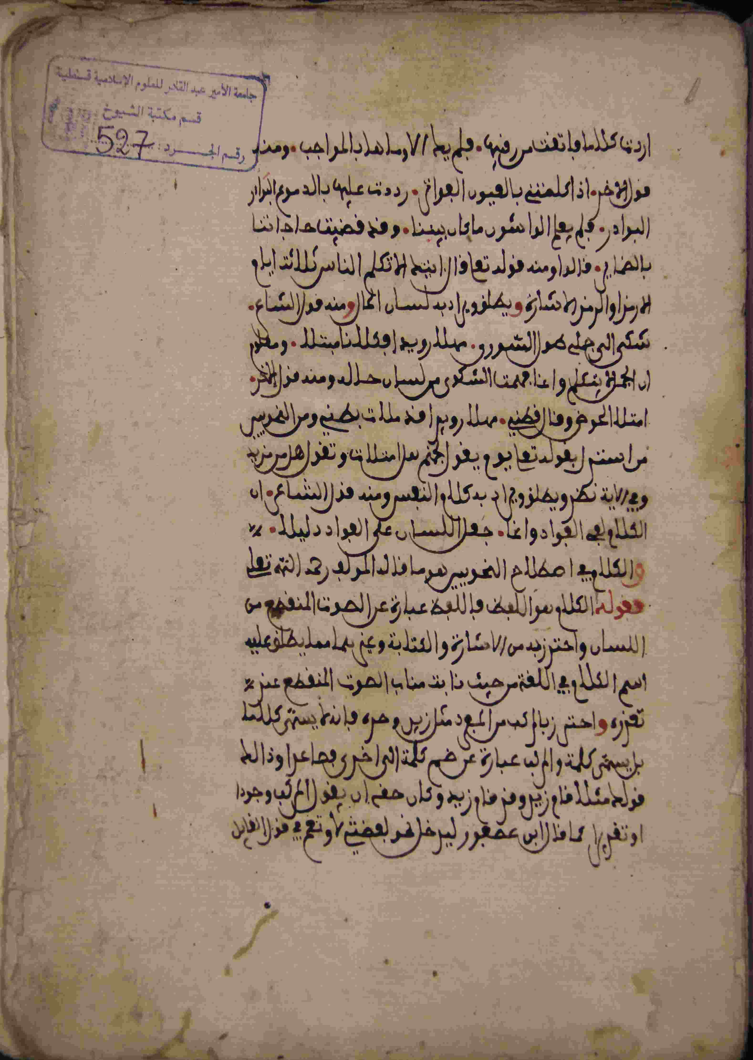 Description: أوله : " مبتور الأول...أردت كلاما فاتقت [ ] فلم يد الأوماها بالواجب ومنه قول آخر..."/آخره : " مبتور الآخر...فهو ما يخفض بمن وإلى وعن وعلي وفي ورب والكاف واللام وبحروف القسم"، نوع الخط مغربي، التجليد منزوع الغلاف، حالة المخطوط متوسطة، به سقط من أوله وآخره، أوراقه متآكلة الأطراف، بهامشه تعليقات، بداية المخطوط في الورقة الأولى، نهاية المخطوط في الورقة 48، المخطوط مرقمن، رقم المخطوط 527 م، مصدر المخطوط : مكتبة الشيخ نعيم النعيمي.