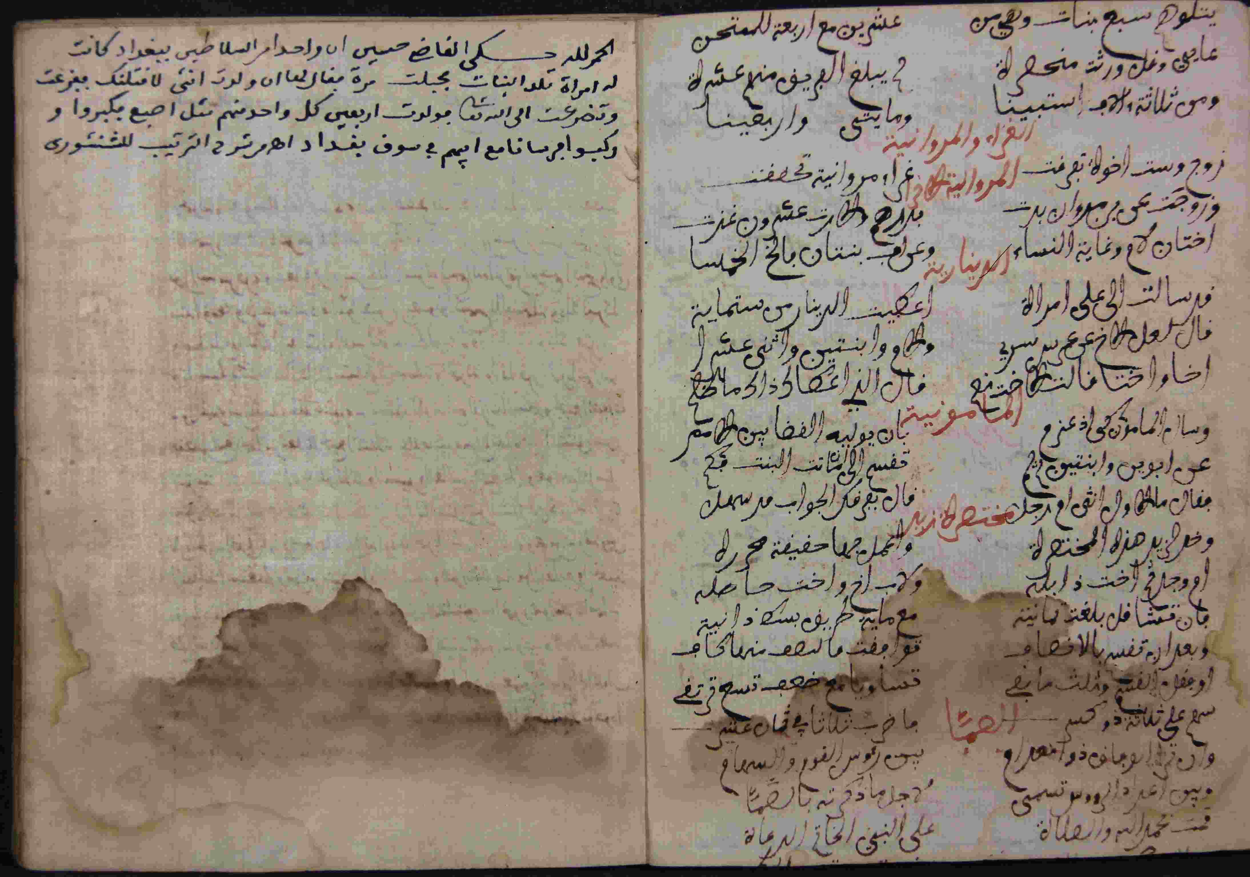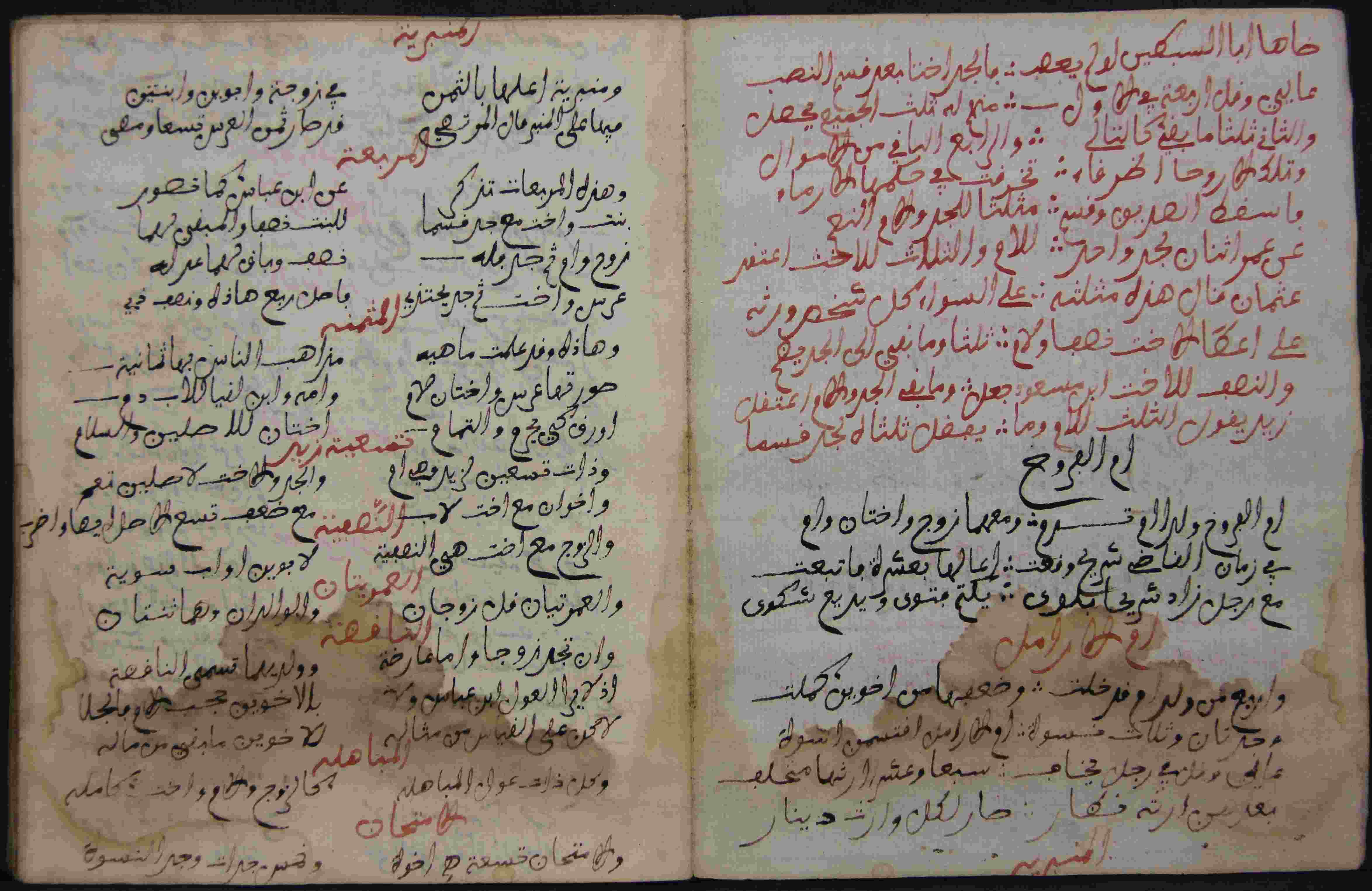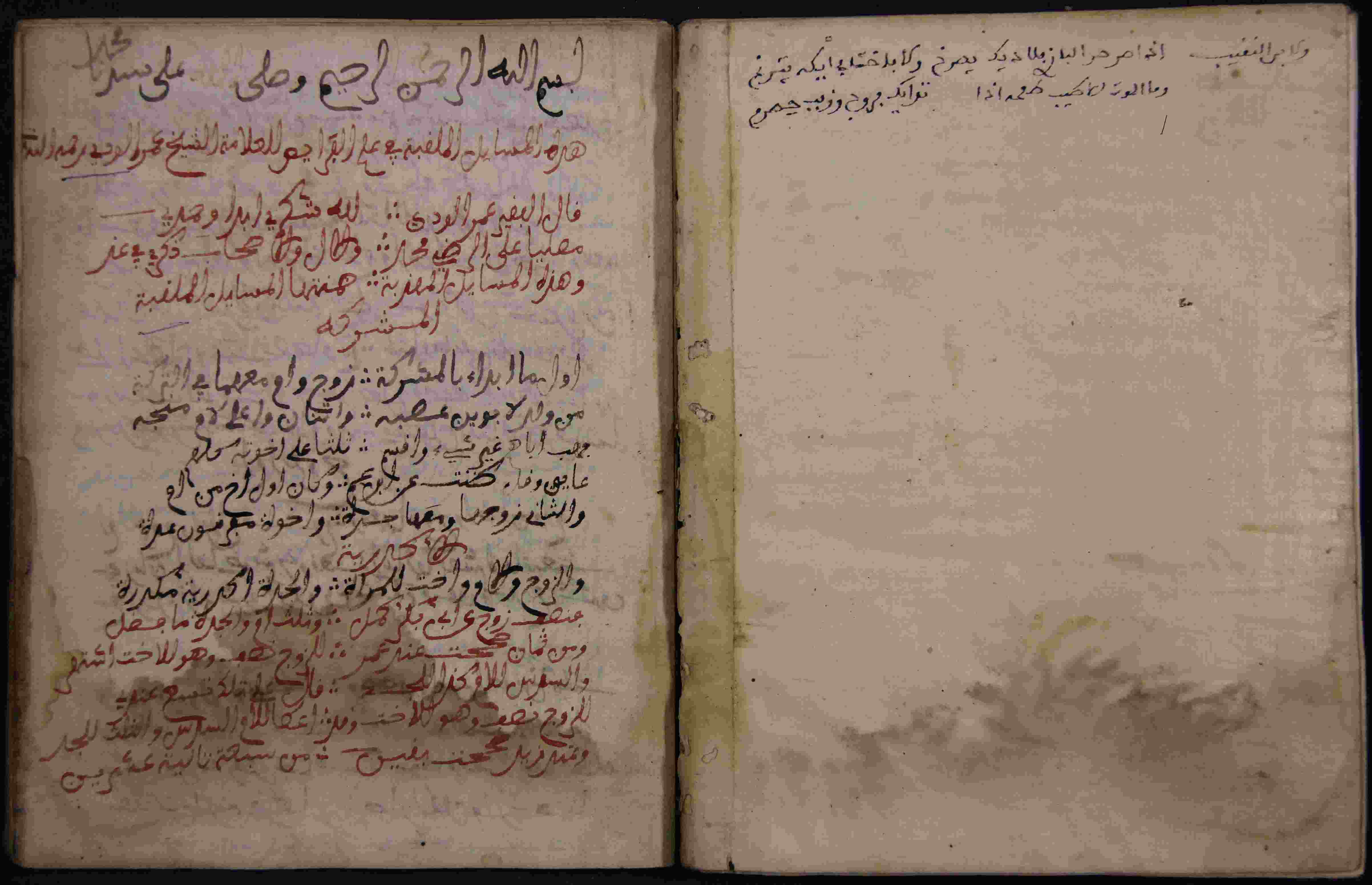 Description: أوله : " أو ما أبدأ بالمشركة زوج وأم معهما في التركة من وله لأبوين عصبه..."/آخره: " الحمد لله حكى القاضي حسين أن واحدا أمر السلاطين ببغداد كانت له إمرأة تلد البنات "، نوع الخط مغربي، التجليد غير مجلد، حالة المخطوط متوسطة، أثرت في أوراقه الرطوبة، به تعليقات بالهوامش، به ختم الملكية، مبتور الآخر، به أوراق إضافية في الآخر في شكل جداول وشرح تلك الجداول، أضيفت هذه الرسالة بخط مخالف للمستعمل في المجموعة، الأوراق الخاصة به 3 أوراق، بداية المخطوط في الورقة 117، نهاية المخطوط في الورقة 119، المخطوط مرقمن، رقم المخطوط 6.7 /1033 م، مصدر المخطوط : مكتبة الشيخ نعيم النعيمي.