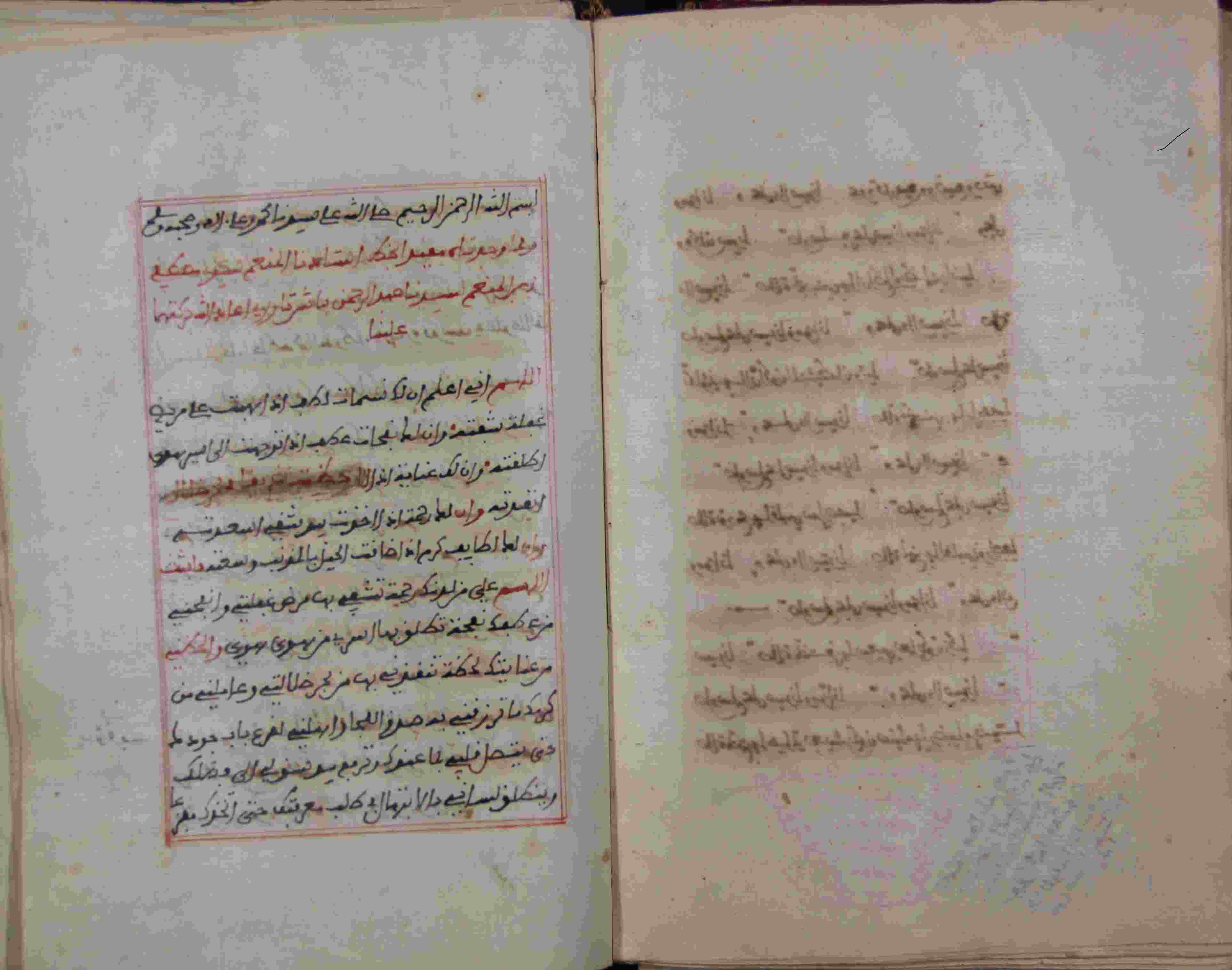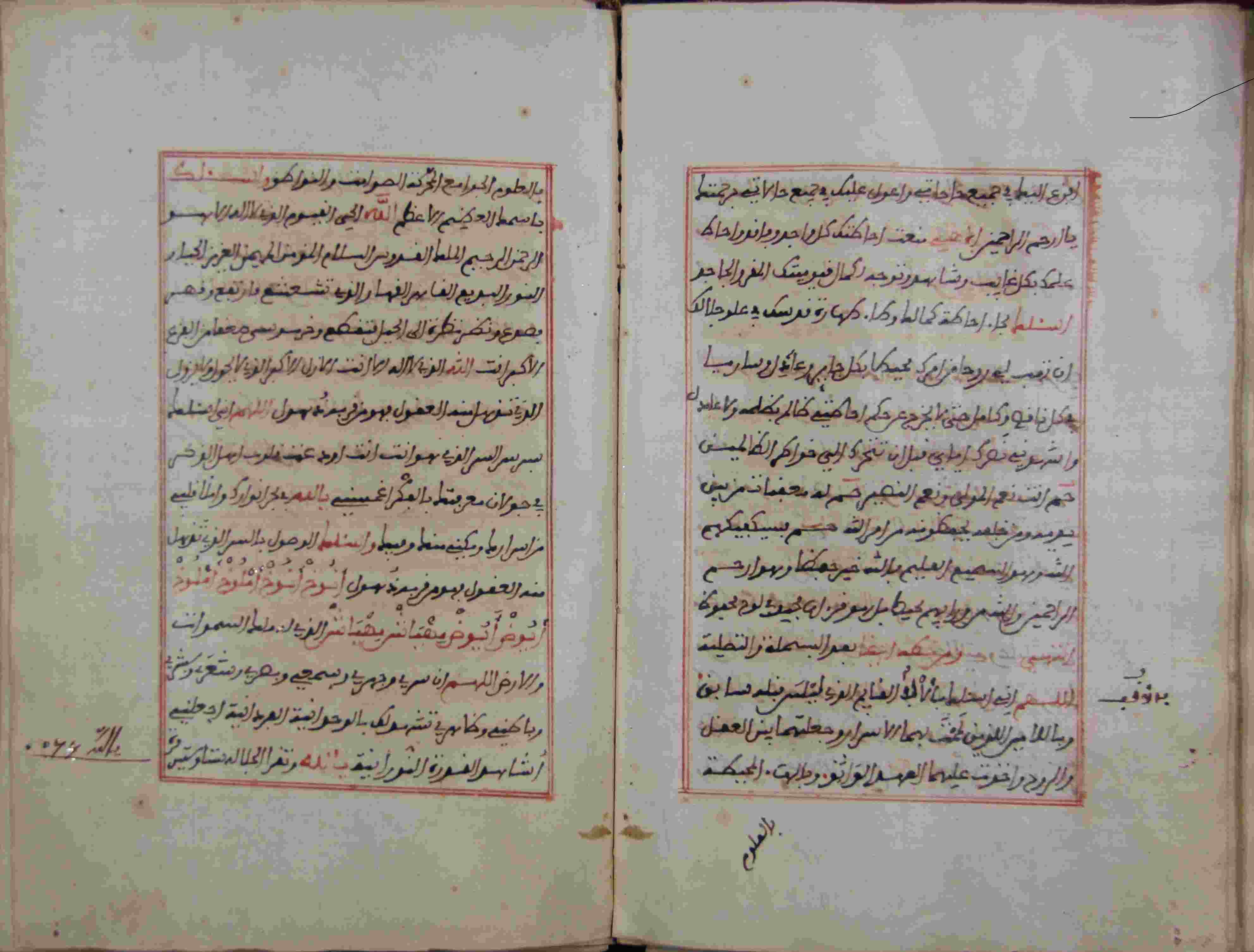 Description: أوله : " اللهم إني أعلم أن لك نسمات لطف..."/آخره : " واكشف عن بصيرتي ولا حول ولا قوة إلا بالله العلي العظيم "، نوع الخط مغربي، التجليد مزخرف، حالة المخطوط جيدة، الكتابة واضحة في إطار بالأحمر، انتهى نسخه آخر يوم من ثاني الربيعين 1231هـ.، تمت مقابلة هذه النسخة على يد محمد لفكون في الليلة التاسعة من شوال عام 1231هـ.، عدد الأوراق الخاصة به ورقتين، بداية المخطوط في الورقة 80، نهاية المخطوط في الورقة 82، المخطوط مرقمن، رقم المخطوط 2.3 /884 م، مصدر المخطوط : زاوية الشيخ الحسين سيدي خليفة (ميلة).