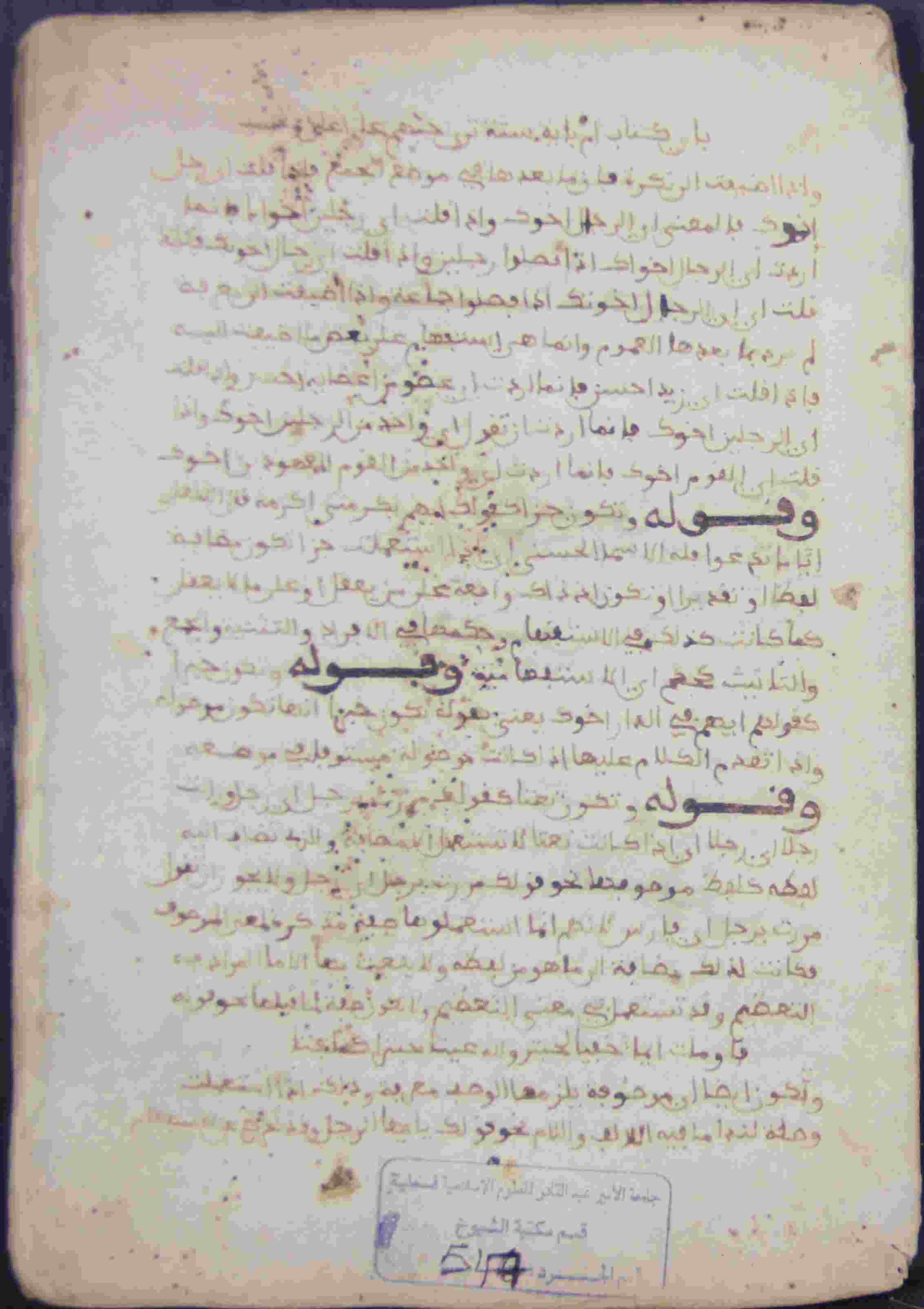 | Description: | أوله : " مبتور الأول...بأي كتاب أم بأية ستة ترى حبهم..."/آخره : " مبتور الآخر...في الثاني ليس إلا نحو قولك أضرب بكرا "، نوع الخط مغربي، التجليد مزخرف، حالة المخطوط متوسطة، بداية المخطوط في الورقة الأولى، نهاية المخطوط في الورقة 72، المخطوط مرقمن، رقم المخطوط 547 م، مصدر المخطوط : مكتبة الشيخ نعيم النعيمي . |