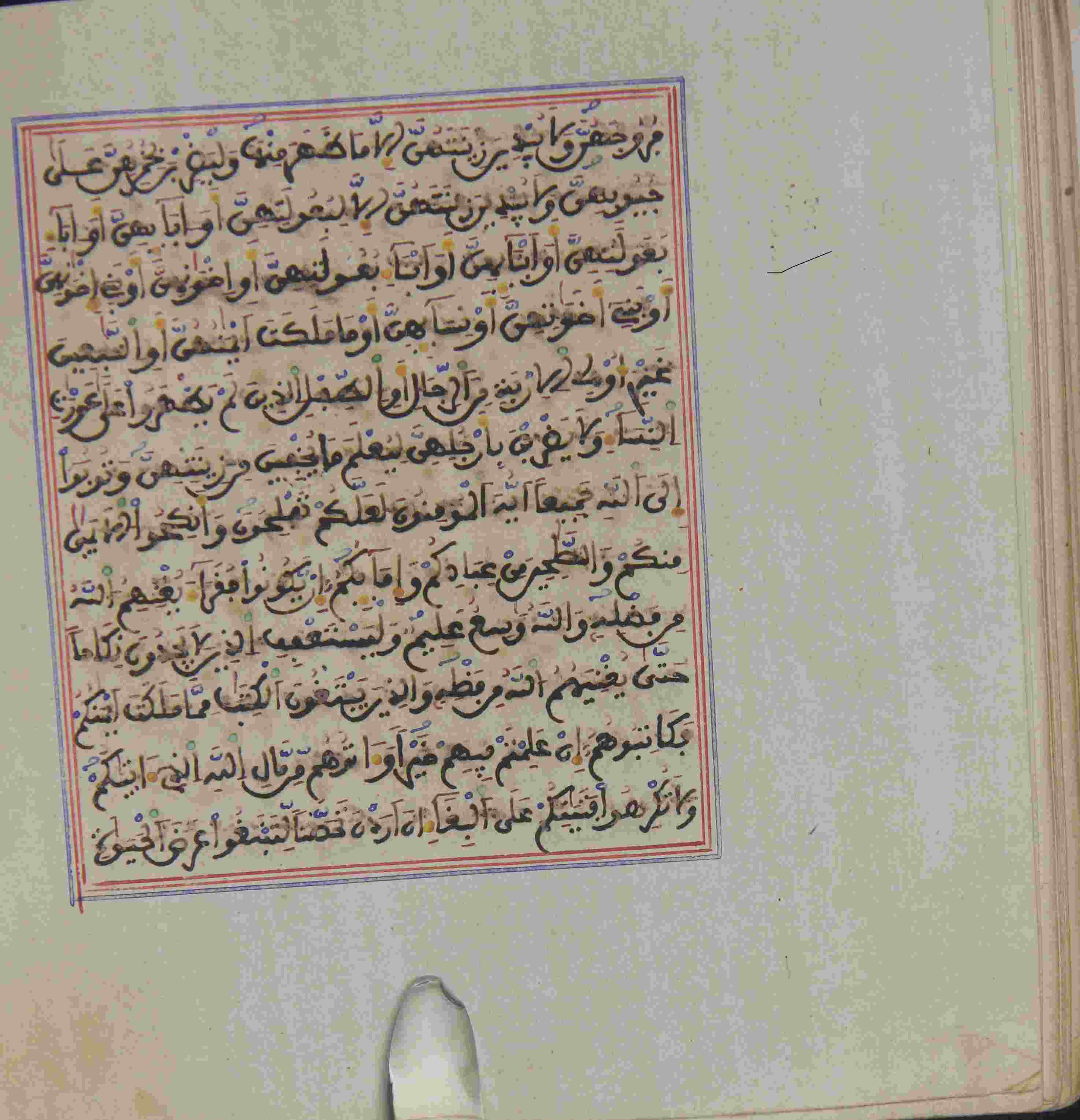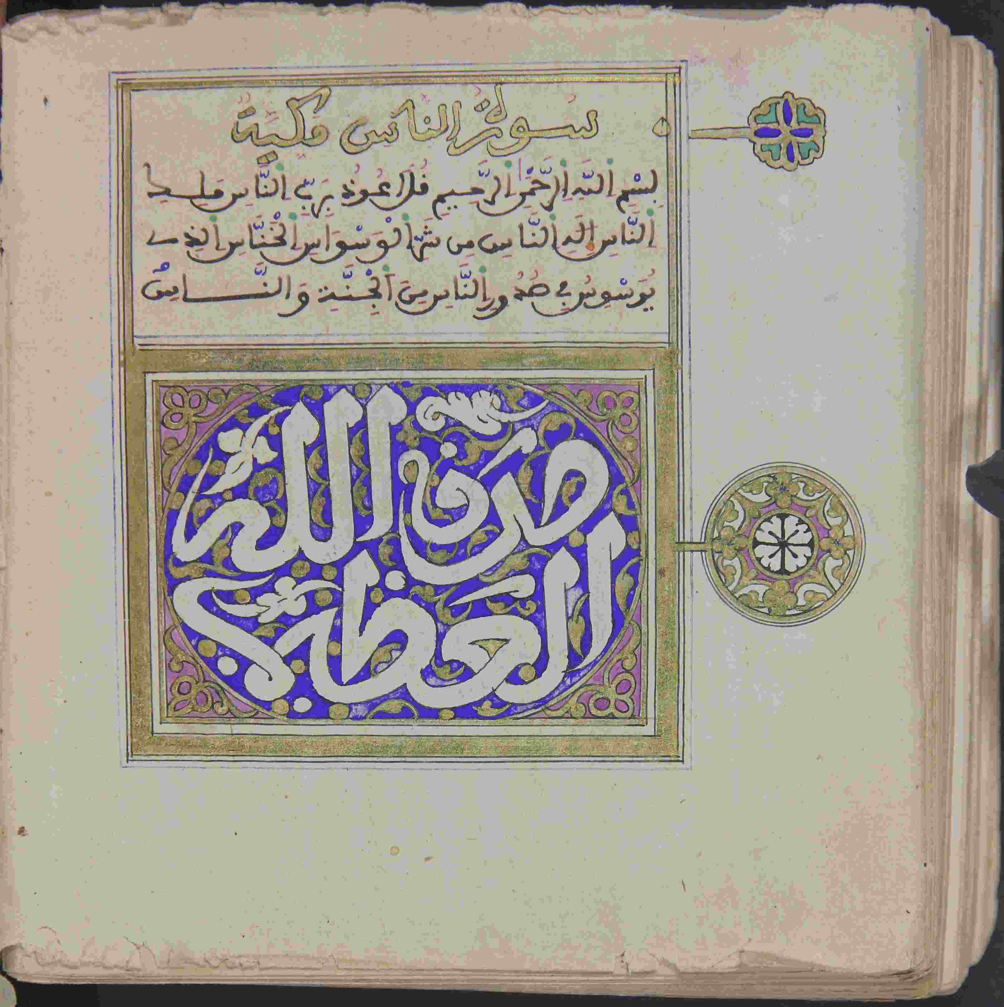Description: أوله : " سورة الفاتحة..."/ آخره : " سورة الناس "، نوع الخط مغربي، التجليد مزخرف ومذهب، حالة المخطوط حسنة، عبارة عن مصحف جيبي، السور مكتوبة في إطار ملون، بداية المخطوط في الورقة السابعة، نهاية المخطوط في الورقة 313، المخطوط مرقمن، رقم المخطوط 781 م، مصدر المخطوط : زاوية الشيخ الحسين سيدي خليفة (ميلة).